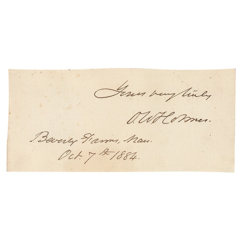 Crisp ink signature, "Yours very truly, O. W. Holmes, Beverly Farms, Mass., Oct. 7th, 1884,” on an off-white 5 x 2.25 slip. In fine condition.