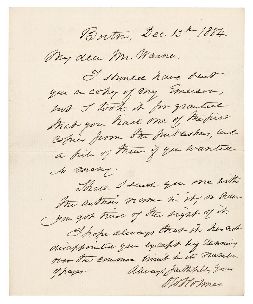 ALS signed "O. W. Holmes," one page, 4.75 x 6, December 13, 1884. Handwritten letter to writer and editor Charles Dudley Warner, best remembered as the co-author of The Gilded Age with Mark Twain. In full: "I should have sent you a copy of my Emerson, but I took it for granted that you had one of the first copies from the publishers, and a pile of them if you wanted so many. Shall I send you one with the author's name in it, or have you got tired of the sight of it." In fine condition. Warner served as editor for Houghton Mifflin's 'American Men of Letters' series of biographies. Holmes contributed the volume on the great transcendentalist Ralph Waldo Emerson, published in 1885.