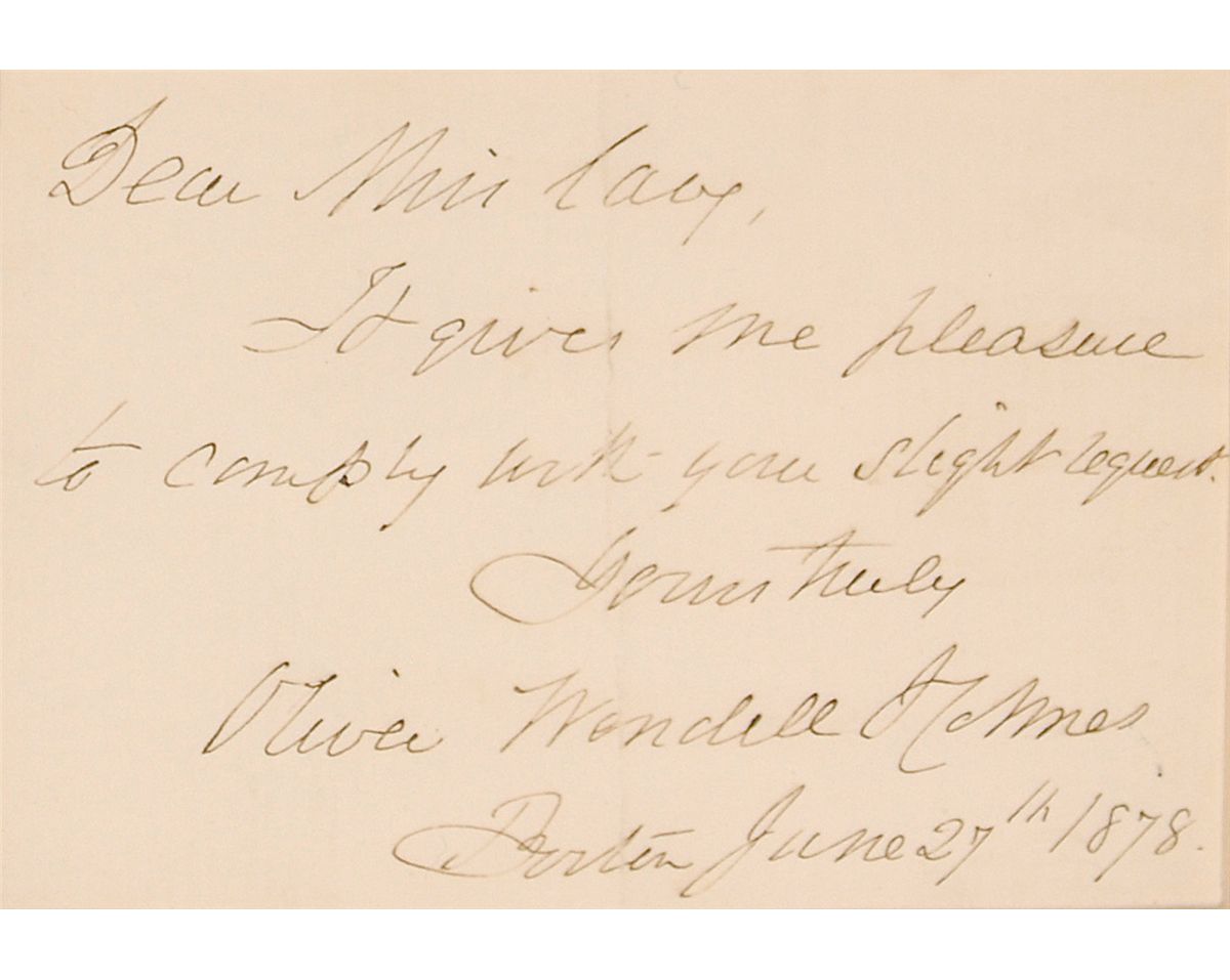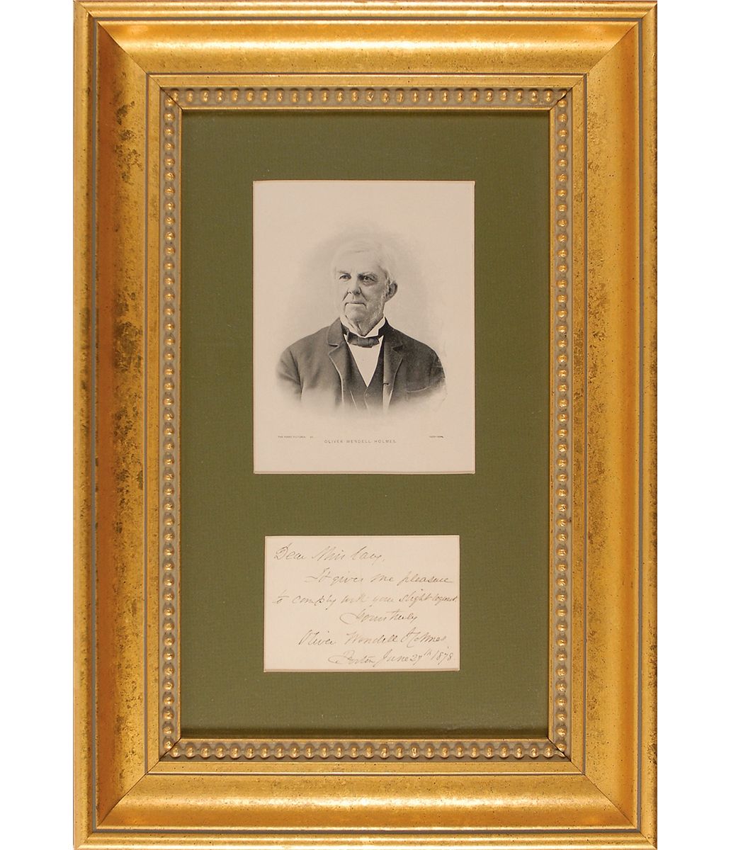 ALS signed “Oliver Wendell Holmes,” one page, 4.25 x 3, June 27, 1878. A short response to a gentleman. In full: “It gives me pleasure to comply with your slight request.” Matted and framed with a portrait of Holmes to an overall size of 13.25 x 19. In fine condition, with a central vertical fold affecting a single letter of the signature.