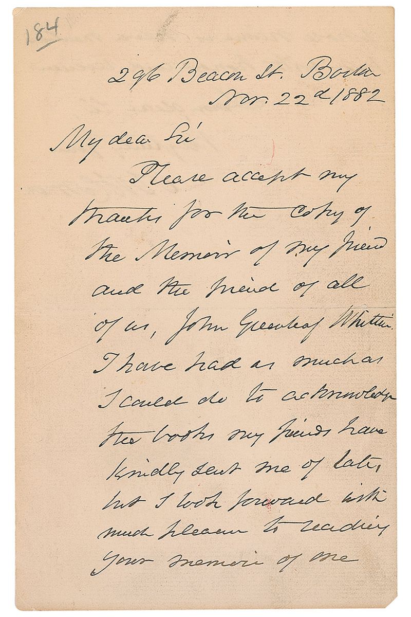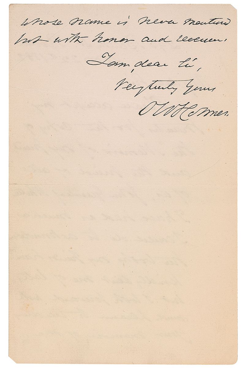 ALS signed “O. W. Holmes,” one page, 4.5 x 7, Boston, November 22, 1882. Letter to a gentleman. In part: “Please accept my thanks for the copy of the Memoir of my friend and the friend of all of us, John Greenleaf Whittier. I have had as much as I could do to acknowledge the books my friends have kindly sent me of late, but I look forward with much pleasure to reading your memoir of one whose name is never mentioned but with honor.” Scattered creases and soiling, otherwise fine condition.