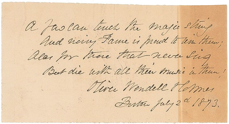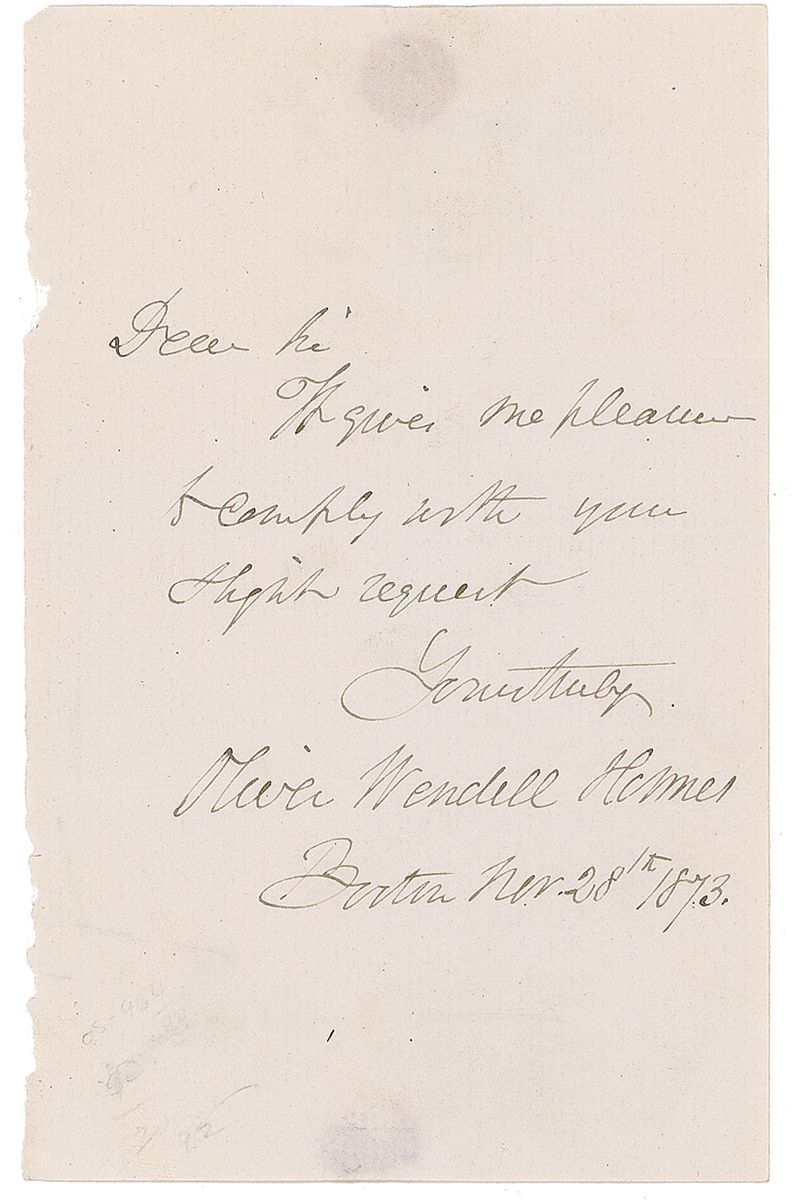 Two items: ALS, one page, 4 x 6, November 28, 1873. Brief letter complying with a signature request. In full: “It gives me pleasure to comply with your slight request.”; and an AQS, signed “Oliver Wendell Holmes, Boston, July 2d 1873,” on an off-white 5 x 2.5 vertically lined slip. In full: “A few can touch the magic string, and noisy fame is proud to win them: Alas for those that never sing, but die with all their music in them!” In very good condition, with scattered creasing and toning to both.