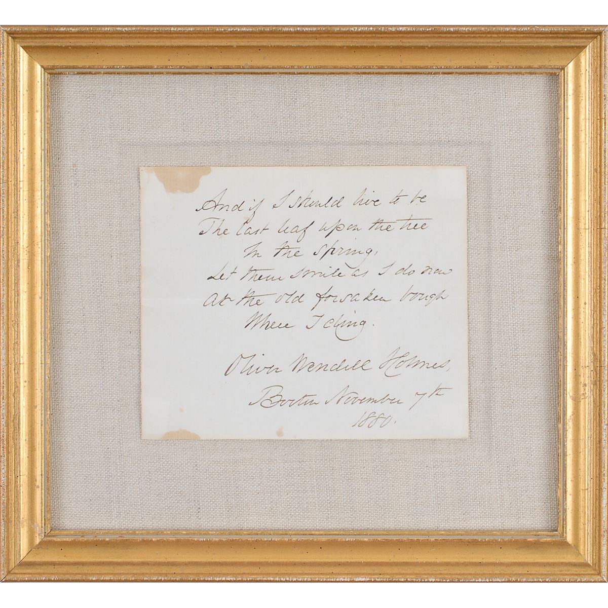 AQS on an off-white 5 x 4 sheet, signed at the conclusion in crisp ink, “Oliver Wendell Holmes, Boston, November 7th 1880.” Holmes pens the last lines of his oft-anthologized poem ‘The Last Leaf.’ In full: “And if I should live to be / The last leaf upon the tree / In the spring, / Let them smile, as I do now, / At the old forsaken bough / Where I cling.” Mounted, cloth-matted, and framed to an overall size of 9 x 8.5. A central horizontal fold passing through one line and two areas of dampstaining to the left side, otherwise fine condition.