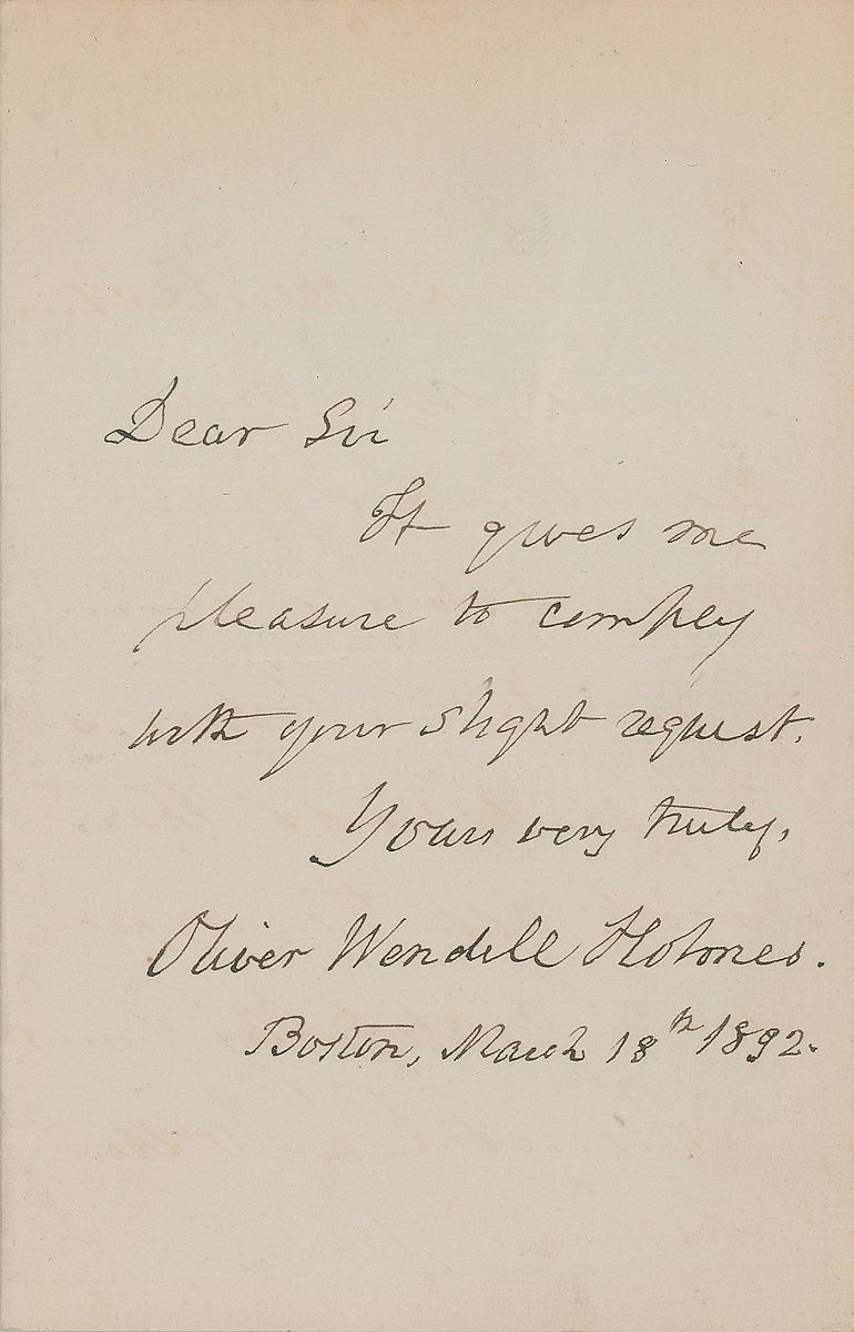 ALS signed “Oliver Wendell Holmes,” one page, 3.75 x 6, March 18, 1892. In full: “It gives me pleasure to comply with your slight request.” Encapsulated in a plastic PSA/DNA authentication holder. In fine condition.