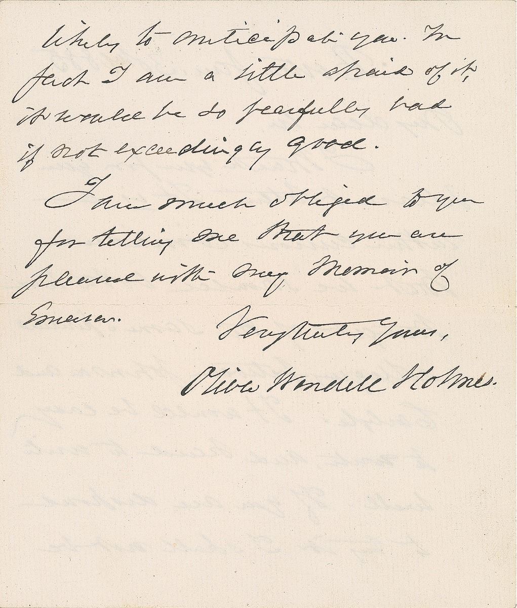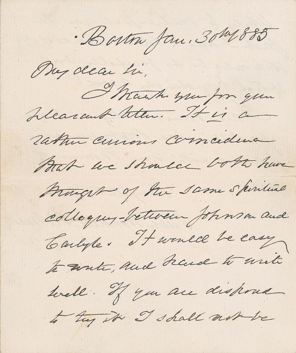 ALS signed “Oliver Wendell Holmes,” one page both sides, 4.75 x 6, January 30, 1885. In part: “I thank you for your pleasant letter. It is a rather curious coincidence that we should both have thought of the same spiritual colloquy—between Johnson and Carlyle. It would be easy to write, and hard to write well…I am much obliged to you for telling me that you are pleased with my memoir of Emerson.” In fine condition.
