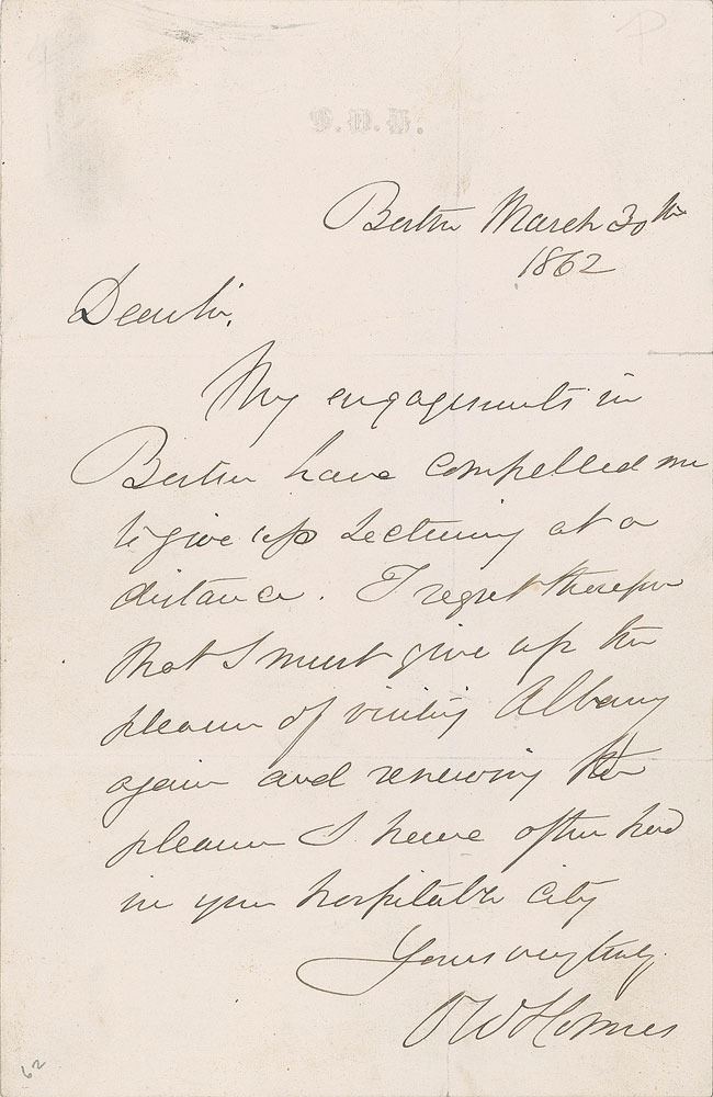 Civil War-dated ALS signed “O. W. Holmes,” one page, 4.5 x 7, personal letterhead, March 30, 1862. In full: "My engagements in Boston have compelled me to give up lecturing at a distance. I regret therefore that I must give up the pleasure of visiting Albany again and renewing the pleasure I have often had in your hospitable city." In fine condition, with intersecting folds and some soiling to the upper left corner.