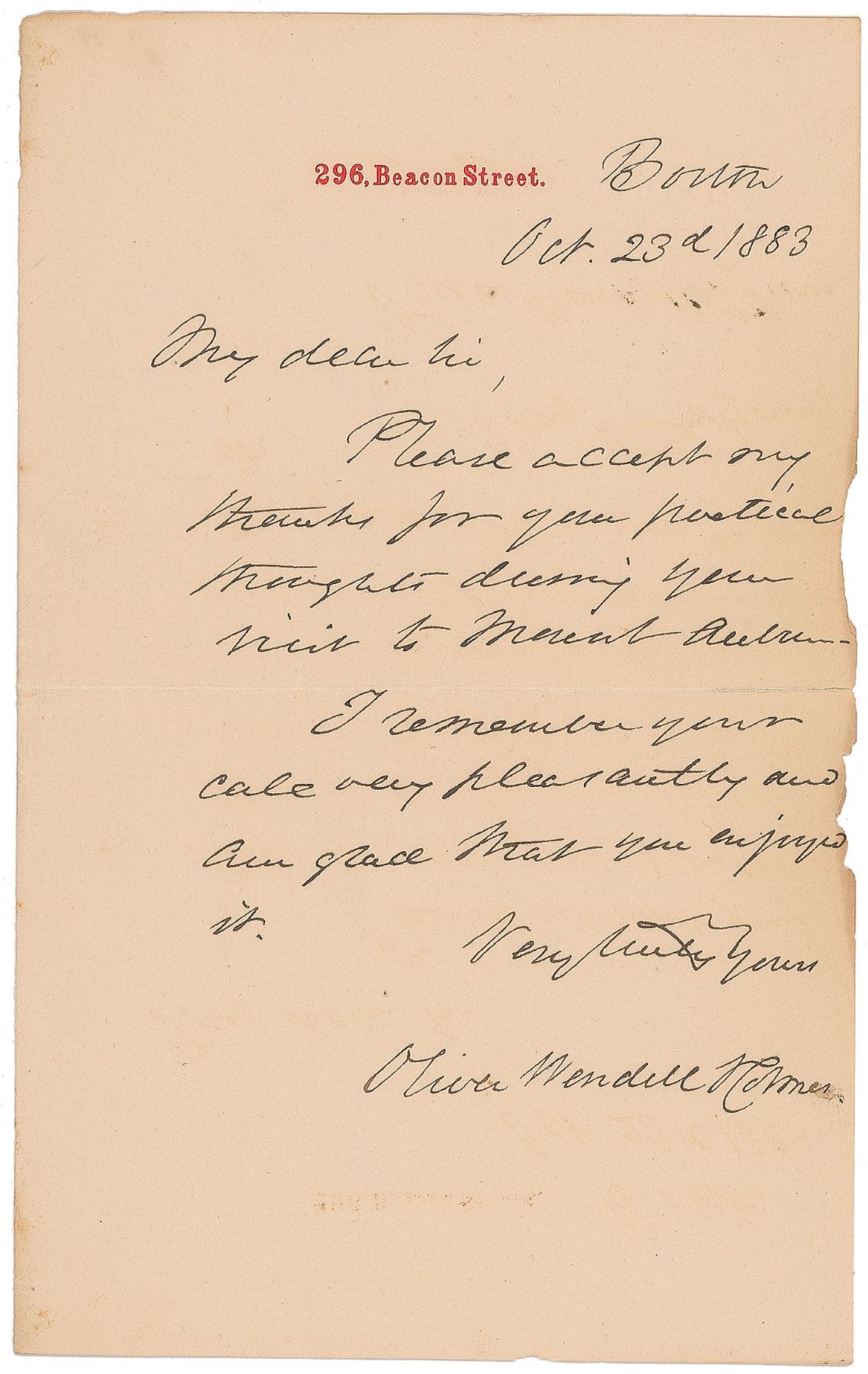 ALS signed “Oliver Wendell Holmes,” one page, 4.25 x 7, 296 Beacon Street letterhead, October 23, 1883. In full: "Please accept my thanks for your poetical thoughts during your visit to Mount Auburn. I remember your call very pleasantly and am glad that you enjoyed it." In fine condition, with a slightly rough right edge.
