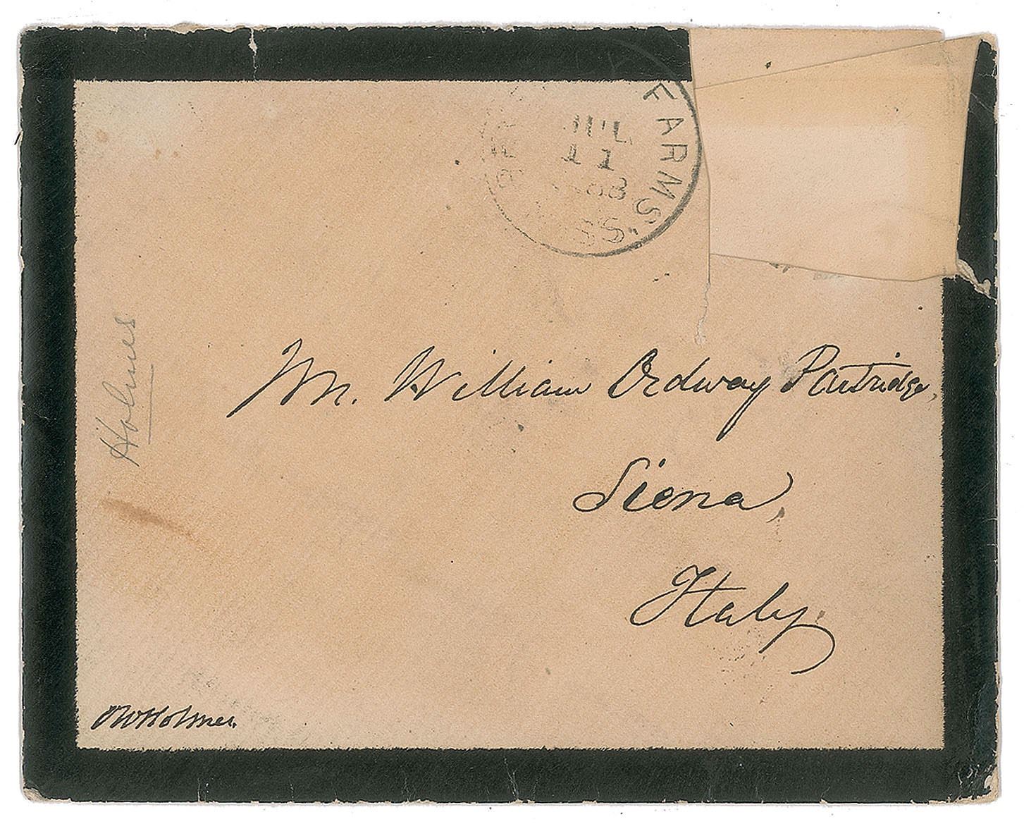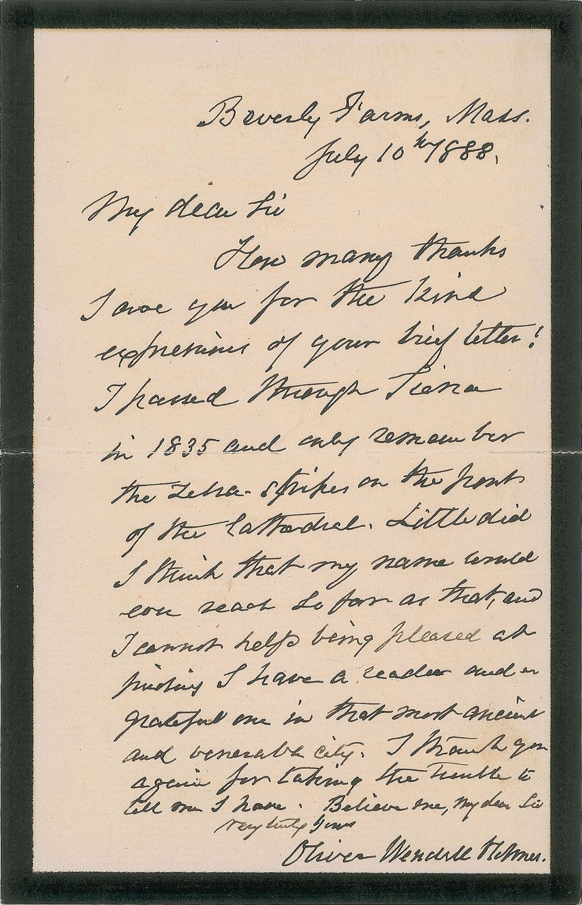 ALS signed “Oliver Wendell Holmes,” one black-bordered page, 4.5 x 7, July 10, 1888. Written from Beverly Farms, a letter to William Ordway Partridge, in full: "How many thanks I owe you for the kind expressions of your brief letter! I passed through Siena in 1835 and only remember the Zebra–stripes on the front of the cathedral. Little did I think that my name would ever reach so far as that, and I cannot help being pleased at finding I have a reader and a grateful one in that most ancient and venerable city. I thank you again for taking the trouble to tell me I have." In fine condition. Accompanied by the original mailing envelope, which Holmes has addressed in his own hand and signed in the lower left corner, "O. W. Holmes."