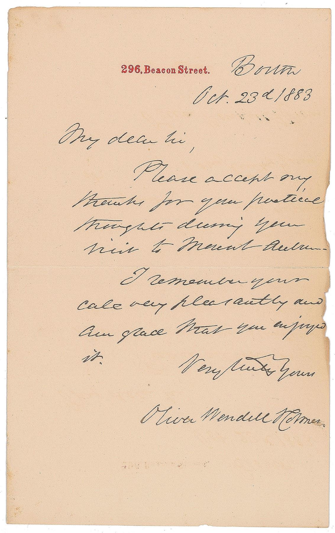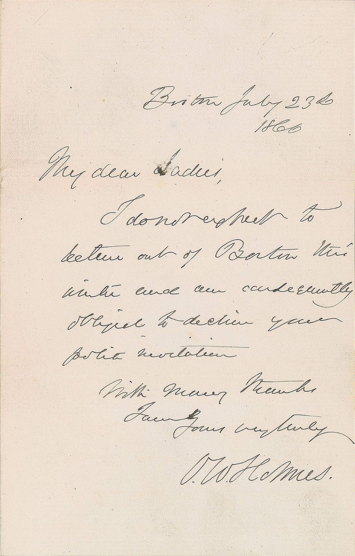 Two ALSs, signed "O. W. Holmes" and "Oliver Wendell Holmes," both one page, approximately 4.25 x 7, dated July 23, 1866, and October 23, 1883. The earlier letter, in full: "I do not expect to lecture out of Boston this winter and am consequently obliged to decline your polite invitation." The second letter, in full: "Please accept my thanks for your positive thoughts during your visit to Mount Auburn. I remember your call very pleasantly and am glad that you enjoyed it." In overall very good to fine condition, with a rough right edge, and split fold, to the later letter.