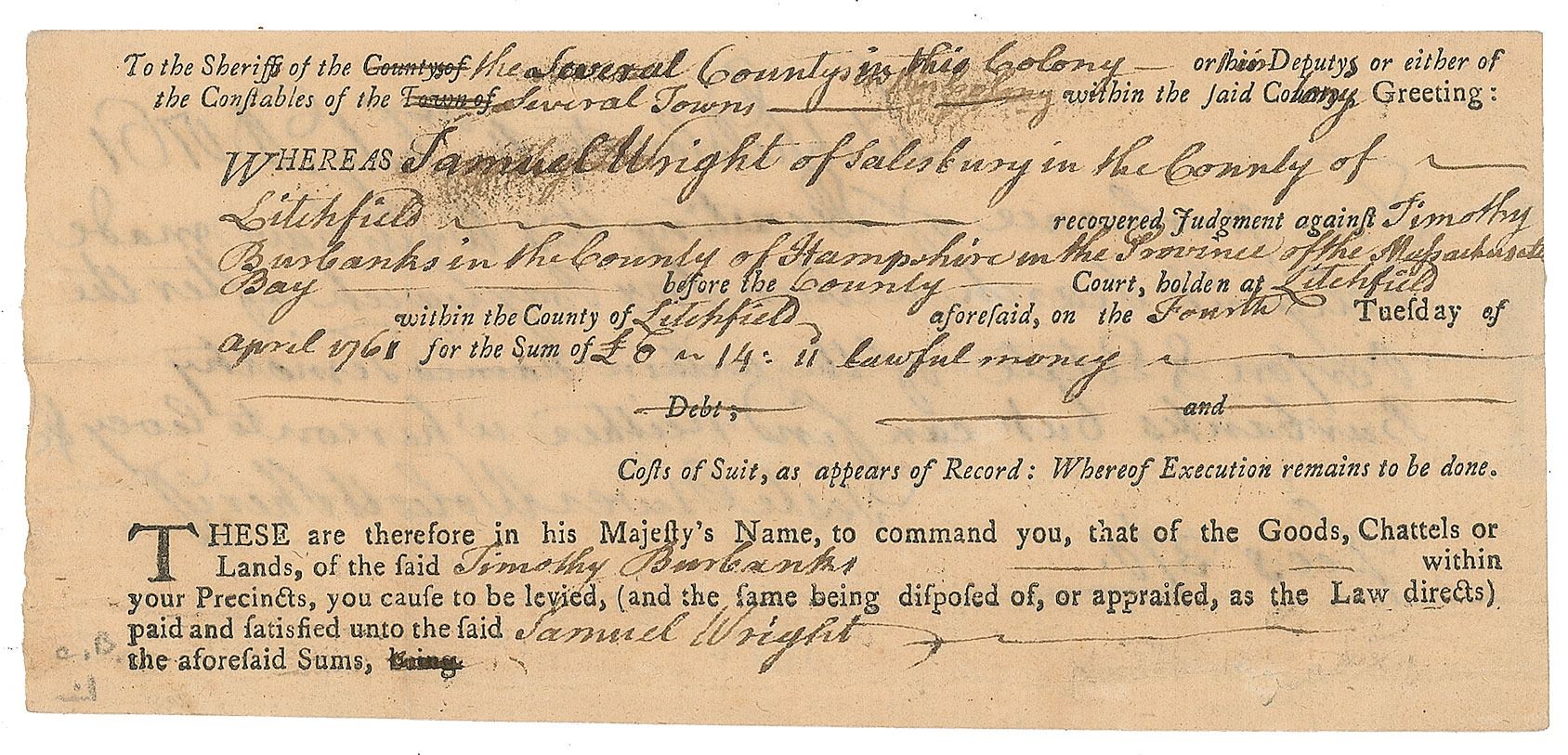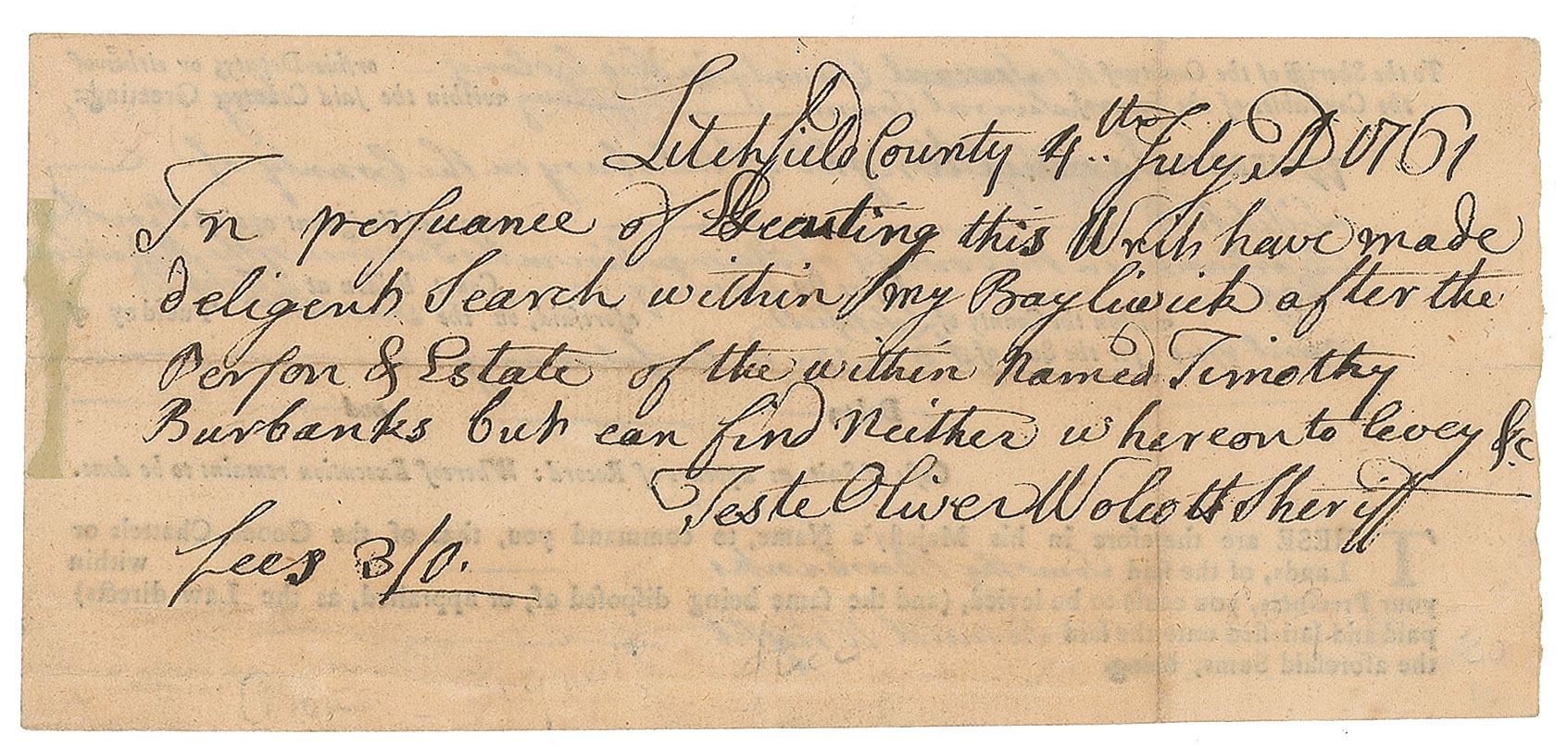 ADS signed "Teste. Oliver Wolcott Sheriff," one page, 6.25 x 2.75, July 4, 1761. Litchfield County legal document relating to a judgment between Samuel Wright and Timothy Burbanks, in full: "In pursuance of Executing this Writ have made deligent Search within my Bayliwick after the Person & Estate of the within named Timothy Burbanks but can find neither whereon to levey etc." Signed at the conclusion by Wolcott. In fine condition, with intersecting folds, and a bit of adhesive residue to the left edge.