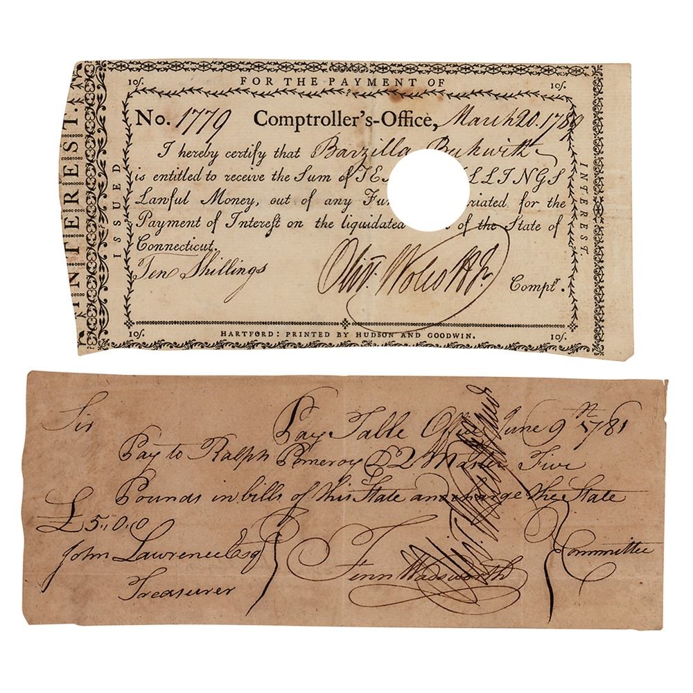 Two documents: a Revolutionary War–dated manuscript DS, signed "Oliv. Wolcott Jr.," one page, 7.75 x 3, June 9, 1781, being a Pay-Table Office document ordering the disbursement of five pounds to Quartermaster Ralph Pomeroy, countersigned by Finn Wadsworth and endorsed on the reverse by Pomeroy; and a partly-printed DS, signed "Oliv: Wolcott, Jr.," one page, 7 x 3.5, March 20, 1789, being a Comptroller's Office note for the payment of ten shillings. In overall fine condition.