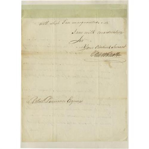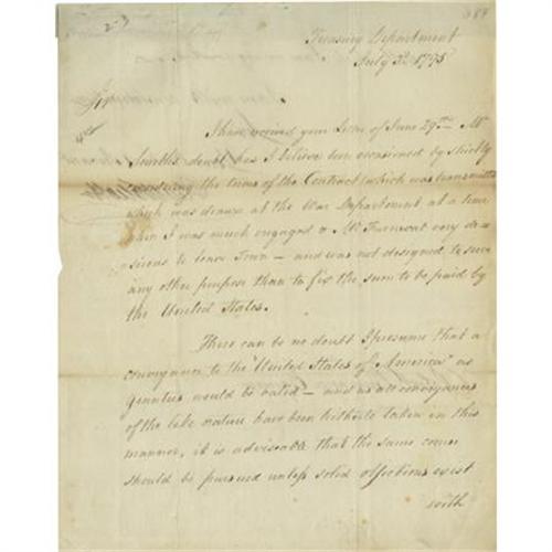 <B>Oliver Wolcott, Jr. Letter Signed As United States Treasurer</B></I> “<I>Oliv. Wolcott</B></I>”. One page, 7.75” x 10”, Washington , July 3, 1795, to Robert Purviance, collector of customs, <B>altimore . Wolcott writes of a contract drawn up at the War Department: “<I>There can be no doubt I presume that a conveyance to the “United States of America” as grantees would be valid - and as all conveyances of the like nature have been hitherto taken in this manner, it is advisable that the same course should be pursued unless solid objections exist with which I am not acquainted.</B></I>” The letter has been taped by the top margin into a paper folder. The letter exhibits some toning at the folds, else is in very good condition. <I>Ex. Henry E. Luhrs Collection</B></I>.<BR><BR><BR><b>Shipping:</b> Flat Material, Small (<a target="_blank" href="http://www.heritageauctions.com/common/shipping.php">view shipping information</a>)