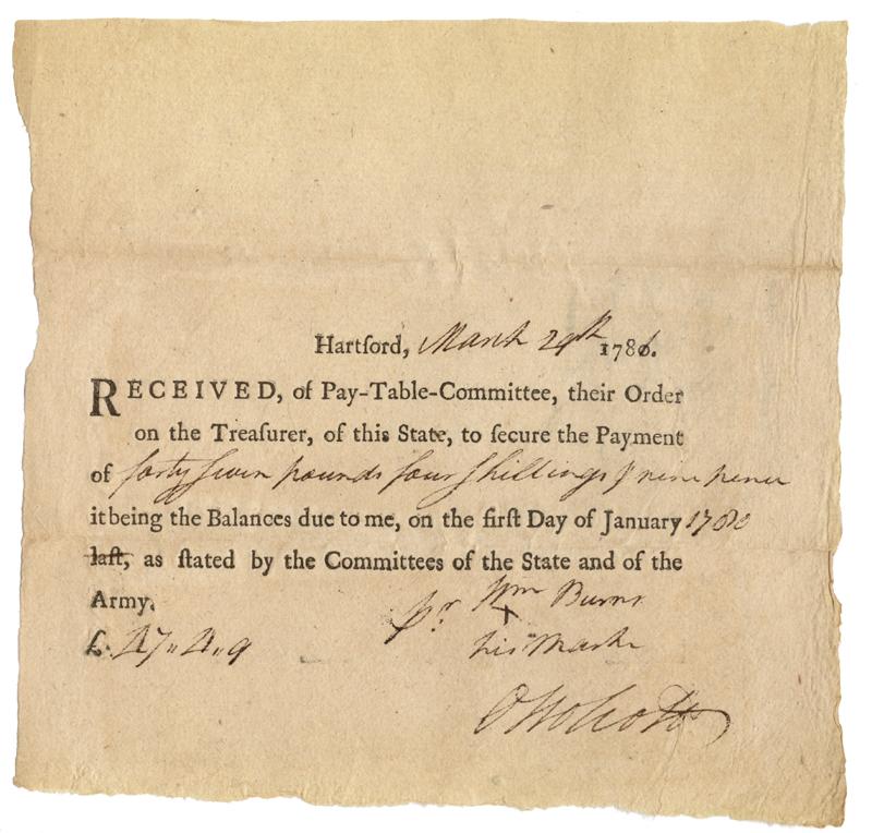 [AMERICAN REVOLUTION – OLIVER WOLCOTT, JR.]. Oliver Wolcott, Jr. (1760-1833). Secretary of the Treasury under Washington and Adams; Governor of Connecticut. Wolcott Jr., Son of a Signer of the Declaration of Independence, served faithfully and superbly under Alexander Hamilton, and was instrumental in developing a plan for the establishment of branches of the Bank of the United States, established in 1791. DS. 1 page. 7” x 7”. Partly-printed Pay-Table Committee order to pay to William Burns “the payment of forty seven pounds four shillings and nine pence it being the balance due to me, on the first day of January 1780 last, as stated by the Committee of the State and of the Army.” Wolcott has written out and signed the lower portion of the document where William Burns has affixed his mark. Excellent condition.