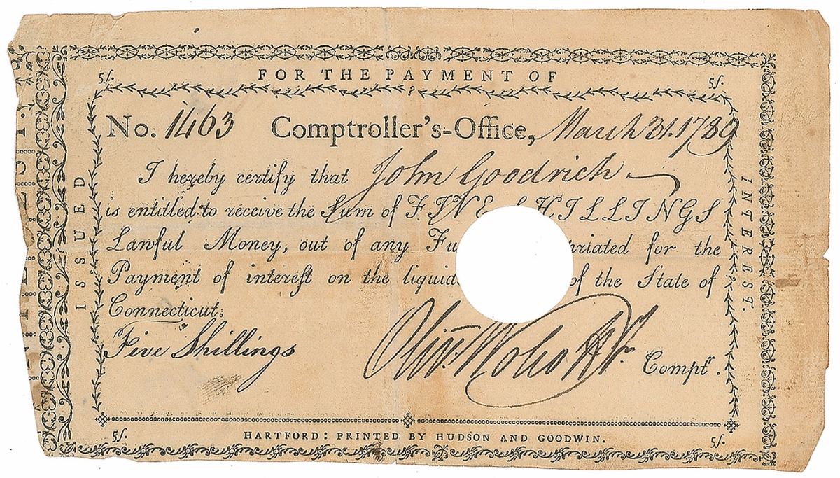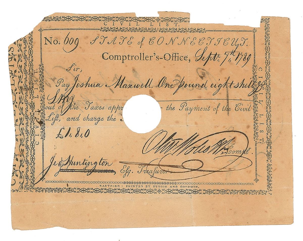 Two documents signed "Oliv: Wolcott, Jr.," including: a pay order from the Comptroller's Office, one page, 7 x 5.25, September 7, 1789, directing Joshua Maxwell to be paid "One pound eight shillings," countersigned by Jedediah Huntington; and a pay order from the Comptroller's Office, one page, 6.75 x 3.75, March 31, 1789, directing John Goodrich to receive the sum of "Five Shillings." In overall very good to fine condition, with splitting to folds and scattered toning.