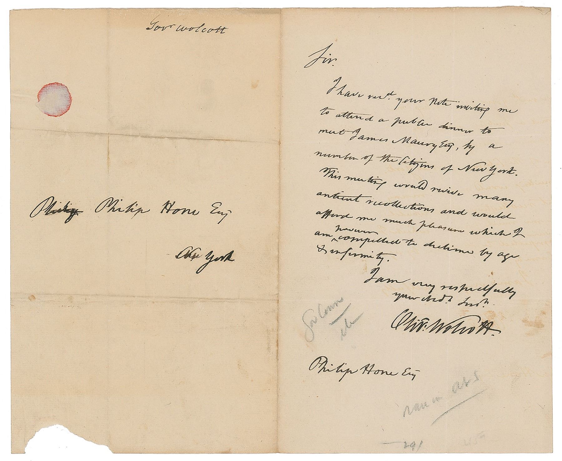 American politician (1760–1833) who succeeded Alexander Hamilton as Secretary of the Treasury under Washington and Adams, and went on to serve as governor of Connecticut. ALS signed “Oliv: Wolcott,” one page, 5 x 8, no date. Letter to Philip Hone, in part: "I have rec'd your note inviting me to attend a public dinner to meet James Maury Esq, by a number of the Citizens of New York. This meeting would revive many ancient recollections and would afford me much pleasure which I am however compelled to decline by age & infirmity." In fine condition, with a few light stains in the signature area.