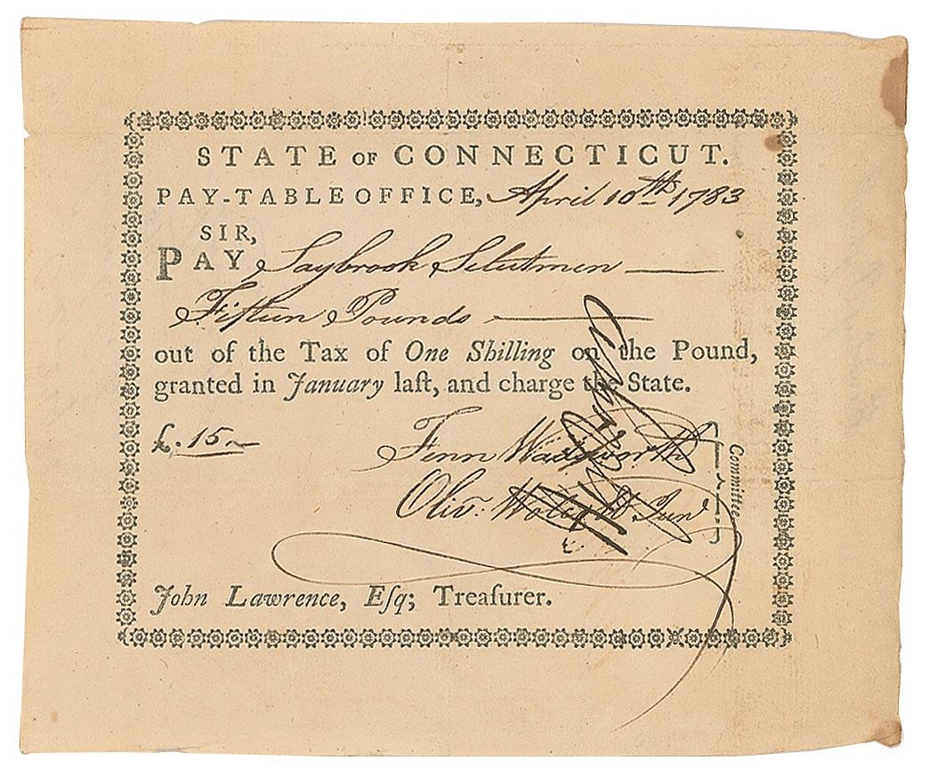 Partly-printed DS, signed "Oliv: Wolcott Jun," one page, 6.5 x 5.5, April 10, 1783. Connecticut interest pay table document issued to Saybrook Selectmen for fifteen pounds. Signed at the bottom by Wolcott as a committee member. In fine condition, with some light toning, and a stain to the upper right edge.