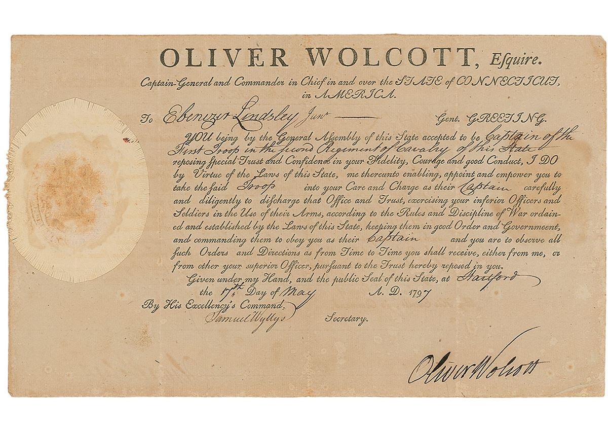 Signer of the Declaration of Independence from Connecticut who commanded troops in the defense of New York during the American Revolution (1726–1797). Partly-printed DS, one page, 13 x 7.75, May 17, 1797. As governor of Connecticut, Wolcott appoints Ebenezer Lindsley, Jr., as “Captain of the First Troop in the Second Regiment of Cavalry of this State.” Boldly signed at the conclusion by Wolcott and countersigned by Samuel Wyllys as secretary. The embossed paper seal affixed to the left side remains mostly intact. In very good condition, with three vertical folds (one vertical fold passing through a single letter of the signature), and scattered toning and soiling. Accompanied by an unsigned engraved portrait.