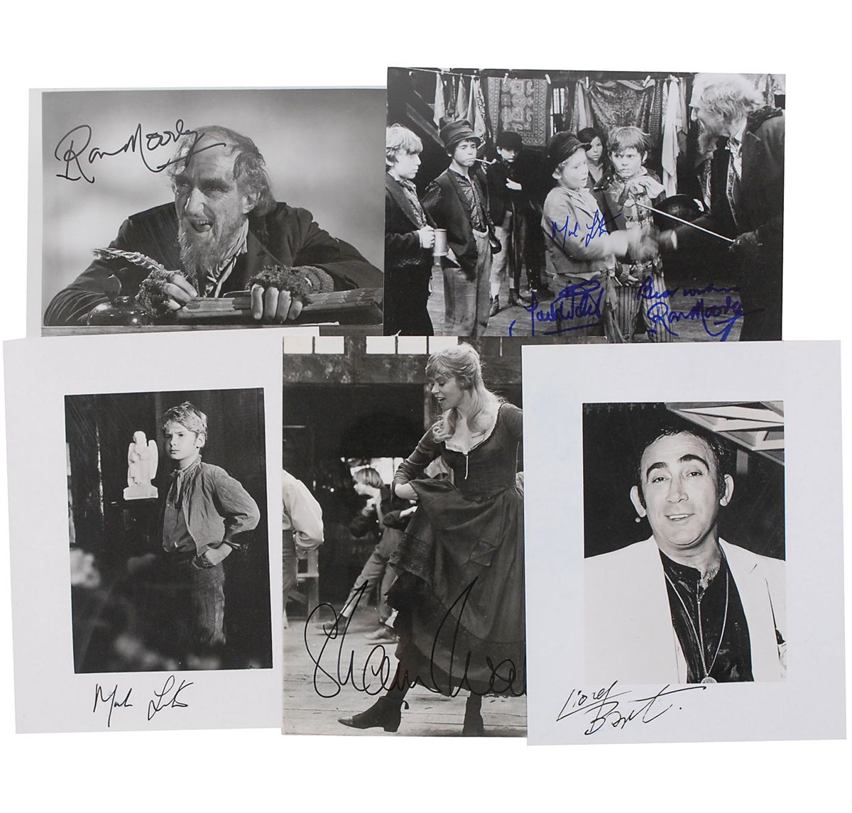 Five glossy photos of scenes and characters from the 1968 musical drama Oliver!, 8 x 10 and 10 x 8, each signed in ink by the actor or crew member pictured. Signers are: Mark Lester, Jack Wild, and Ron Moody; Ron Moody; Mark Lester; Shani Wallis; and Lionel Bart. In overall fine condition.