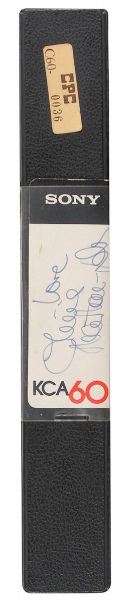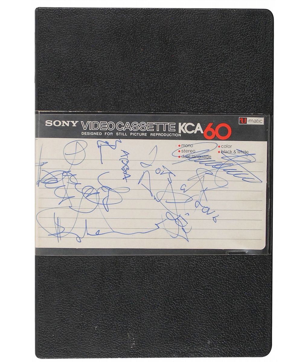 Color one-half inch tape videocassette of Newton-John’s 1978 ABC television variety show, signed on the case’s label in blue ink by Olivia Newton-John, Andy Gibb, Benny Andersson, Agnetha Faltskog, Frida Lyngstad, and Bjorn Ulvaeus. Tape runs 42:58 in time, and features the opening musical sequences from the show including a medley performance of ‘Dancing Queen,’ ‘Fernando,’ ‘Take a Chance on Me,’ ‘Hopelessly Devoted to You,’ and ‘I Just Want to Be Your Everything,’ featuring multiple camera angles, as well as the closing of the show (with a brief appearance by Alan Thicke) as well as couple of out-takes and bloopers. A CD of the tape is included. In fine condition.