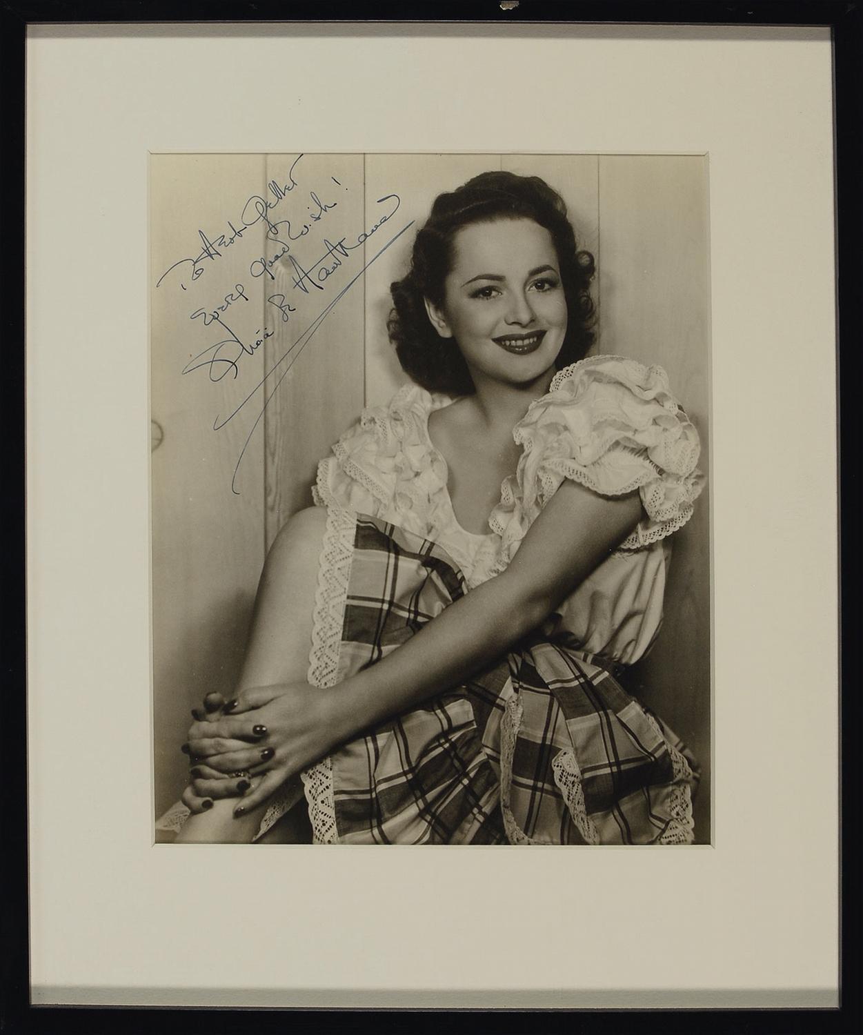 Pretty vintage matte-finish 8 x 10 photo, signed and inscribed in fountain pen “To Herb Geller, Every good wish, Olivia de Havilland.” Matted and framed to an overall size of 11.75 x 14. In fine condition, with a couple of light diagonal creases to upper right corner.