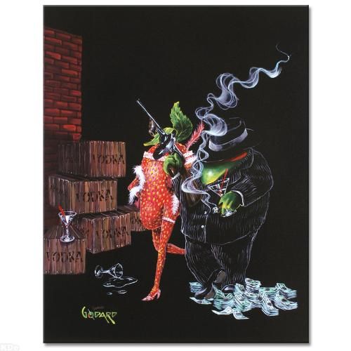 With unforgettable characters and undeniable charm, Michael Godard creates artworks that are sure to be the centerpiece of any room! "Ollie Capone" is a limited edition, heavily hand-embellished giclee on stretched canvas, numbered out of a mural edition and bears Godard's authorized signature! This piece comes gallery wrapped and ready to hang. Includes Certificate of Authenticity! Measures approx. 42" x 53" (image).
