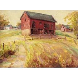 Ollie Cole (American, 20th century), “Red Barn”, c. 1950; oil/canvas, 12” x 16”, signed Cole worked in Illinois and Indiana. She studied at the Art Institute of Chicago and with Dorothy Franz at the Brown County Art Club.