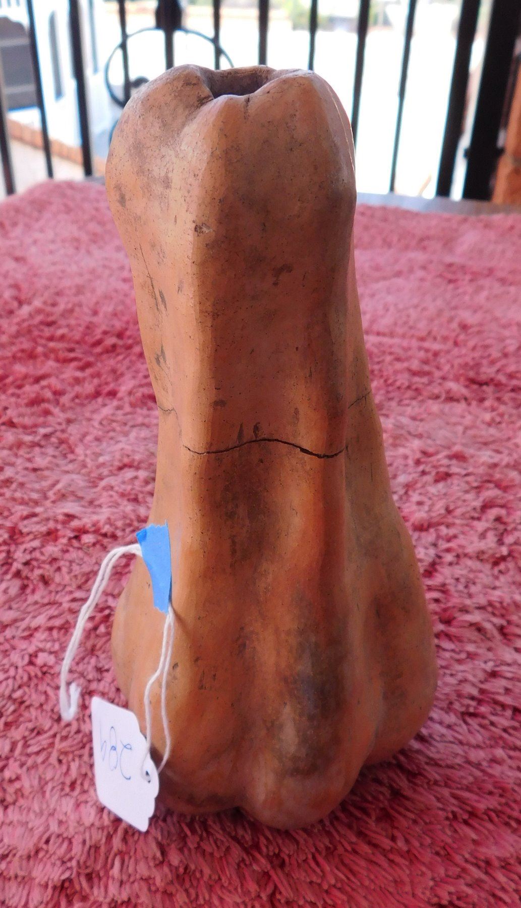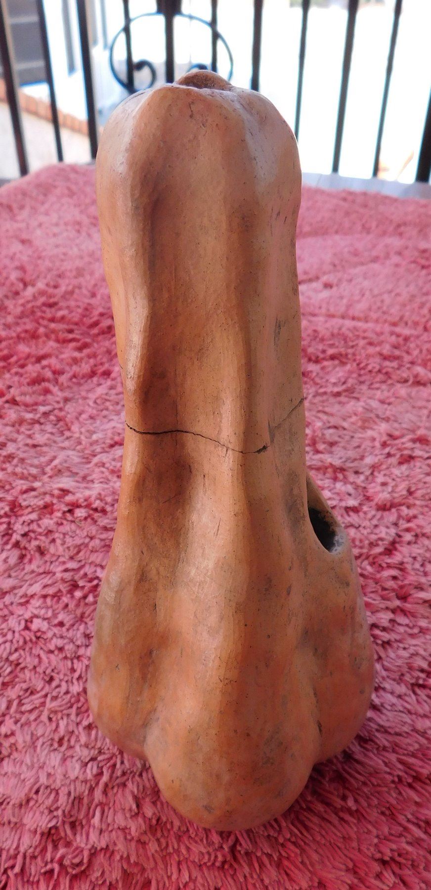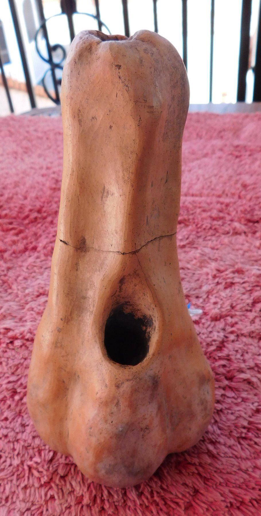 Olmec Clay Squash Pipe, pre-Columbian item. Made of clay, the item measures 4" x 7.5" x 3.5". Mexico. From an old, 1960s California collection. Condition: As found, cracked, see images. Shipping: $25.50 w/insurance and signature.