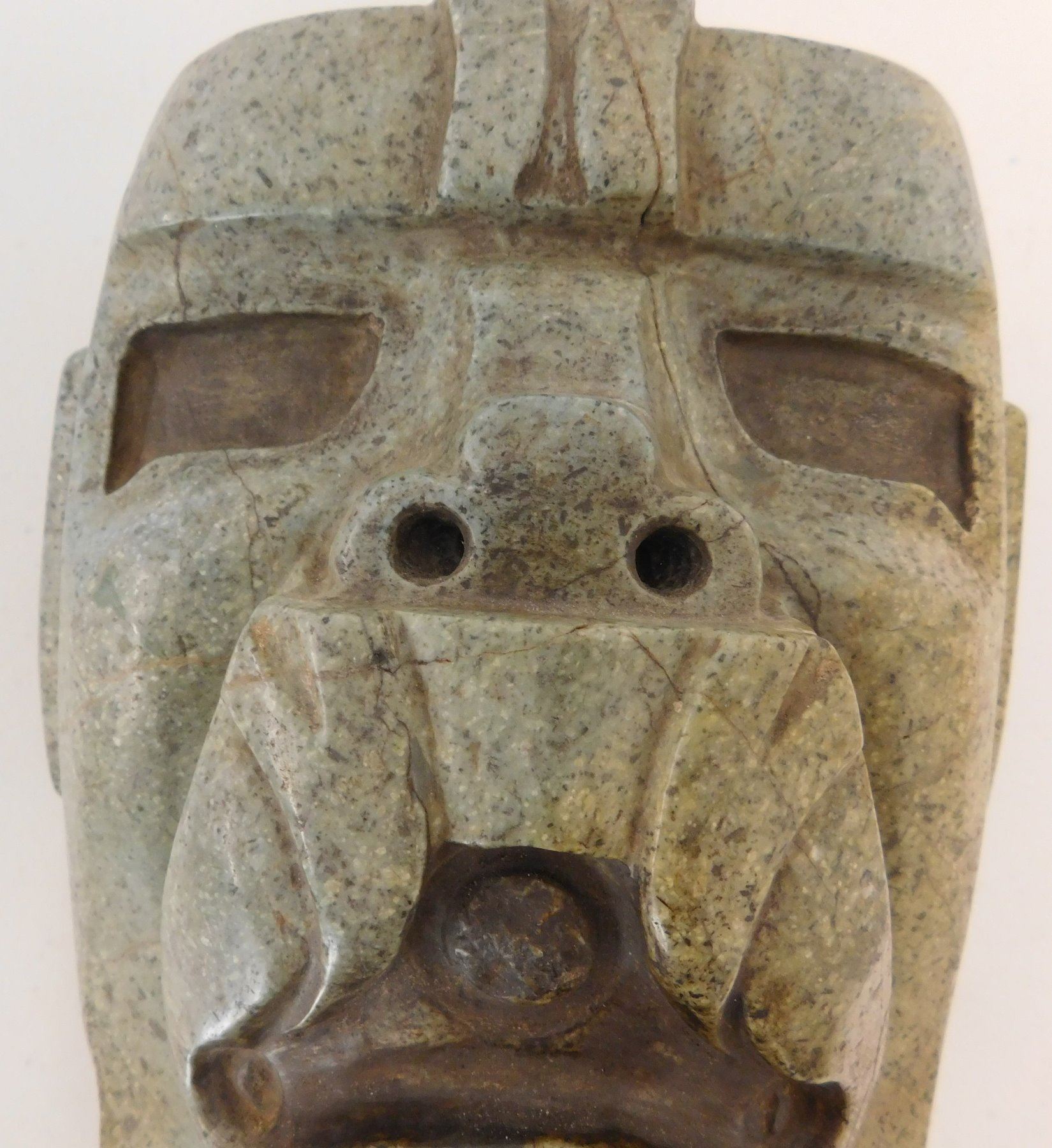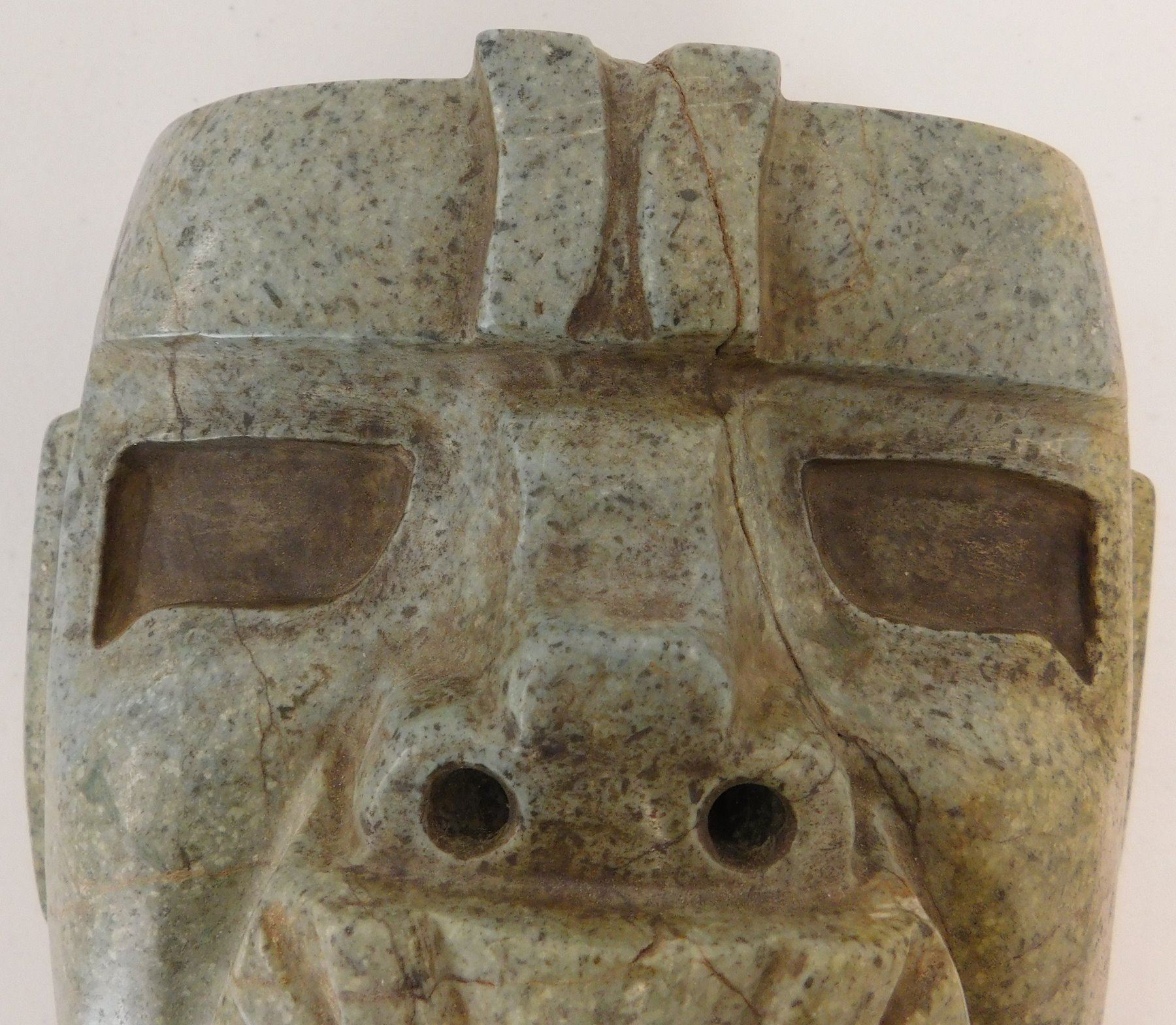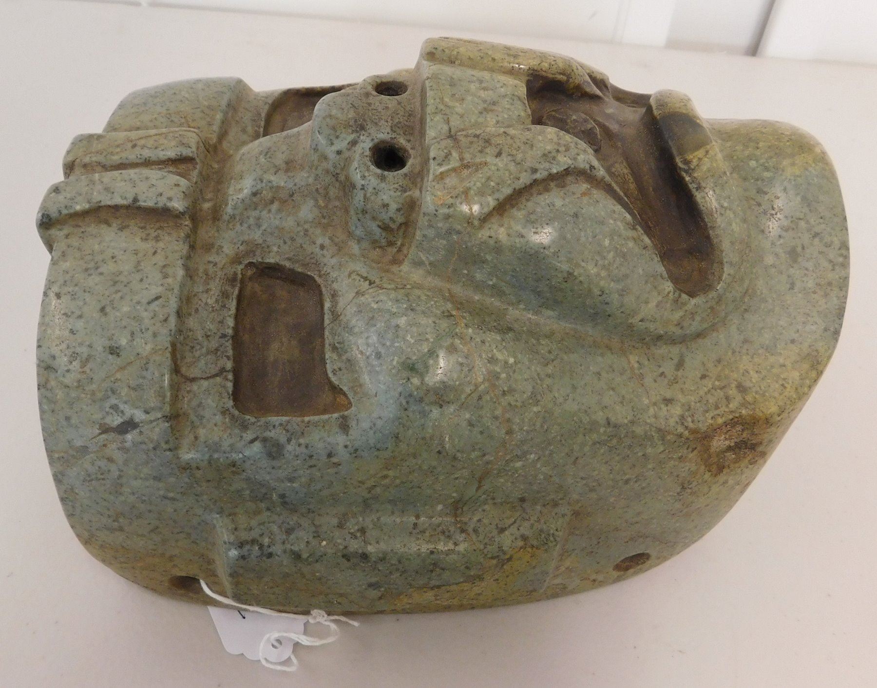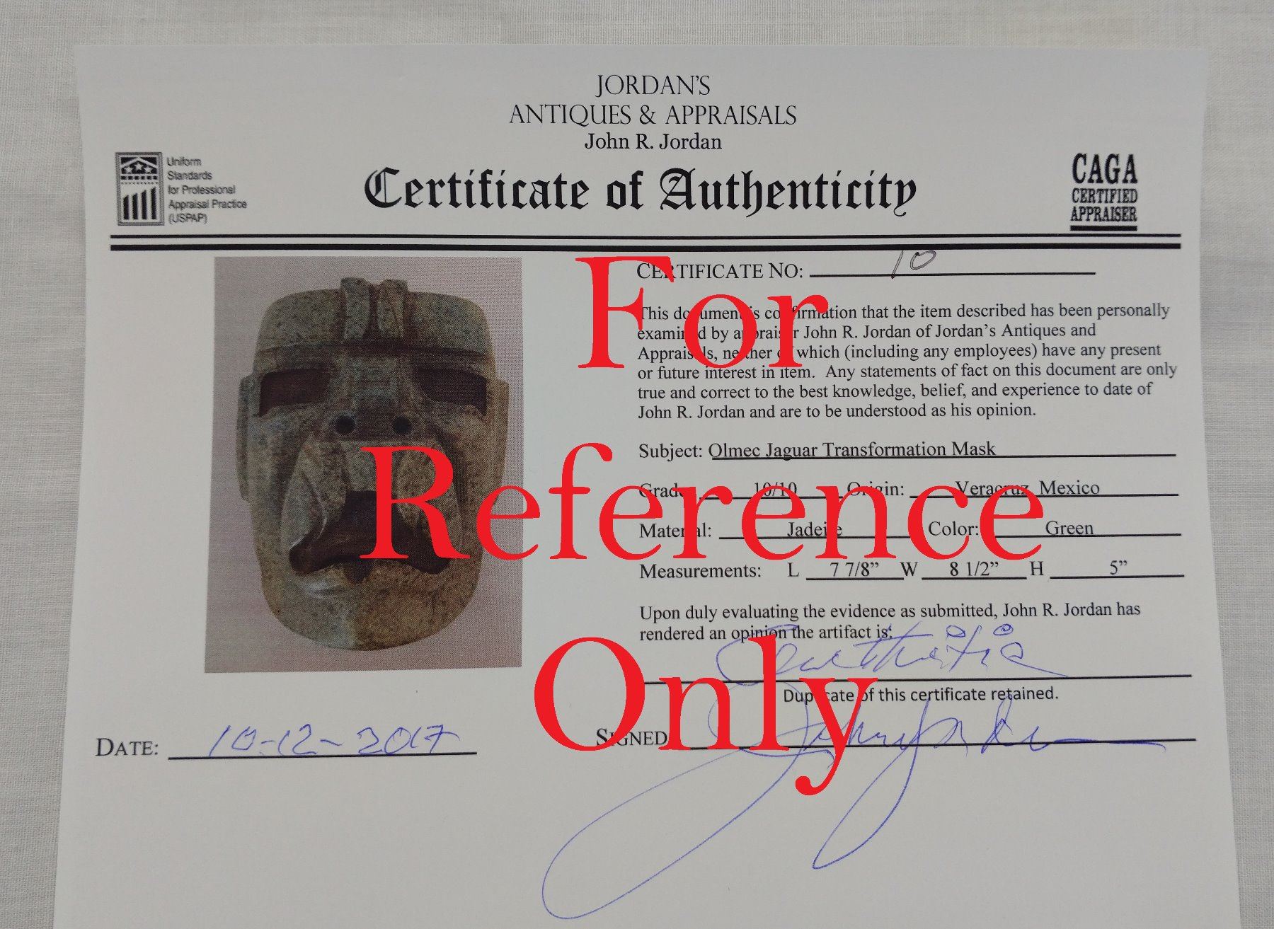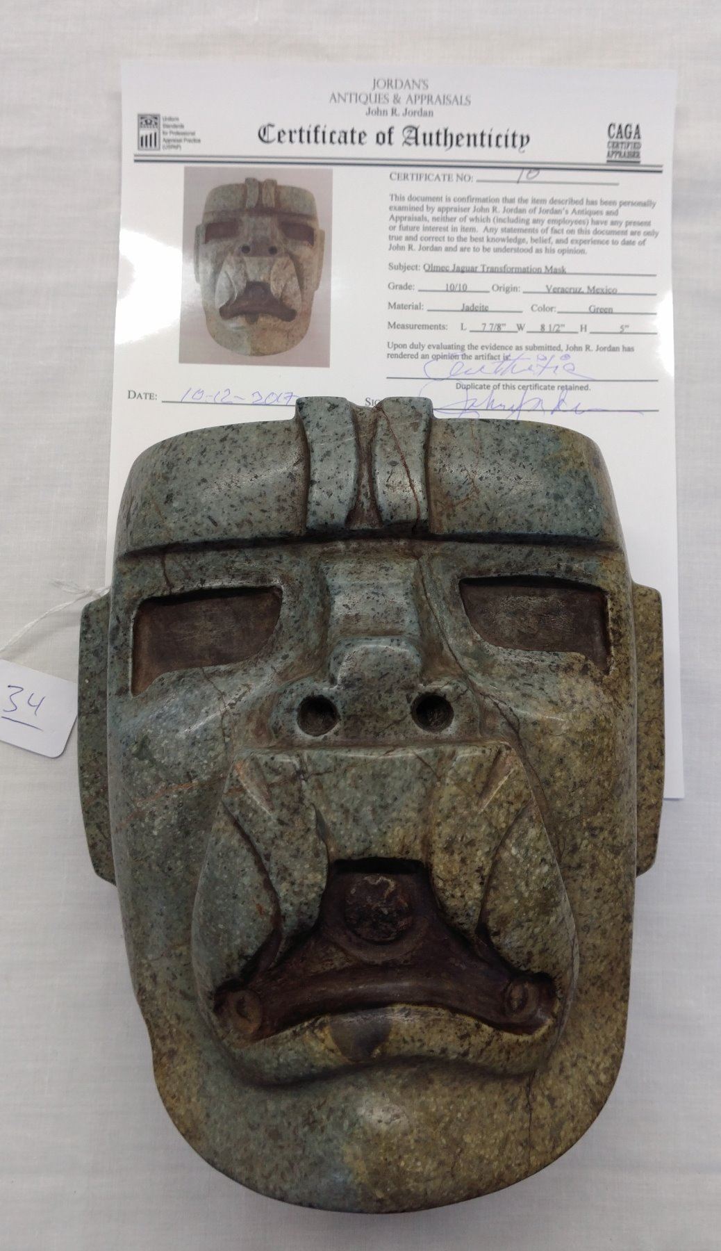 Olmec Jaguar Transformation Mask w/John Jordan COA, pre-Columbian item. Made of jadeite, the item measures approx. 7 7/8" x 8 1/2" x 5". Olmec, Veracruz, Mexico. Large, heavy mask with fangs. From an old, 1960s California collection. John R. Jordan Certificate of Authenticity. Condition: Good, as found, see images. Shipping: $80.00 USA estimate only, USPS Registered Mail, w/insurance and signature, double-boxed.