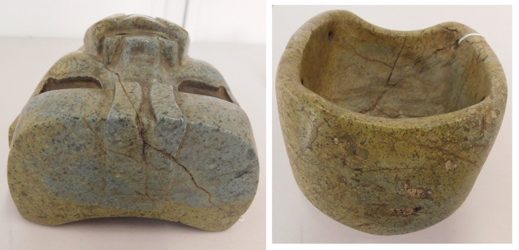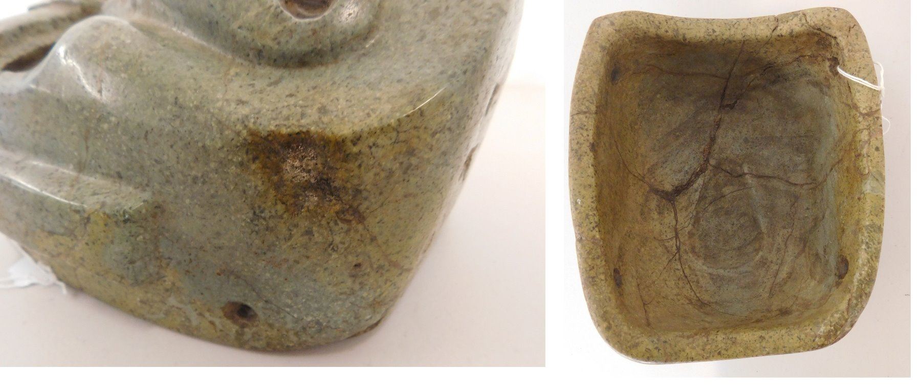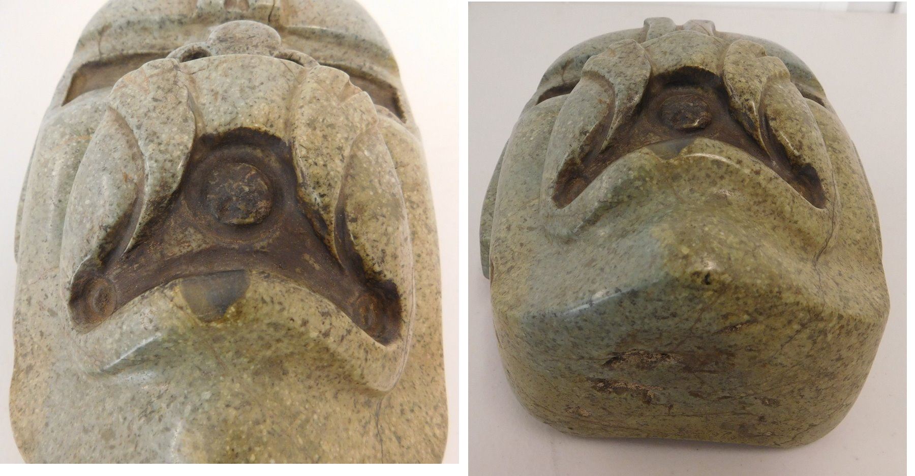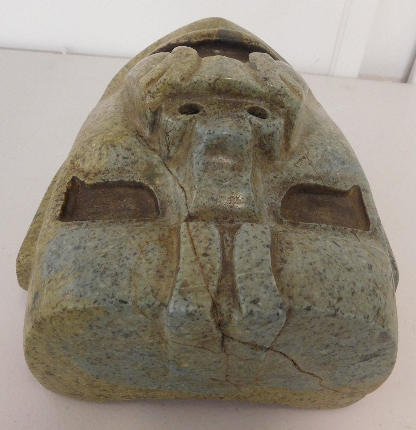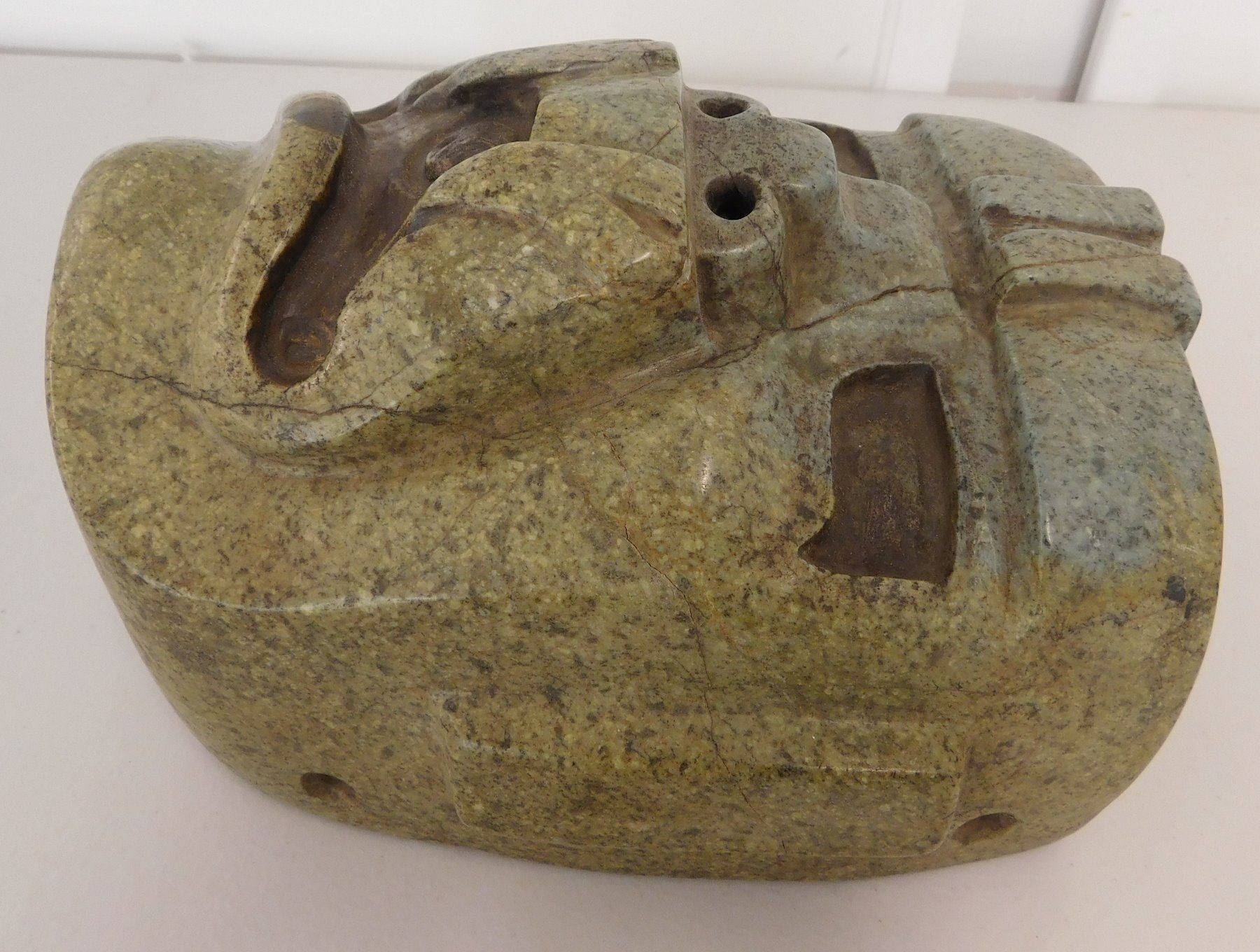 Olmec Jaguar Transformation Mask w/John Jordan COA, pre-Columbian item. Made of jadeite, the item measures approx. 7 7/8" x 8 1/2" x 5". Olmec, Veracruz, Mexico. Large, heavy mask with fangs. From an old, 1960s California collection. John R. Jordan Certificate of Authenticity. Condition: Good, as found, see images. Shipping: $80.00 USA estimate only, USPS Registered Mail, w/insurance and signature, double-boxed.