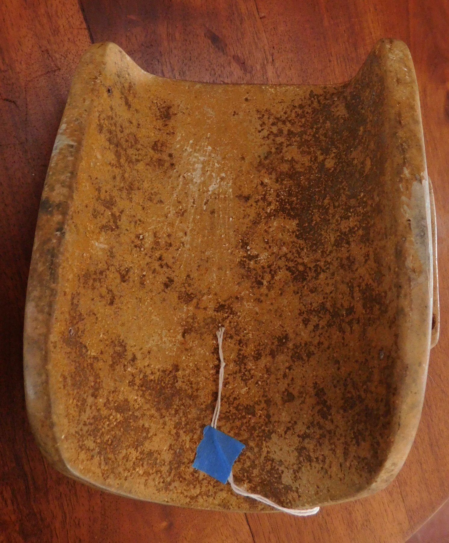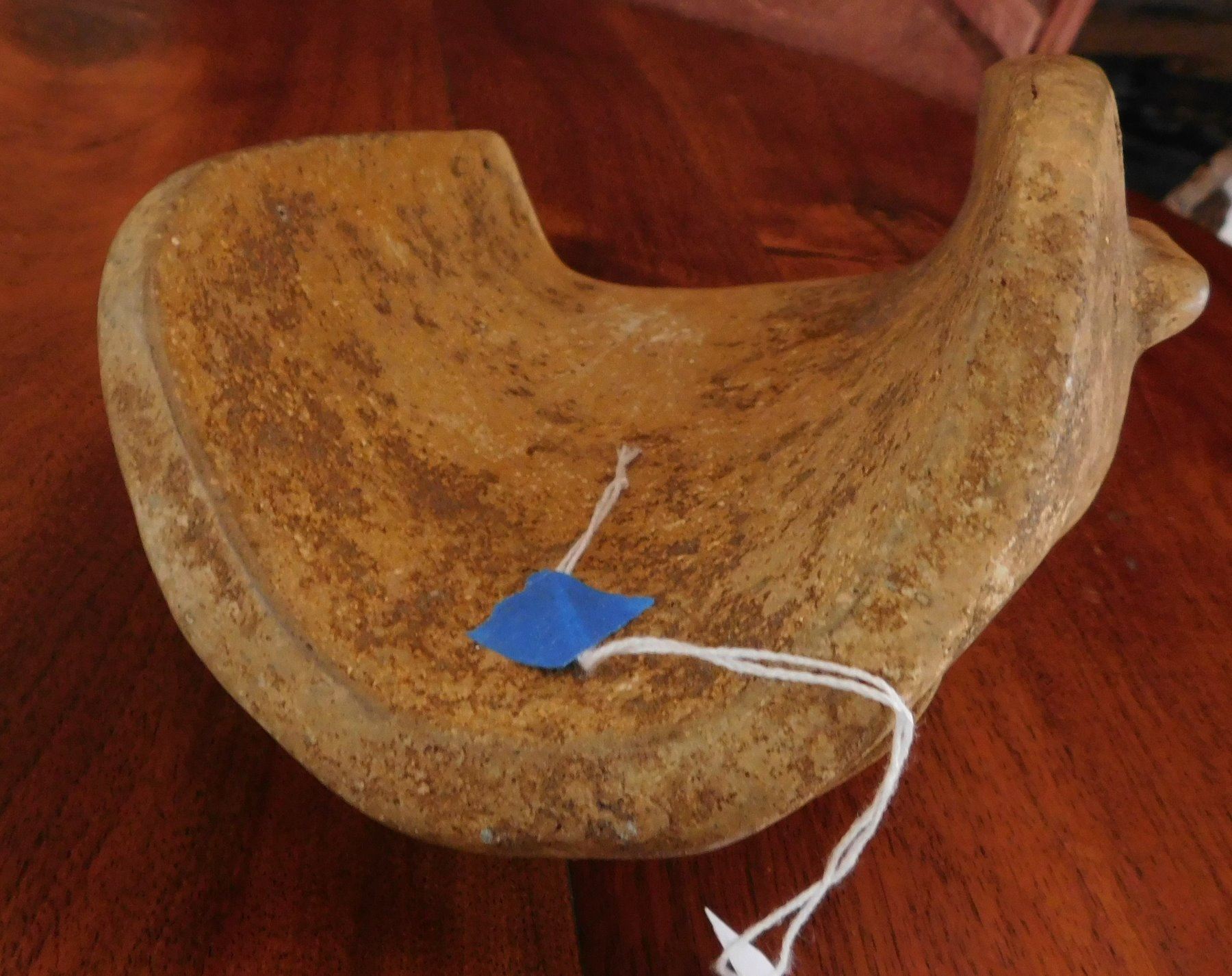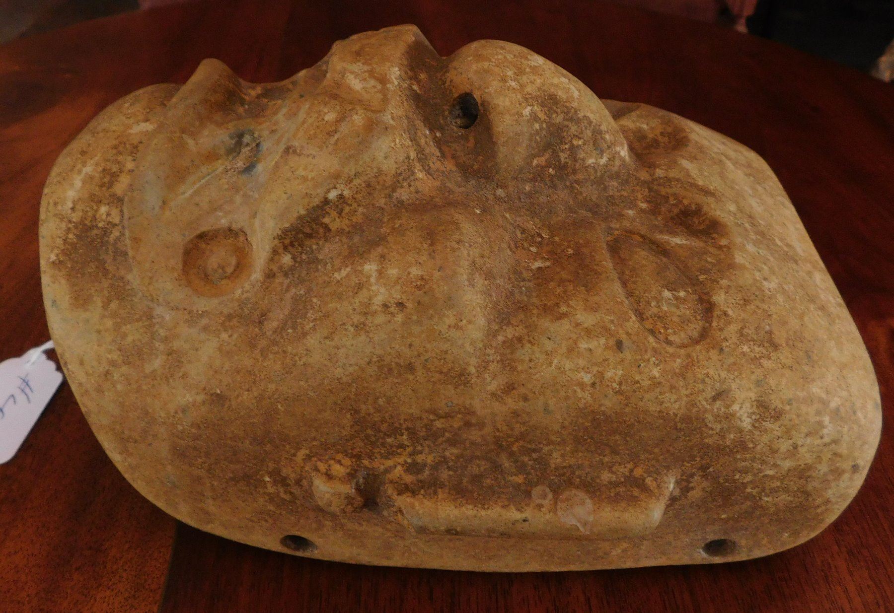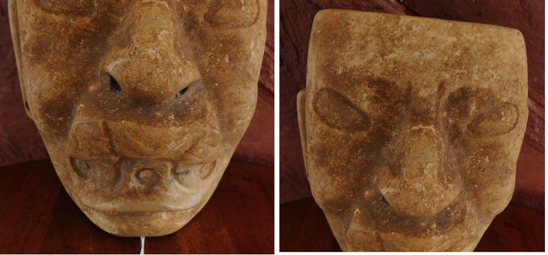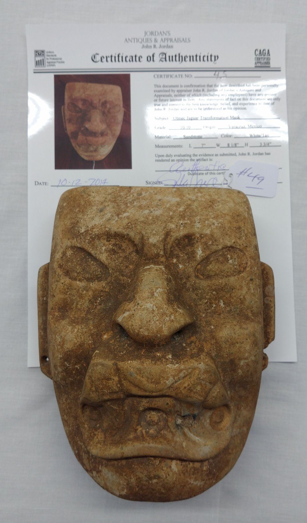Olmec Jaguar Transformation Mask w/John Jordan COA, pre-Columbian item. Made of sandstone, the item measures 7" x 8 1/8" x 3 3/4". Veracruz, Mexico. From an old, 1960s California collection. John R. Jordan Certificate of Authenticity. Condition: Break on ear, patina, see images. Shipping: $65.00 w/insurance and signature, due to value.