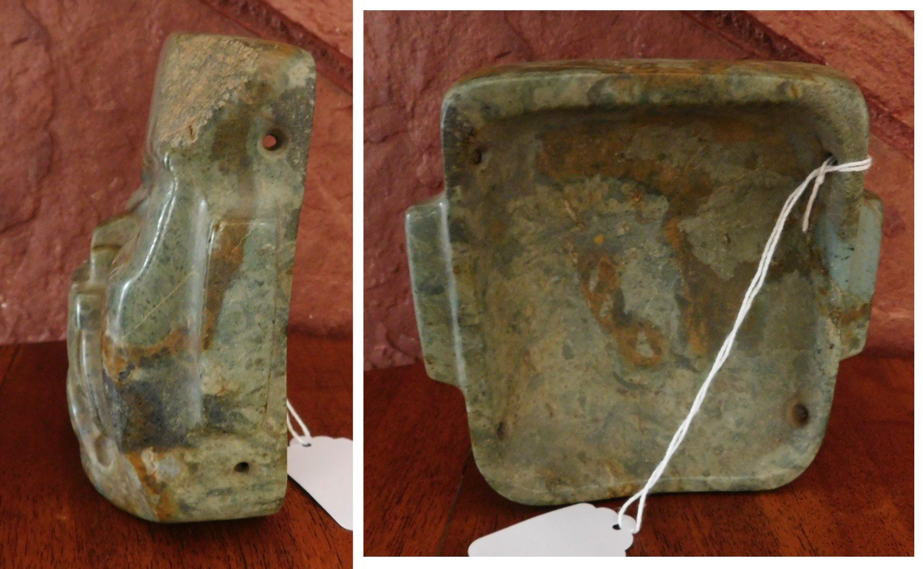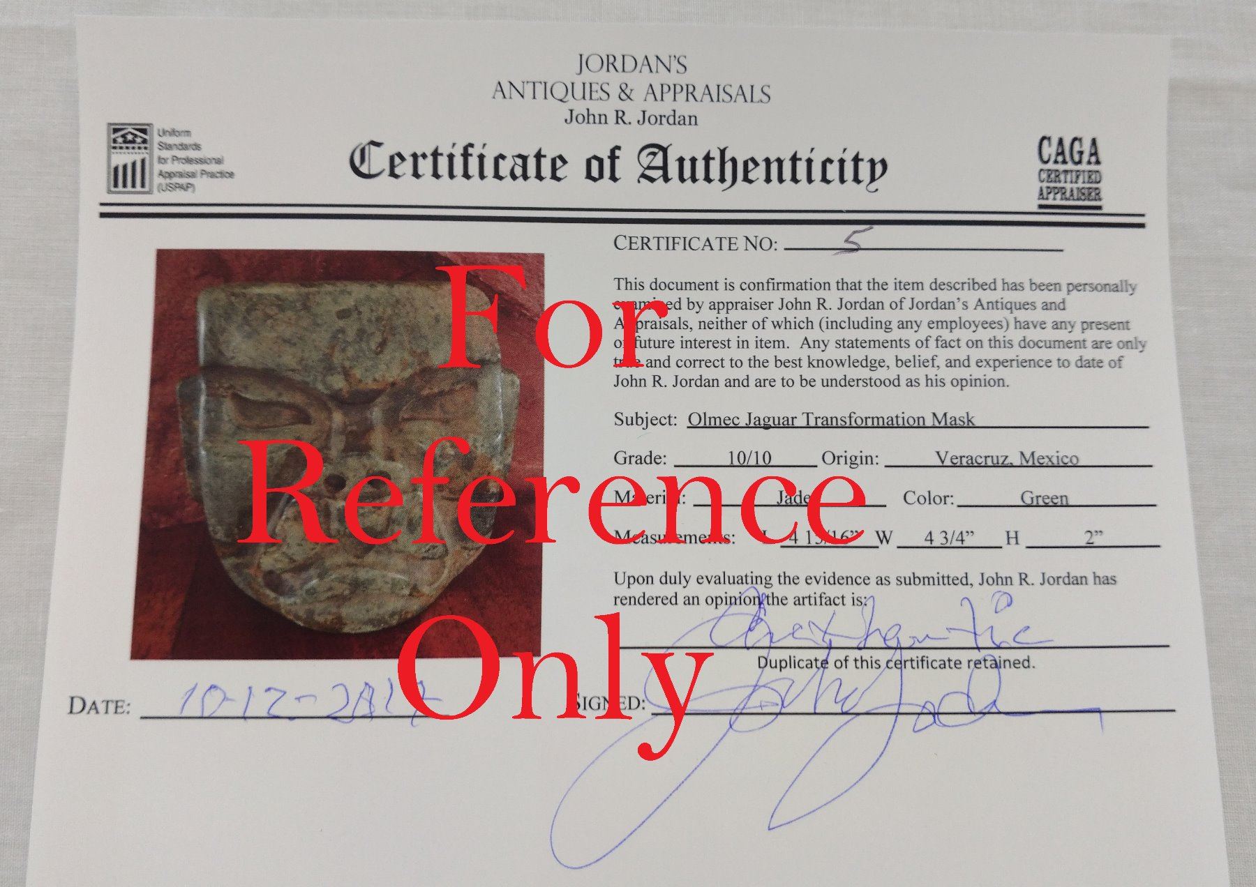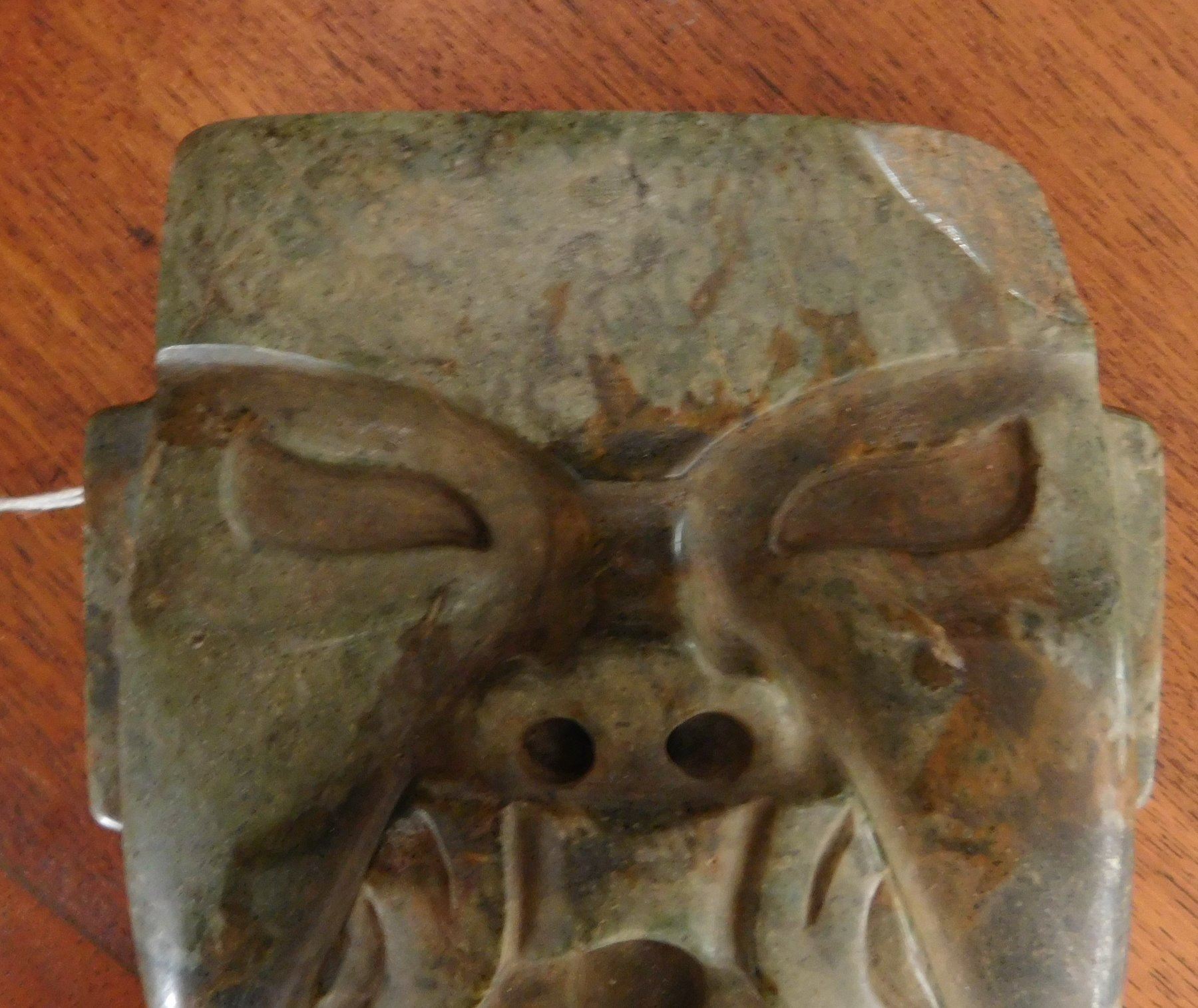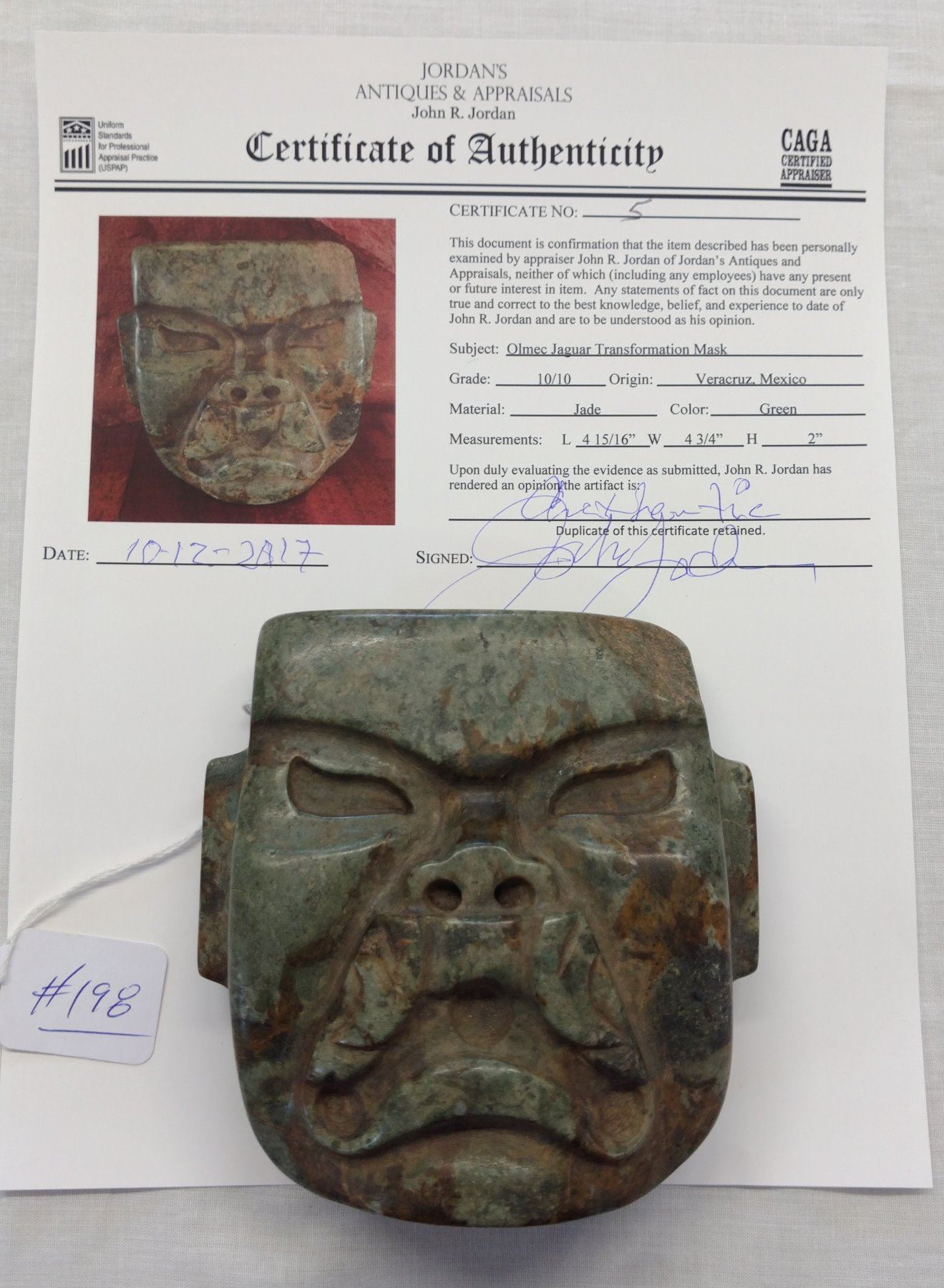 Olmec Jaguar Transformation Mask w/John Jordan COA, pre-Columbian item. Made of jade, the item measures 4 15/16" x 4 3/4" x 2". Olmec, Veracruz, Mexico. From an old, 1960s California collection. John R. Jordan Certificate of Authenticity. Condition: Good, ancient break on corner, see images. Shipping: $50.00 w/insurance and signature, due to value.