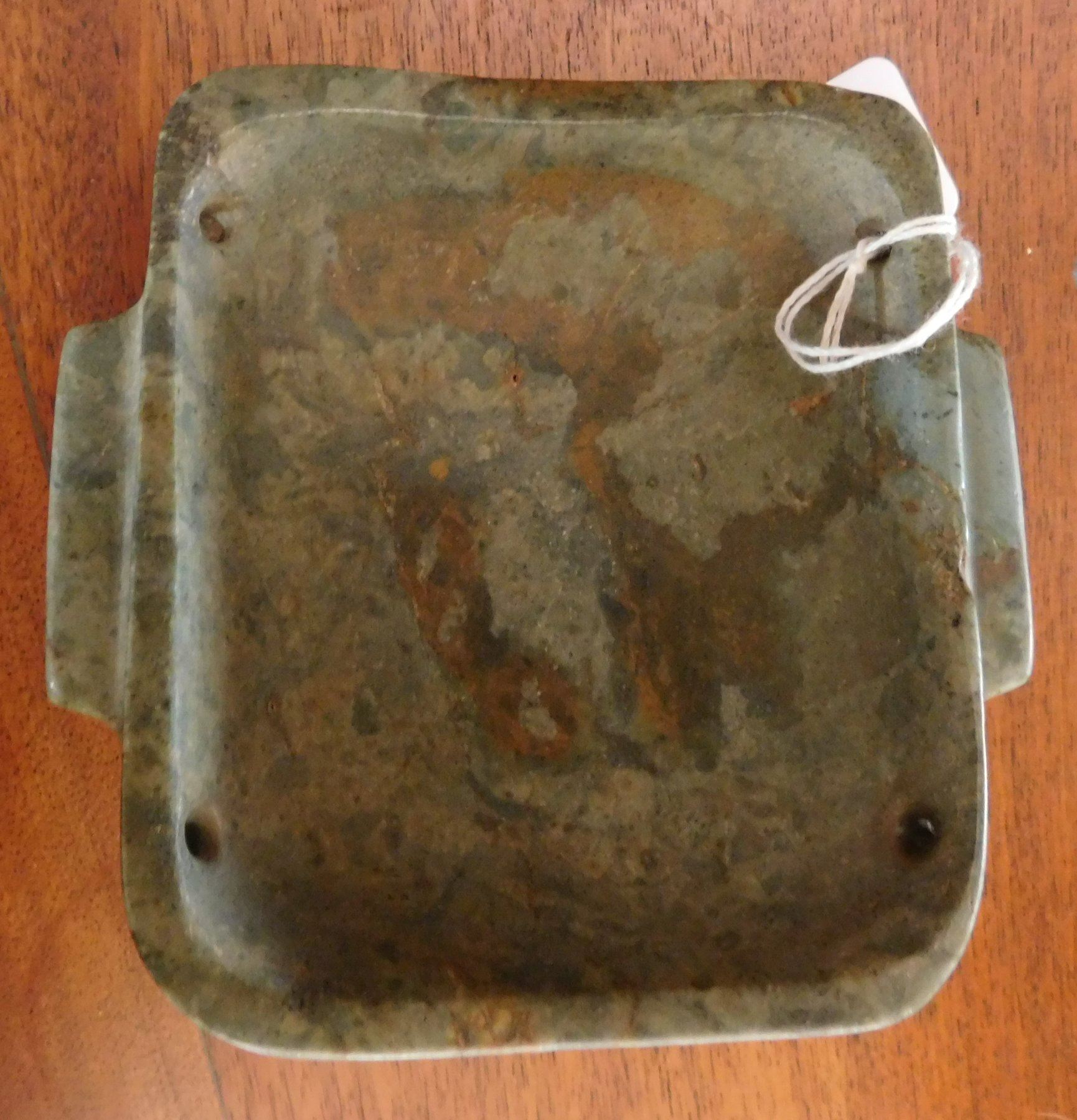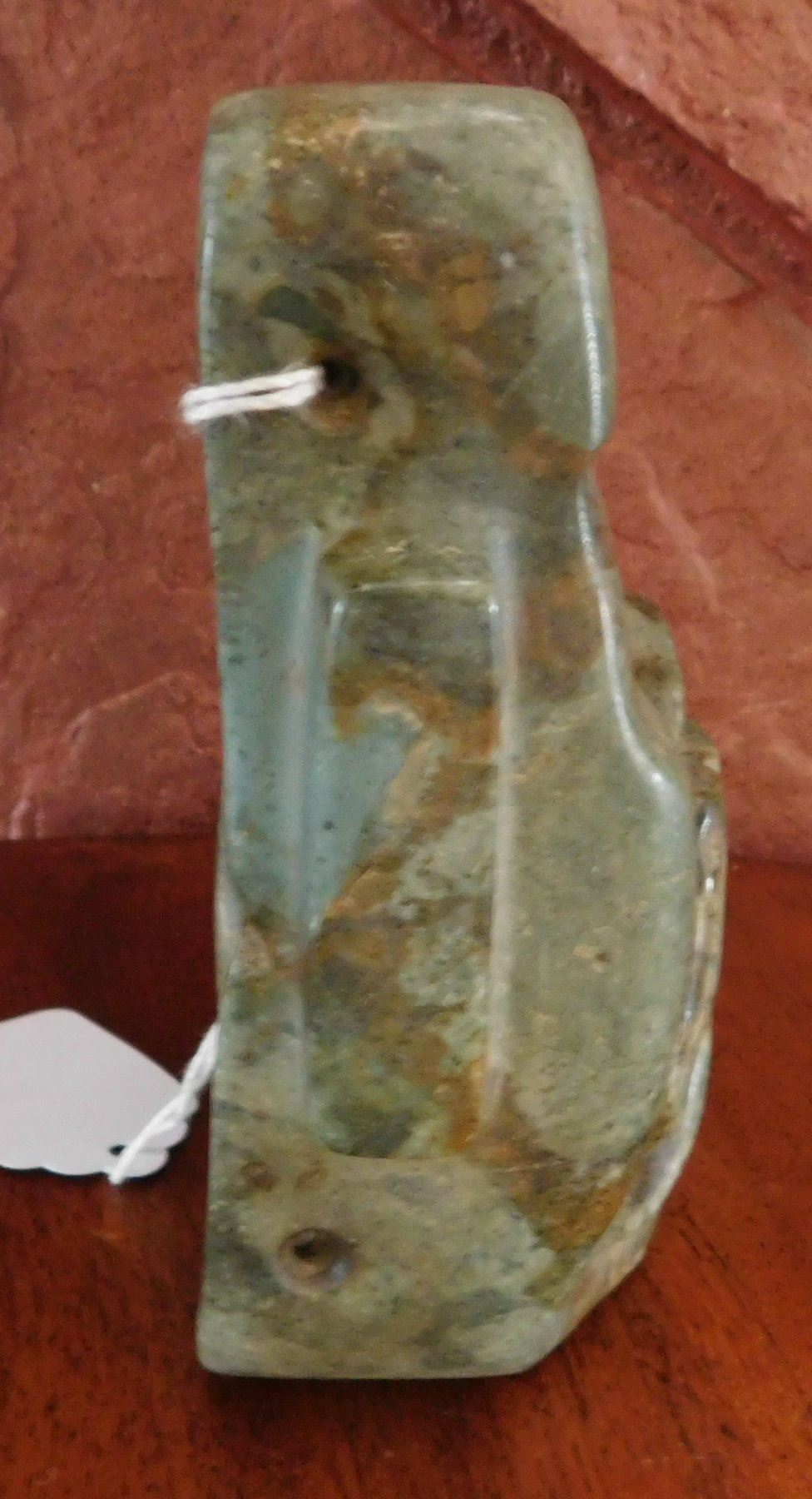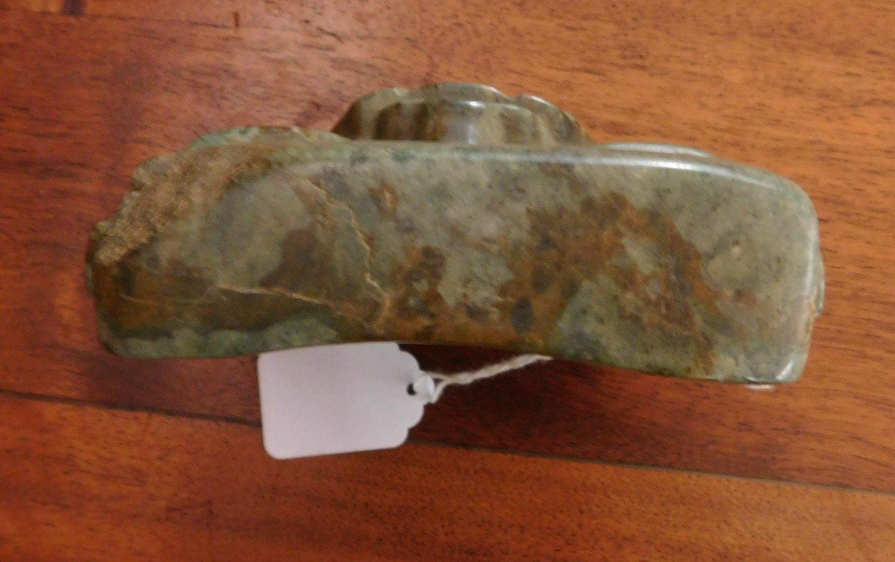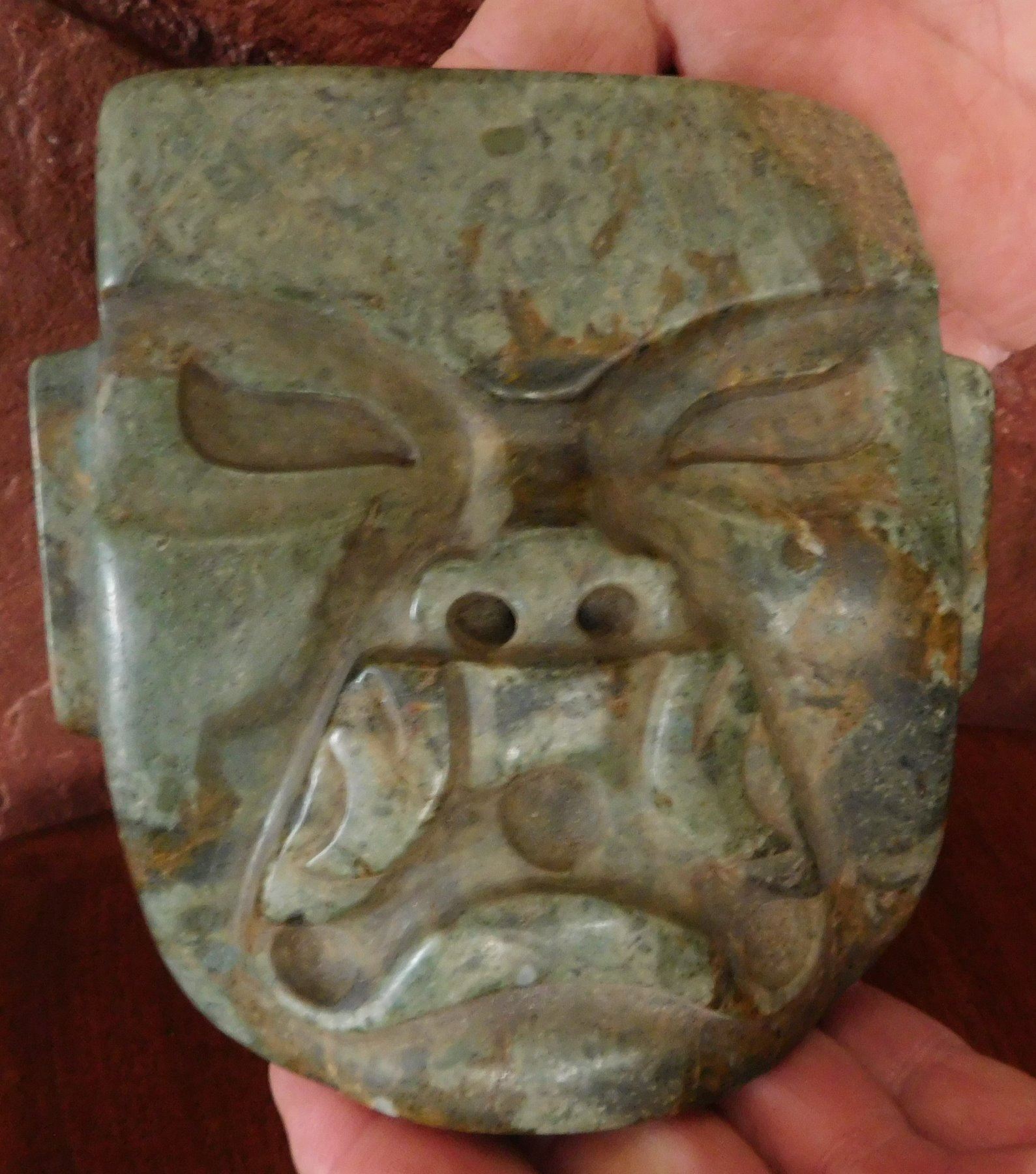 Olmec Jaguar Transformation Mask w/John Jordan COA, pre-Columbian item. Made of jade, the item measures 4 15/16" x 4 3/4" x 2". Olmec, Veracruz, Mexico. From an old, 1960s California collection. John R. Jordan Certificate of Authenticity. Condition: Good, ancient break on corner, see images. Shipping: $50.00 w/insurance and signature, due to value.
