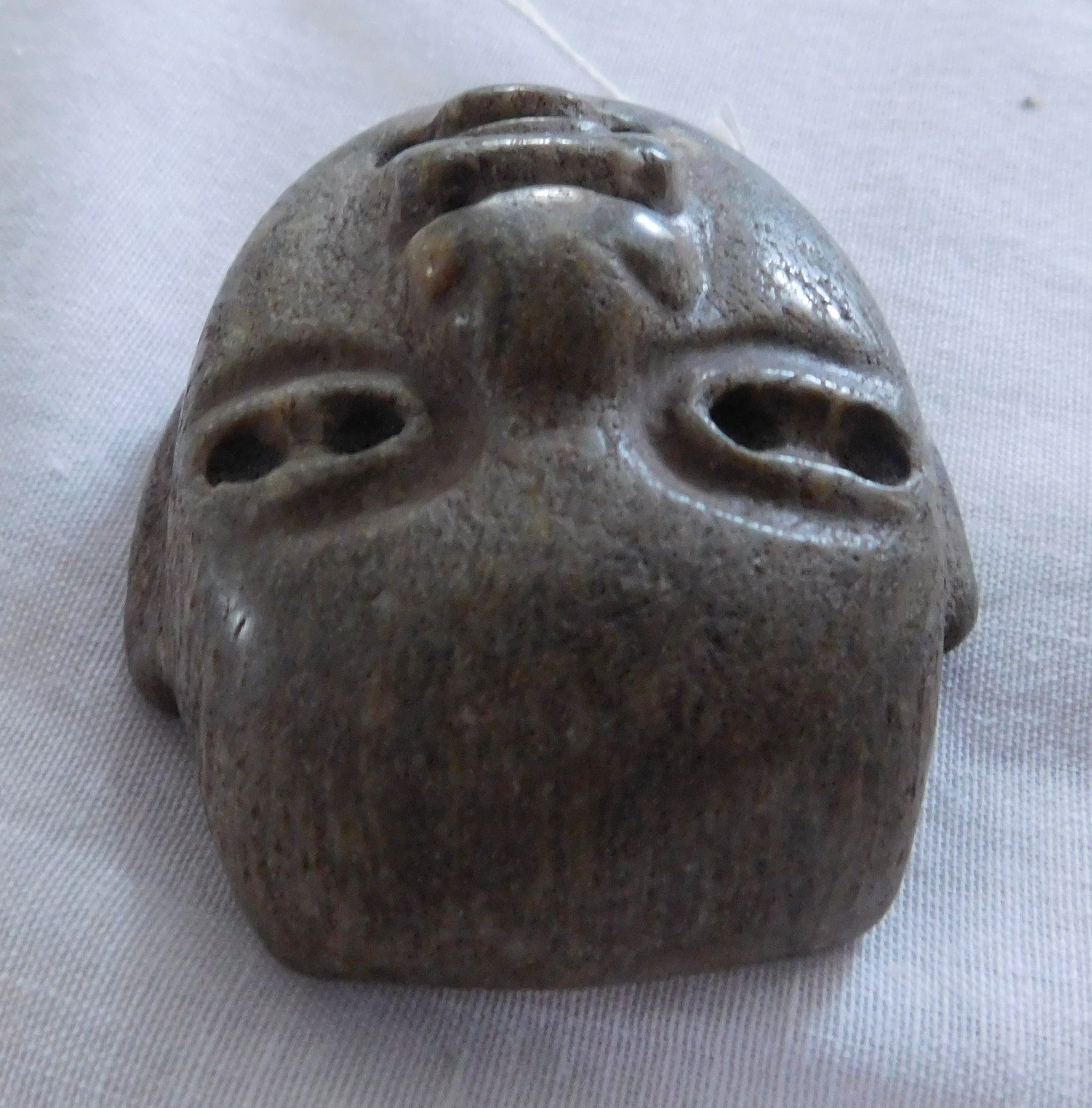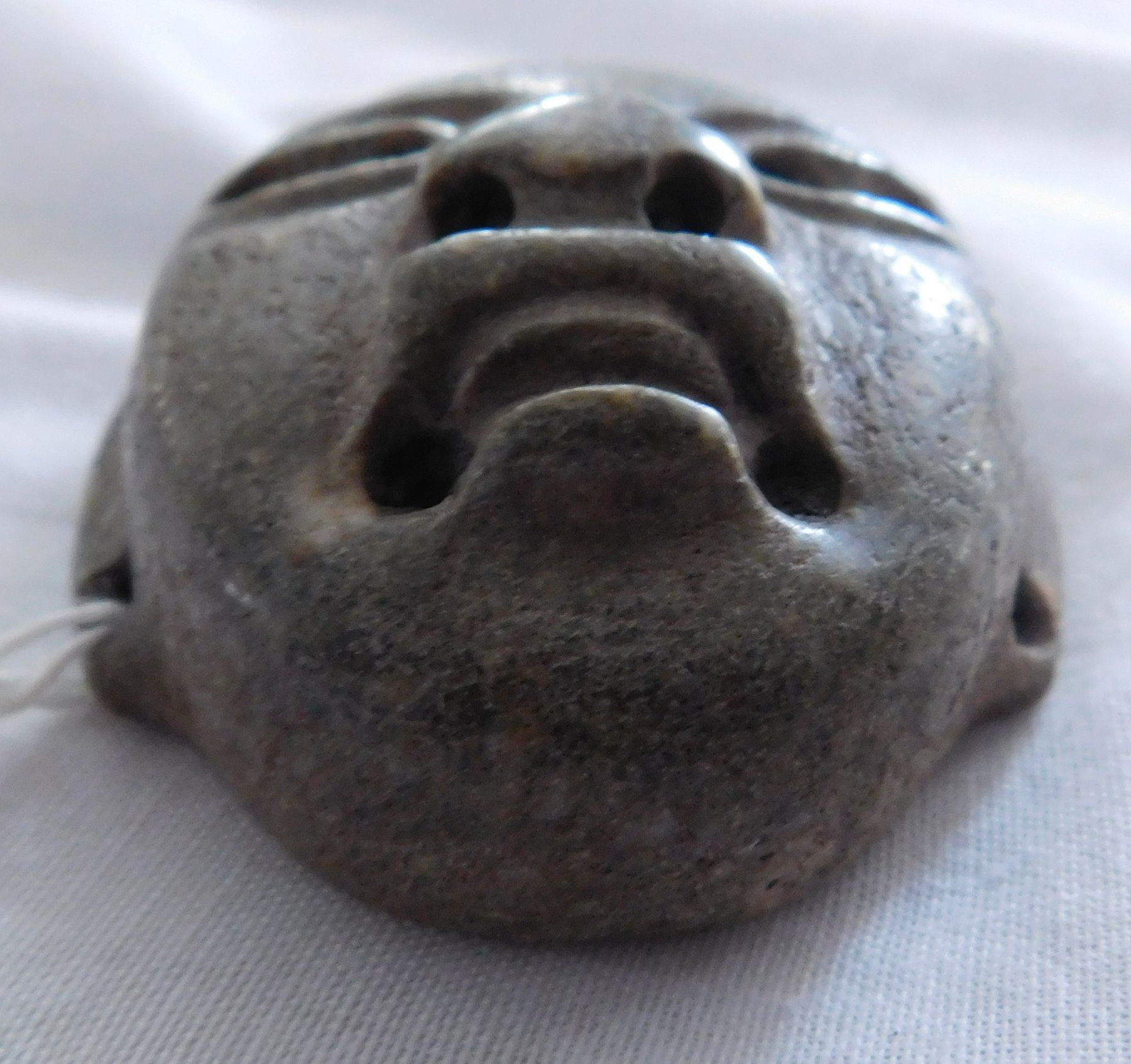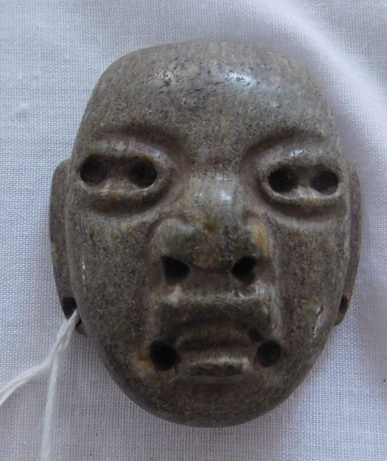Olmec Maskette, pre-Columbian item. Made of green stone, the item measures 2.5" x 2" x 1". Veracruz, Mexico. From an old, 1960s California collection. Condition: Good, see images. Shipping: $14.50 w/insurance and signature, due to value.