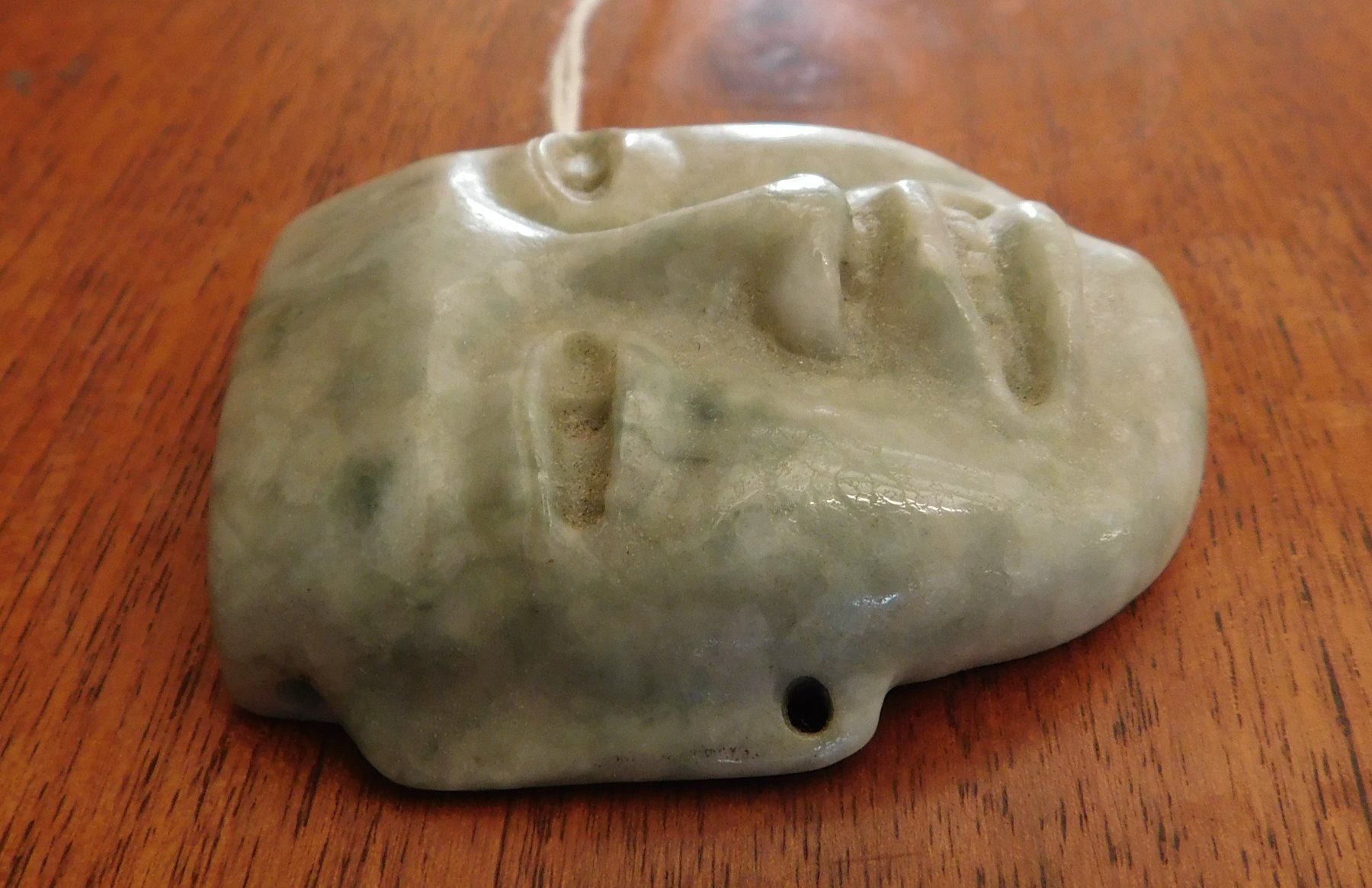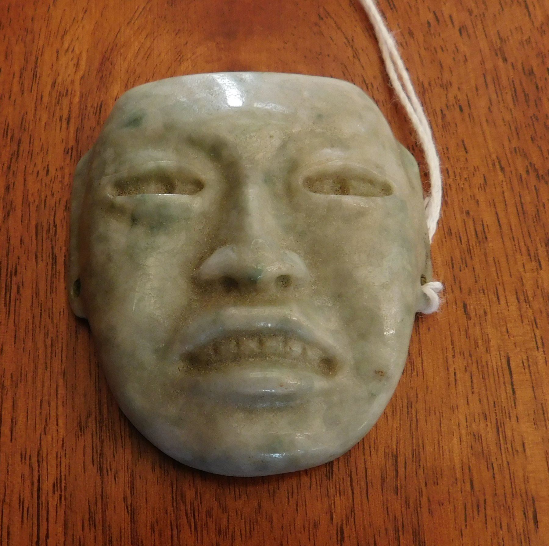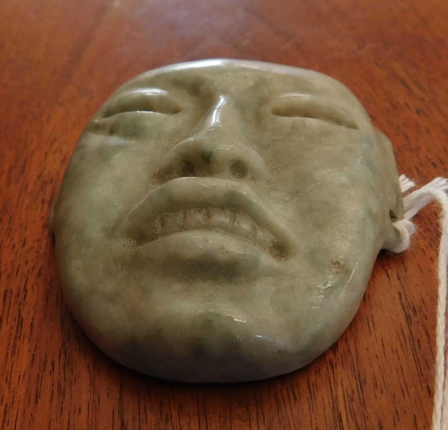 Olmec Maskette, pre-Columbian item. Made of translucent jade, the item measures 2 1/4" x 2" x 1/2". Rio Pescaro, Veracruz, Mexico. Helm COA available. Condition: Good, very fine, see images. Shipping: $25.00 w/insurance and signature, due to value.
