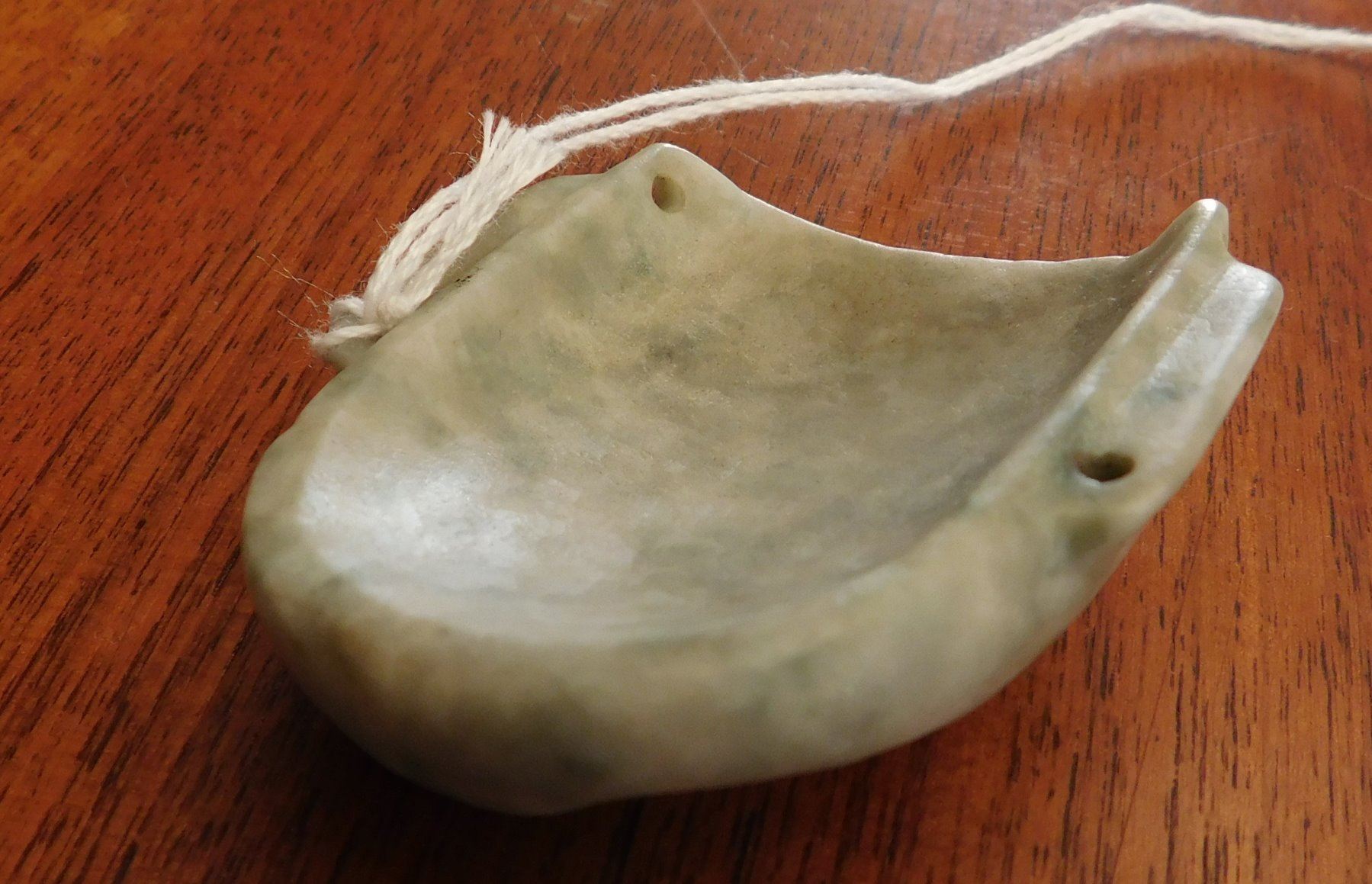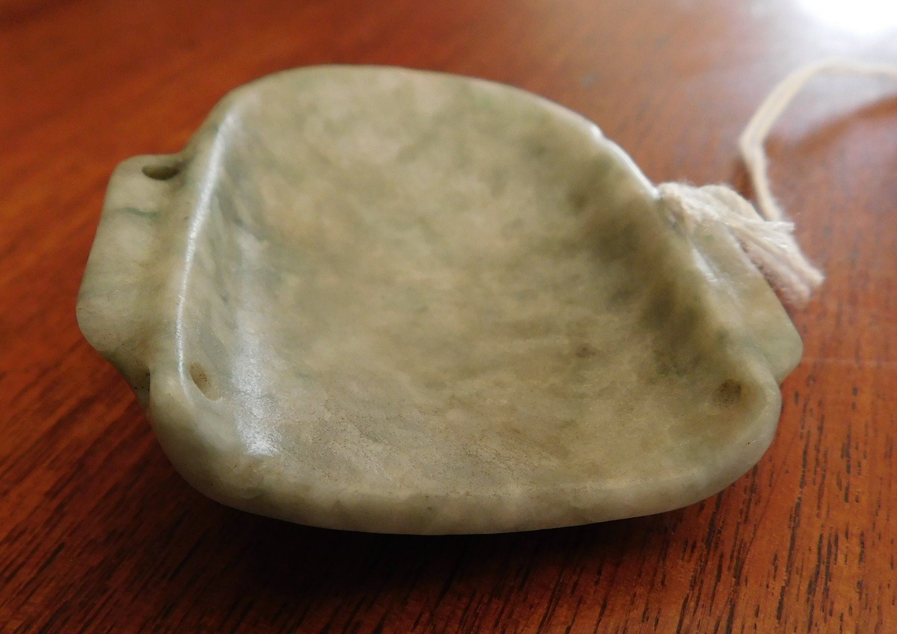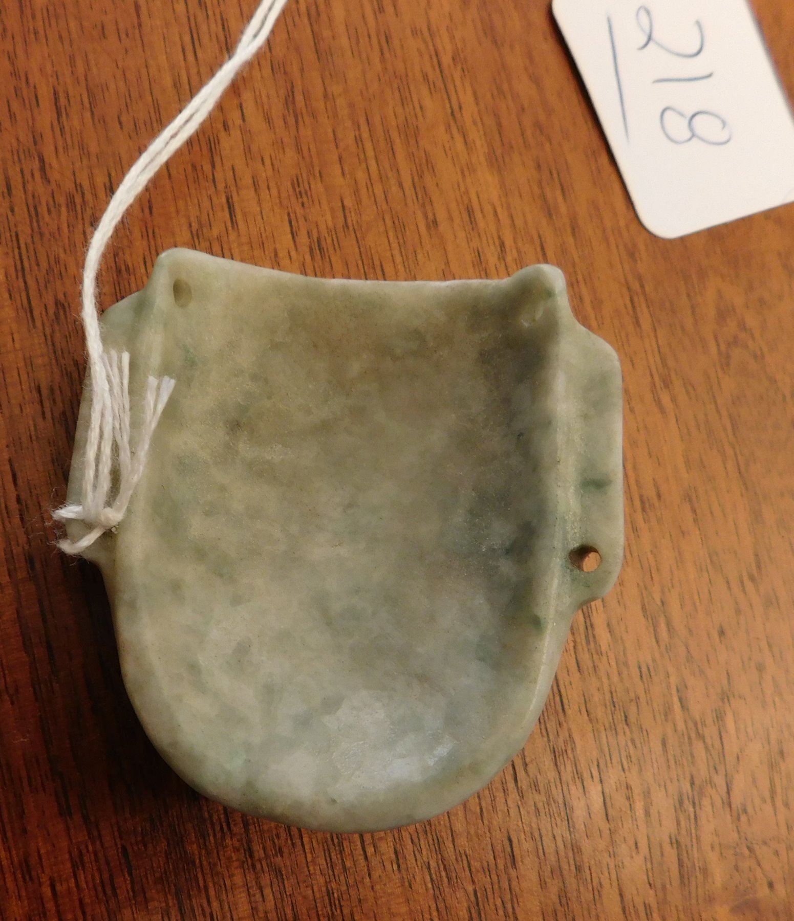 Olmec Maskette, pre-Columbian item. Made of translucent jade, the item measures 2 1/4" x 2" x 1/2". Rio Pescaro, Veracruz, Mexico. Helm COA available. Condition: Good, very fine, see images. Shipping: $25.00 w/insurance and signature, due to value.