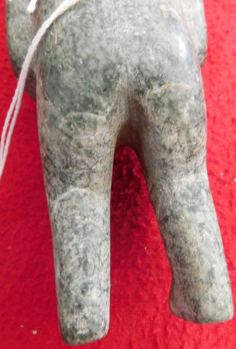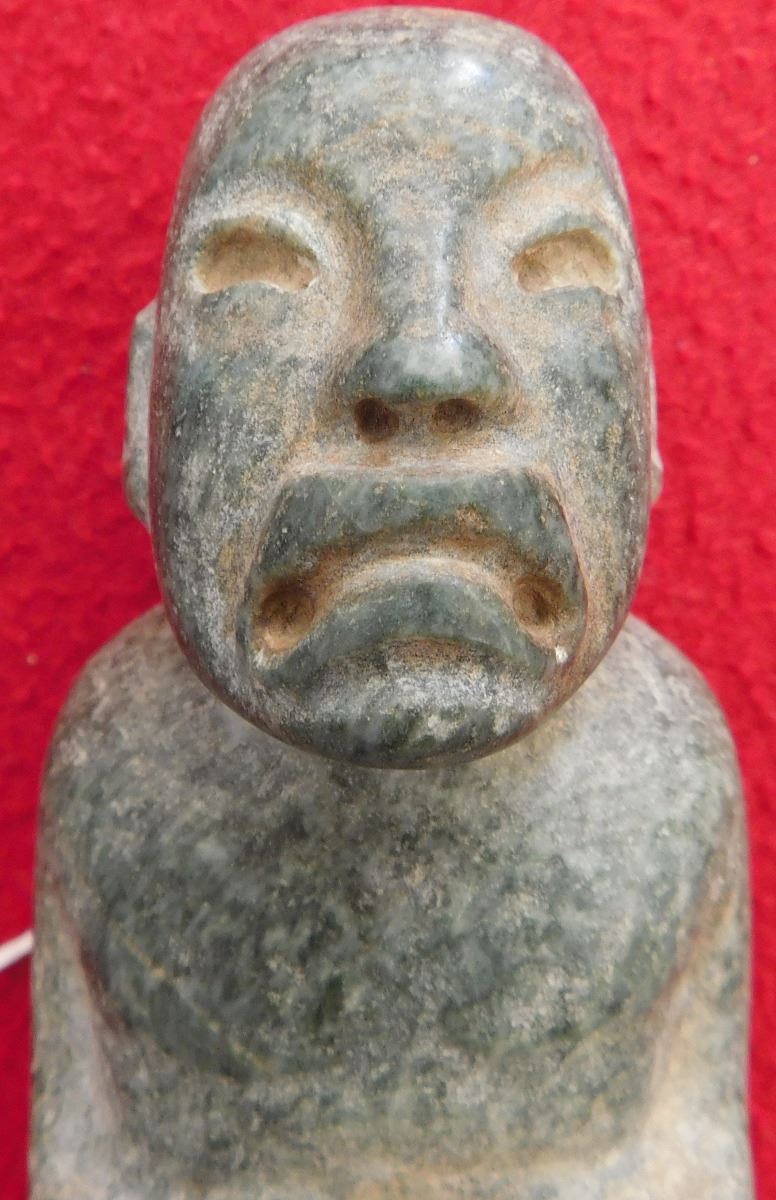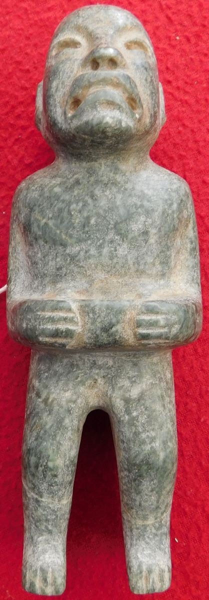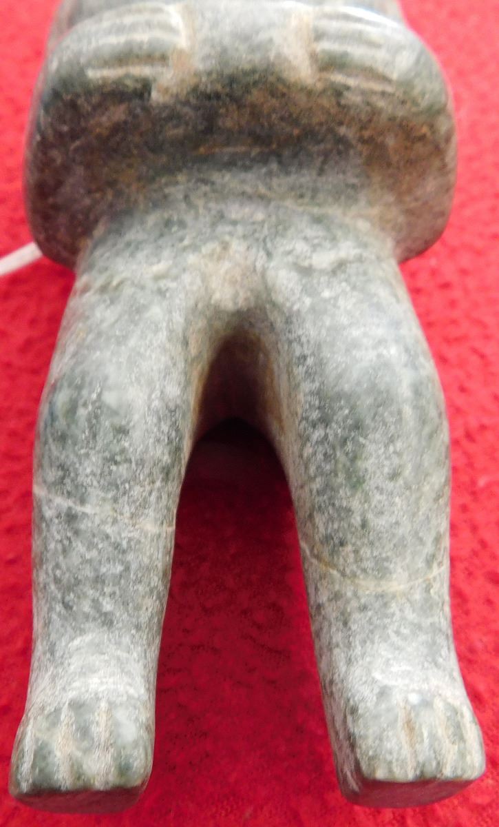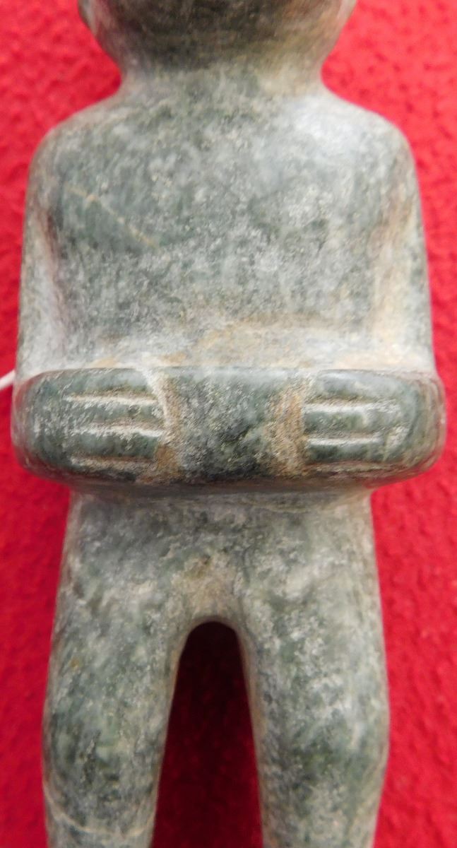 Olmec Standing Figure w/Bowl, c. 3500 years old. Made of jadeite, this pre-columbian figure measures 6.25" x 2.25" x 2.25". Interesting hairdo on the standing figure, could possibly be offering to the gods! From an old, 1960s California collection. Condition: Has been overcleaned, some remaining natural patina, see images. Shipping: $25.50 w/insurance and signature.
