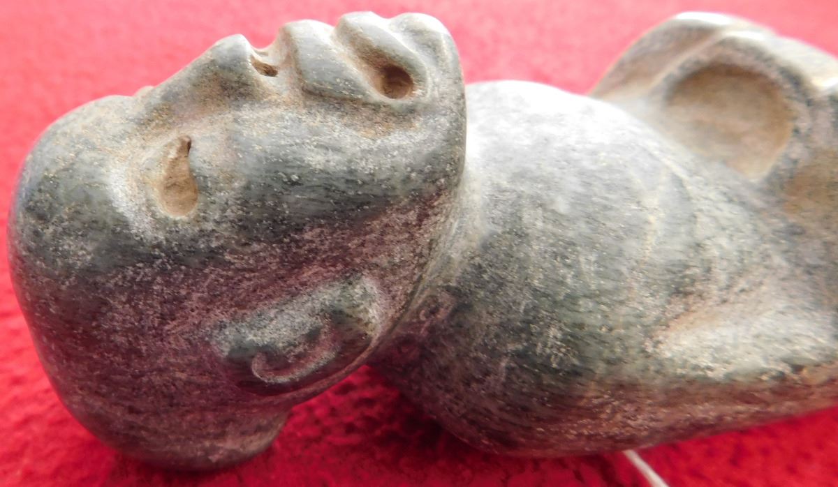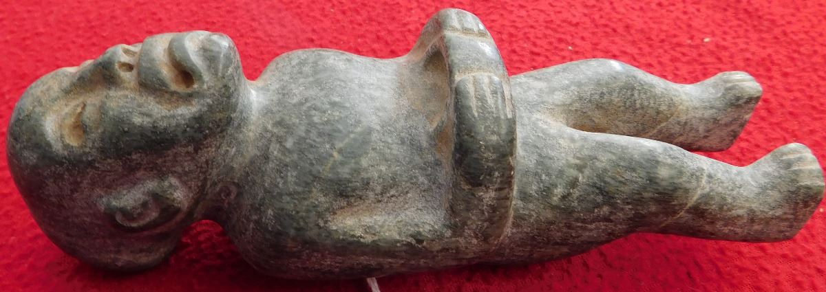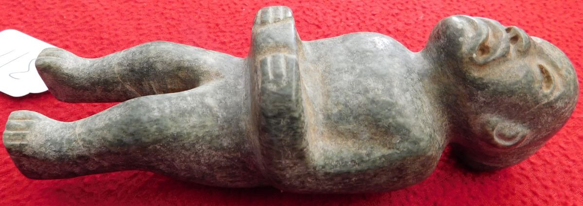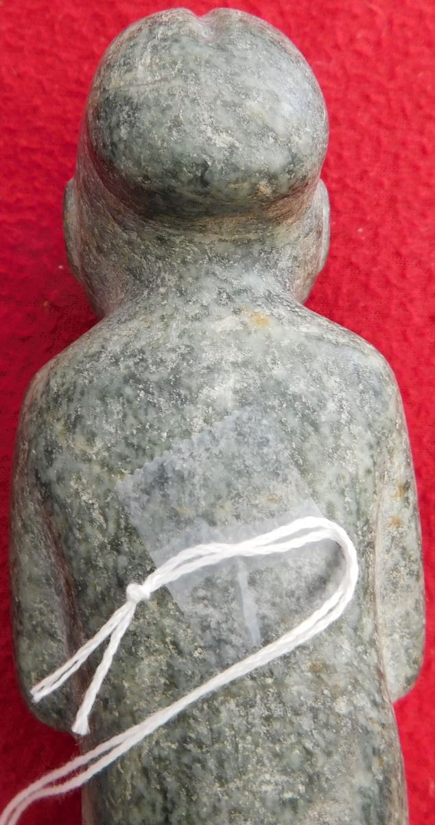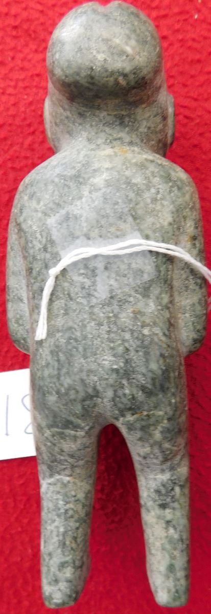 Olmec Standing Figure w/Bowl, c. 3500 years old. Made of jadeite, this pre-columbian figure measures 6.25" x 2.25" x 2.25". Interesting hairdo on the standing figure, could possibly be offering to the gods! From an old, 1960s California collection. Condition: Has been overcleaned, some remaining natural patina, see images. Shipping: $25.50 w/insurance and signature.