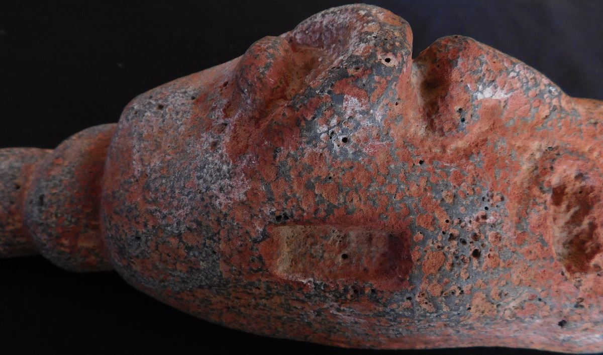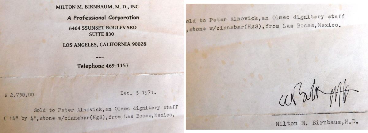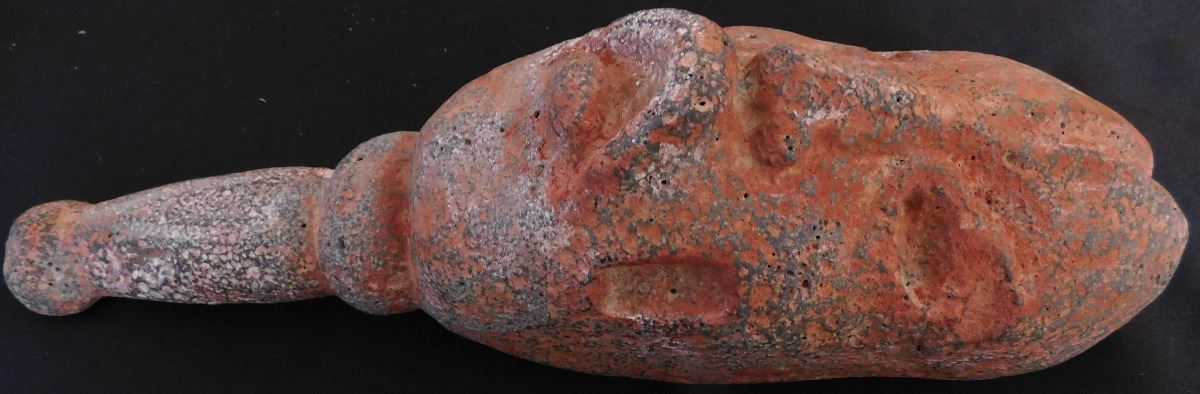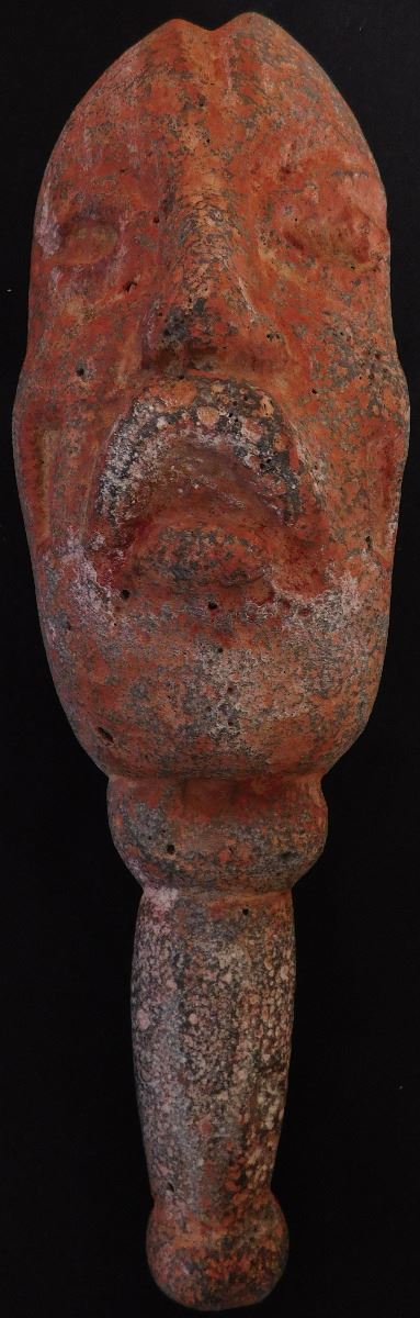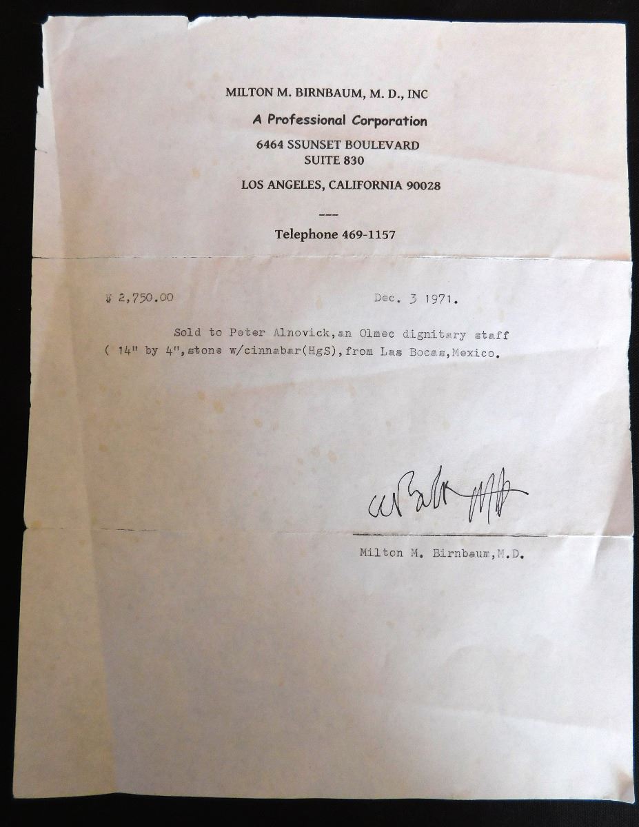 Olmec Stone Scepter or Staff, c. 2400 years old. Carved of vesicular basalt w/remnants of cinnabar, this item measures 14" x 4" and weighs 8.75 pounds. It is an olmec transformation piece, with the figure transforming into a Jaguar. At one time it had inlay in cheeks, and has a cleft head. From Las Bocas, Mexico. Includes receipt from 1971 sale. Helm COA included. Condition: Very good, see images. USA Shipping: $60, USPS Registered Mail. Int'l Shipping: $85.00 estimate, buyer pays all shipping fees.