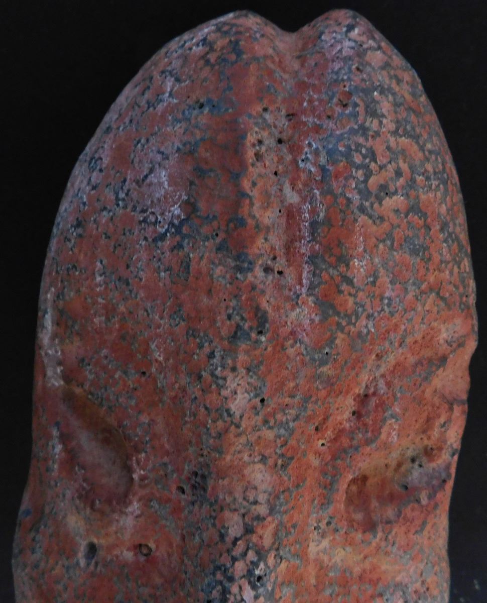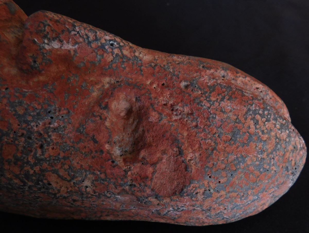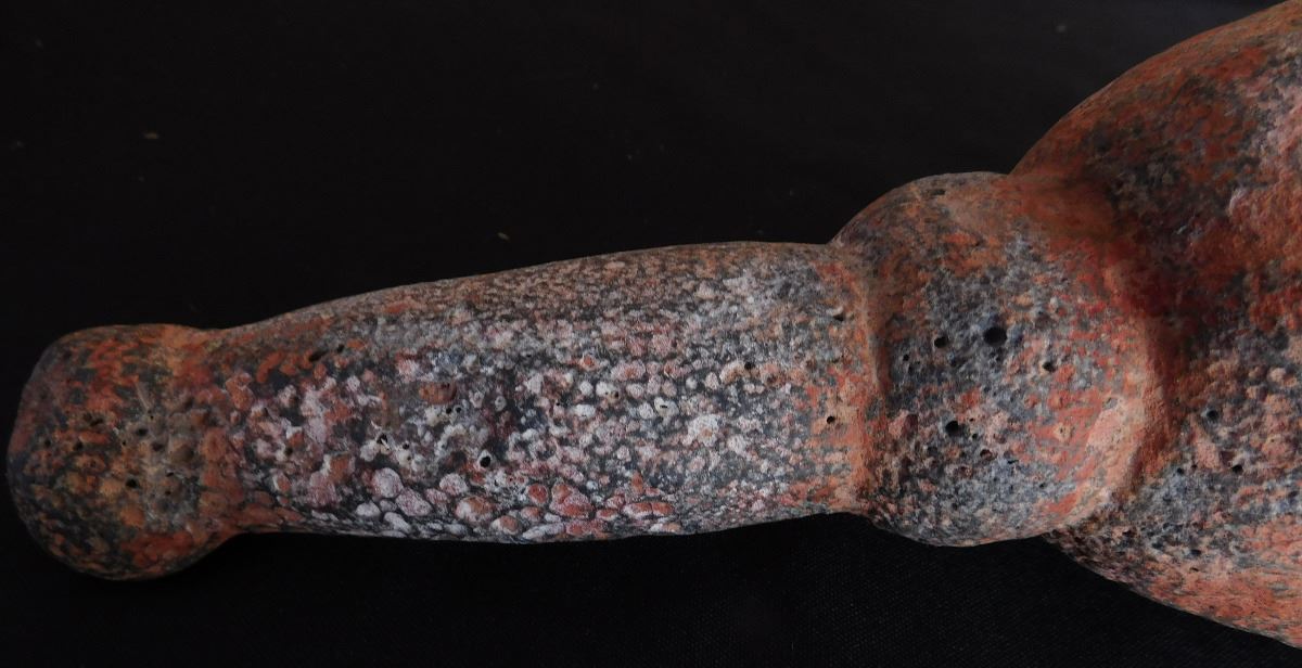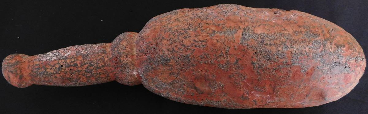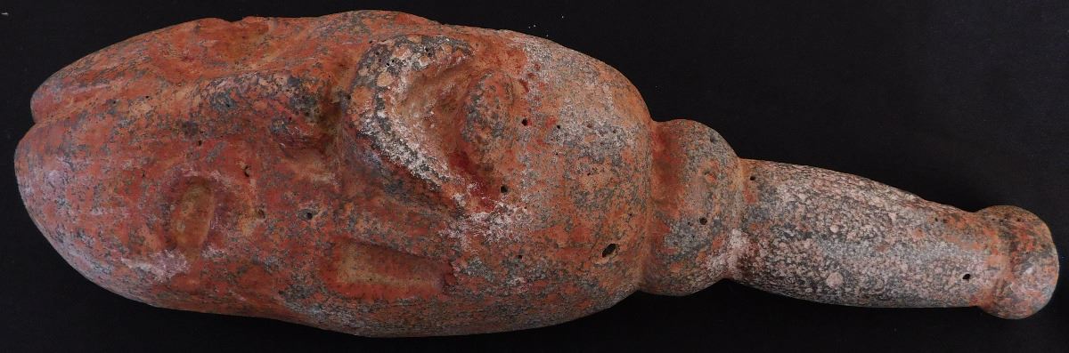 Olmec Stone Scepter or Staff, c. 2400 years old. Carved of vesicular basalt w/remnants of cinnabar, this item measures 14" x 4" and weighs 8.75 pounds. It is an olmec transformation piece, with the figure transforming into a Jaguar. At one time it had inlay in cheeks, and has a cleft head. From Las Bocas, Mexico. Includes receipt from 1971 sale. Helm COA included. Condition: Very good, see images. USA Shipping: $60, USPS Registered Mail. Int'l Shipping: $85.00 estimate, buyer pays all shipping fees.