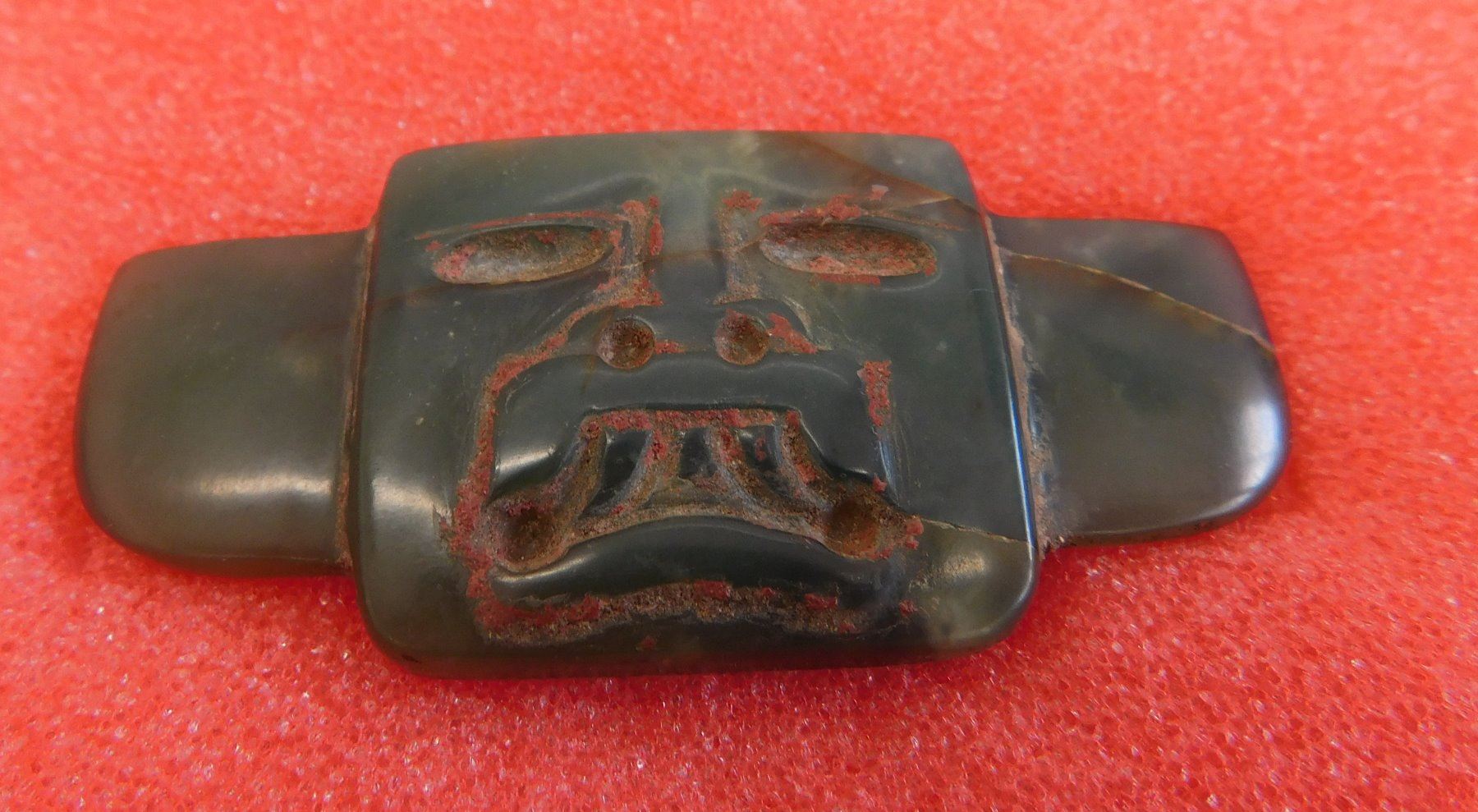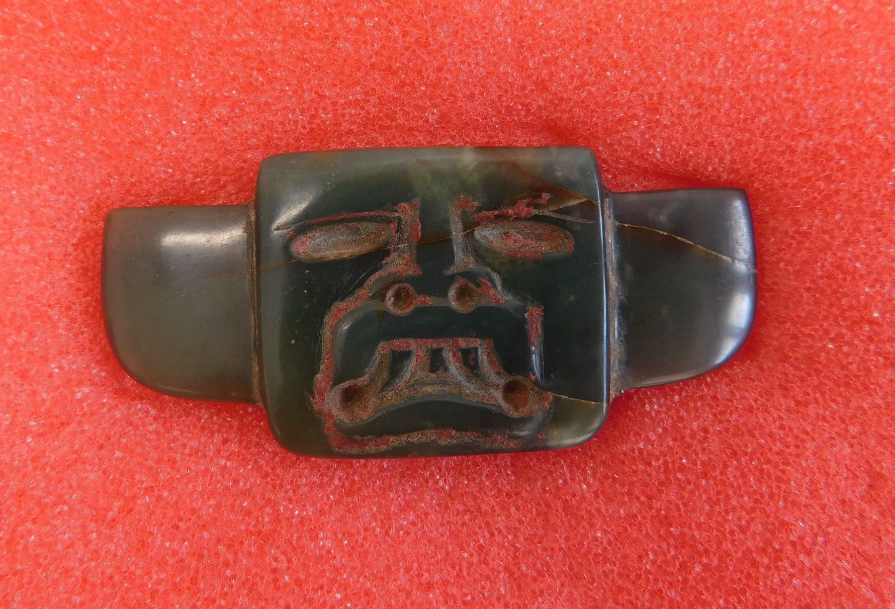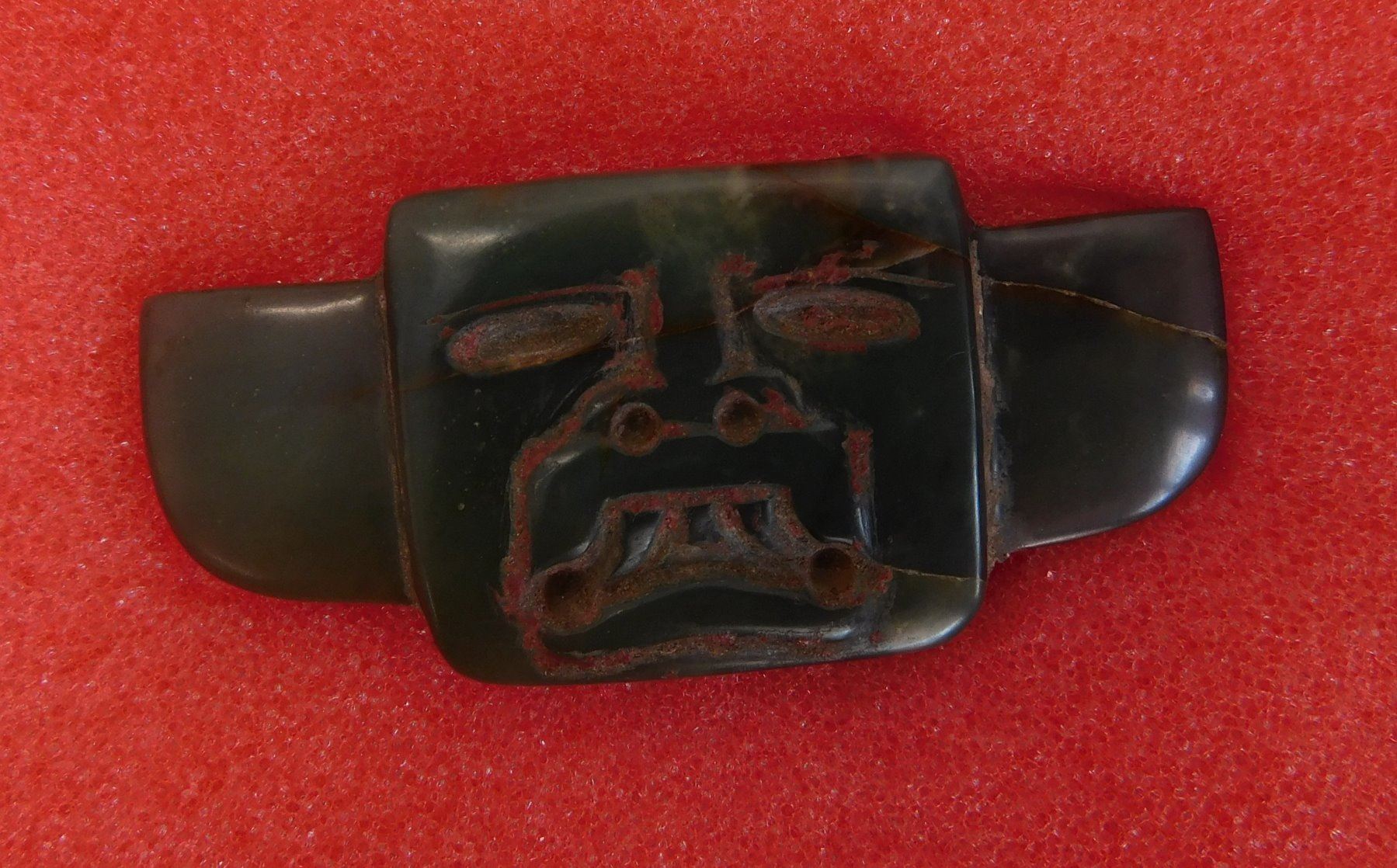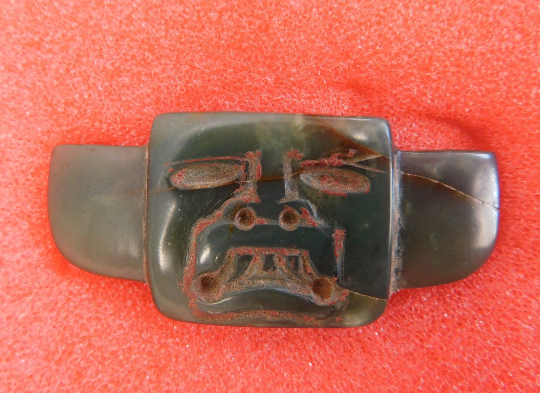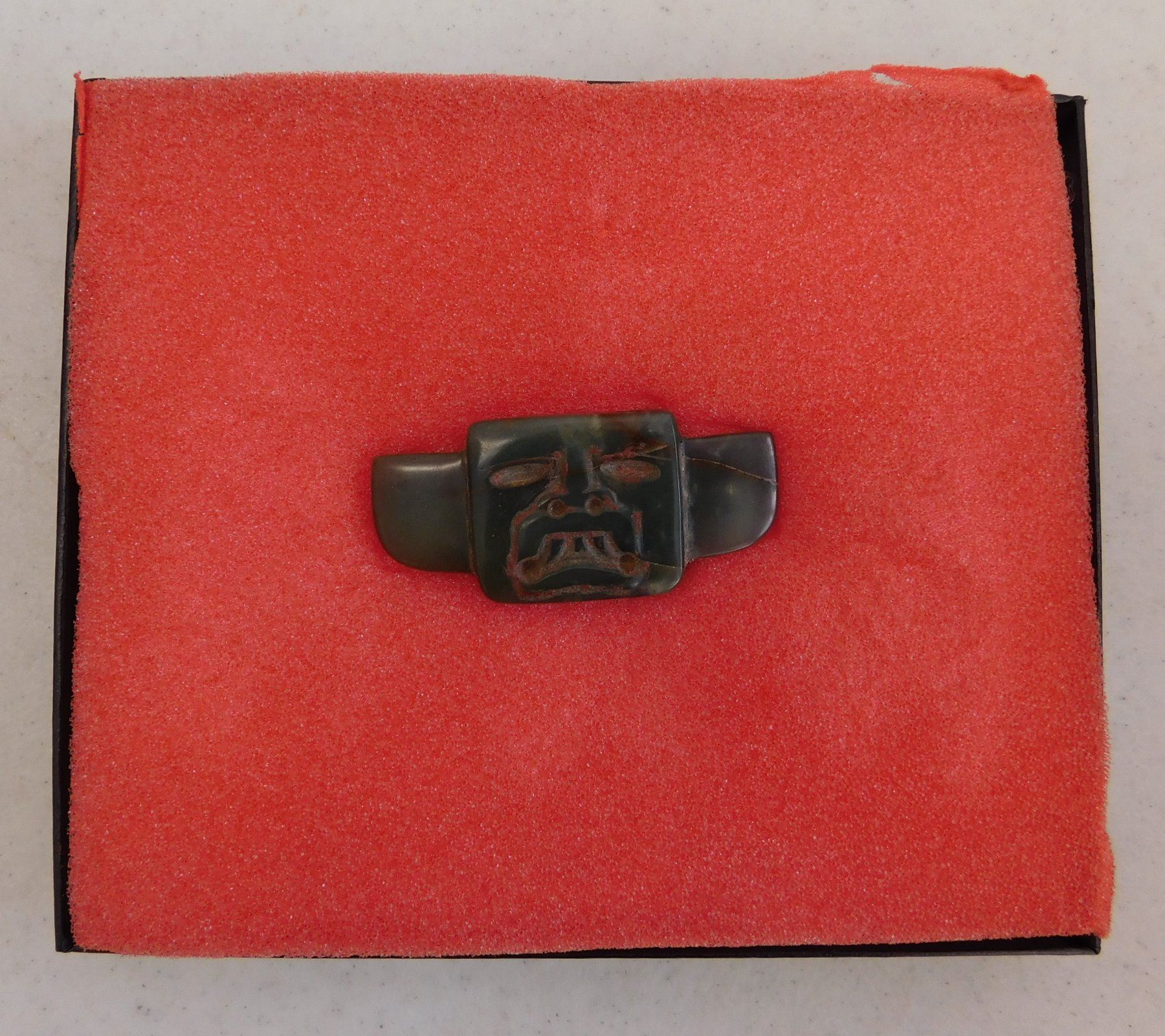 Olmec Winged Maskette, pre-Columbian item. Made of jade, the stone item measures 2 1/4" x 1" x 1/4". Veracruz, Mexico. Translucent jade. Frame not included. From an old, 1960s California collection. Condition: Very good, see images. Shipping: $15.50 w/insurance and signature, due to value.
