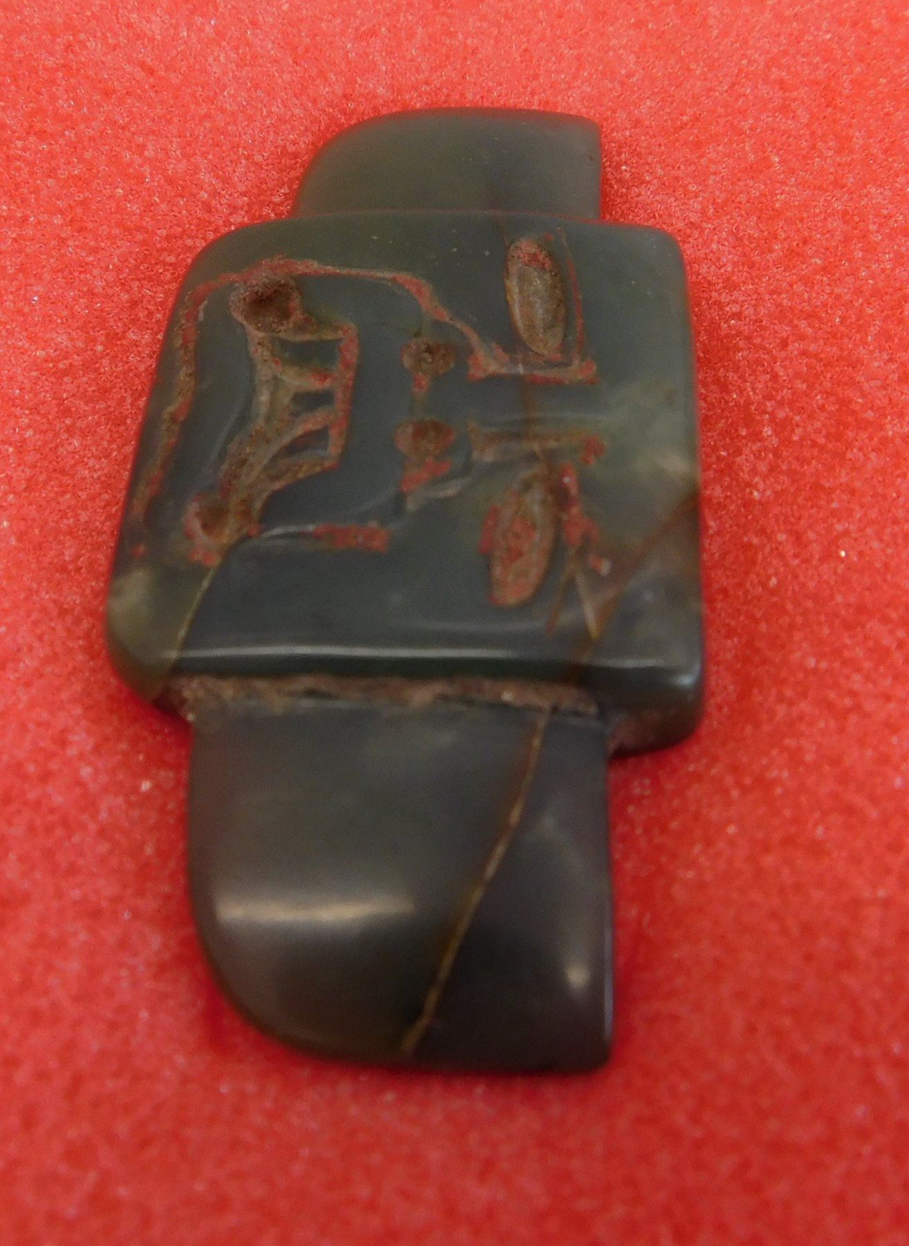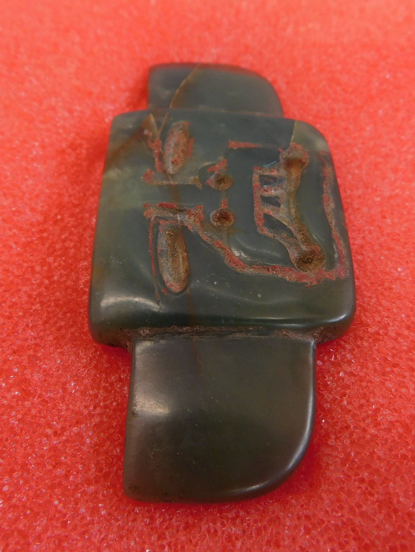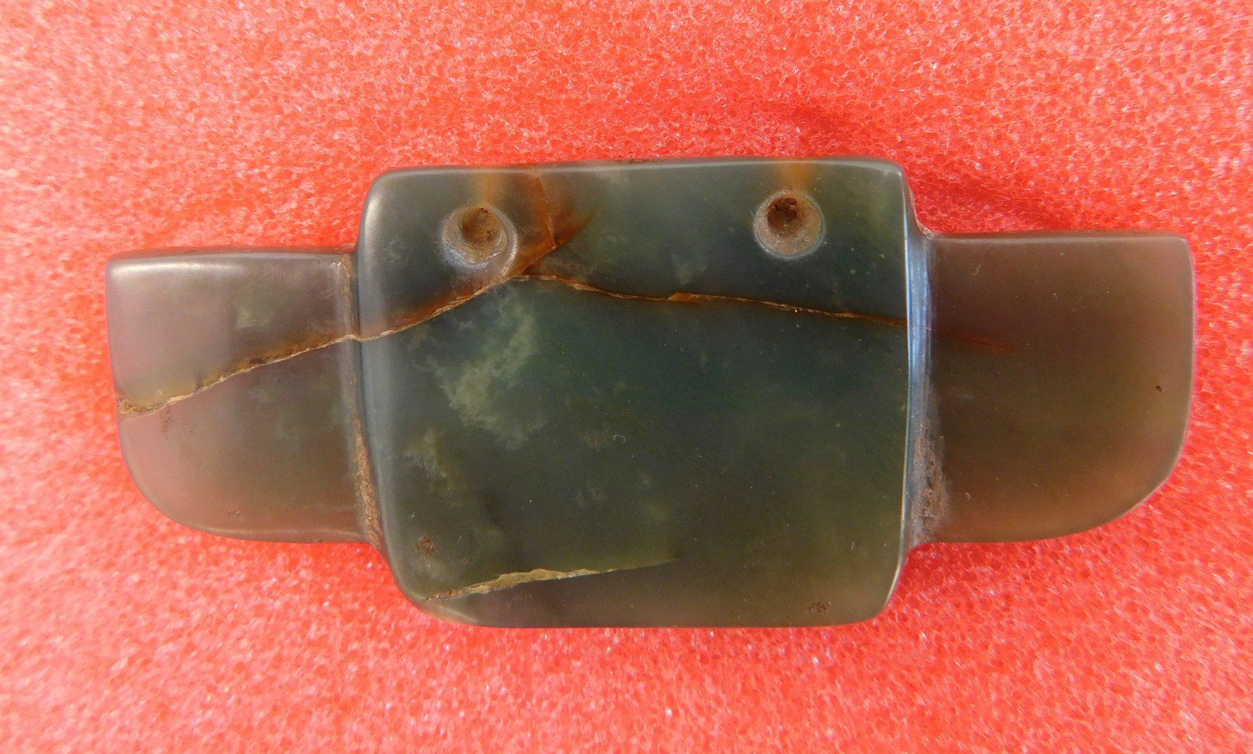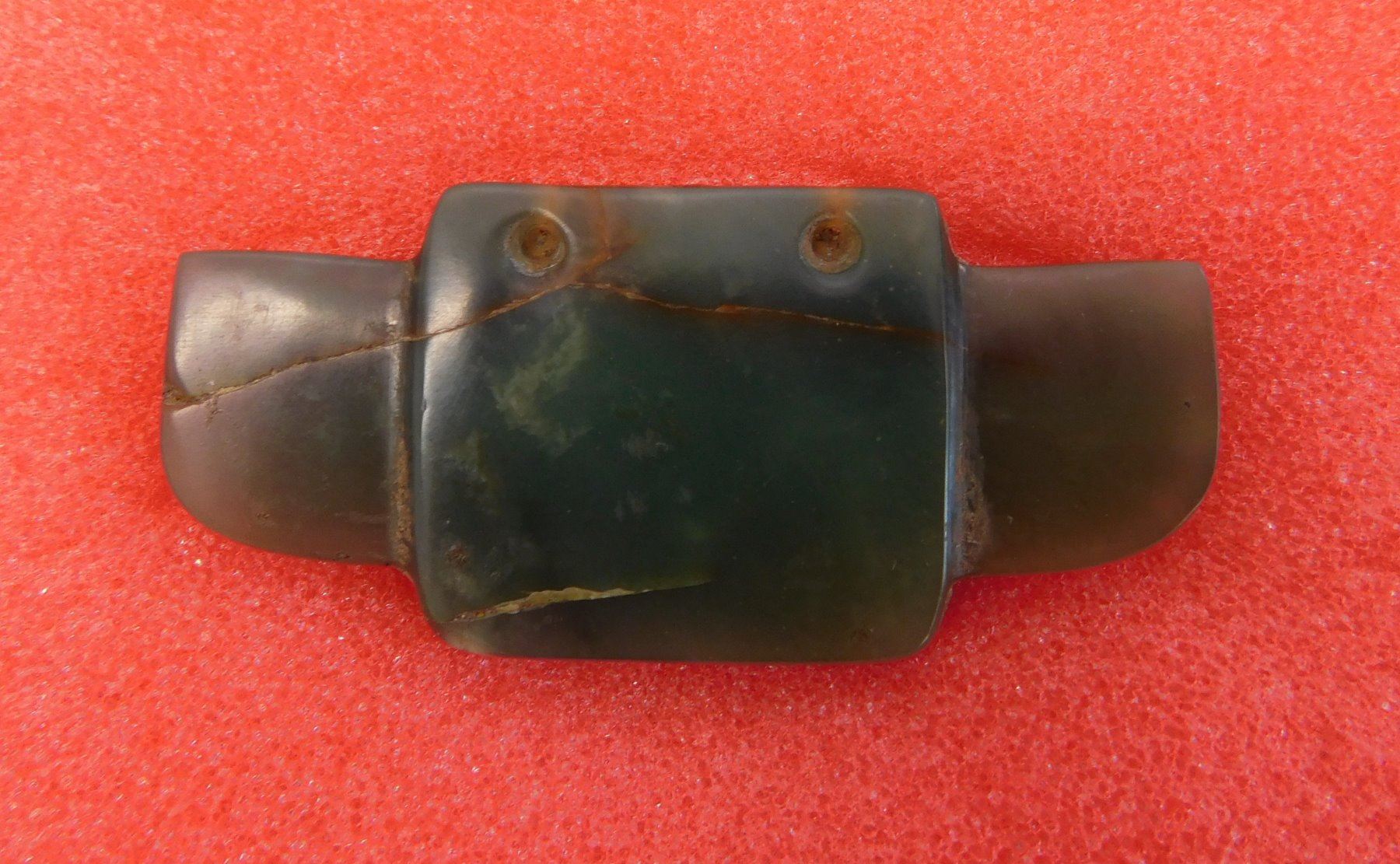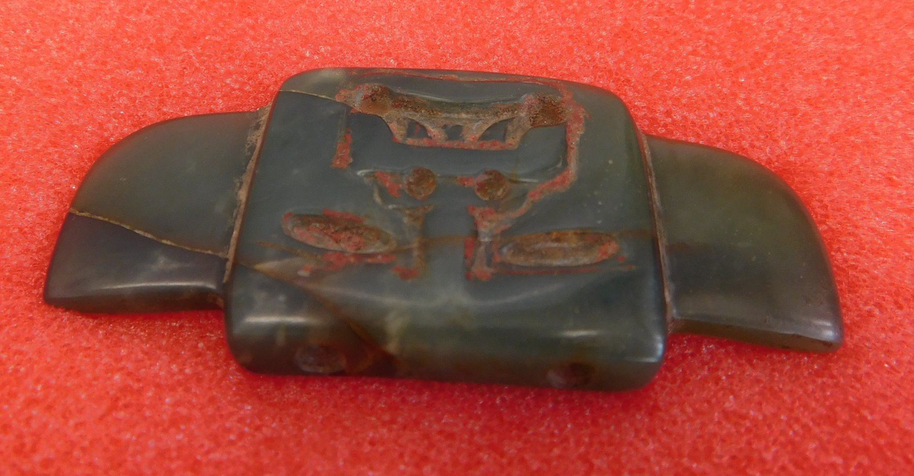Olmec Winged Maskette, pre-Columbian item. Made of jade, the stone item measures 2 1/4" x 1" x 1/4". Veracruz, Mexico. Translucent jade. Frame not included. From an old, 1960s California collection. Condition: Very good, see images. Shipping: $15.50 w/insurance and signature, due to value.