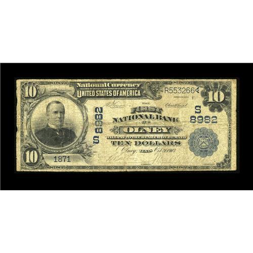 <B>Olney, TX</B></I> - $10 1902 Plain Back Fr. 626 <B>The First NB</B></I> Ch. # (S)8982<BR>This is a tough bank that has evaded many collectors. Officers are M.D. Wolverton and Wright McClatchy. Mr. McClatchy also served this bank as cashier and vice president. <B>Very Good.</B></I>
