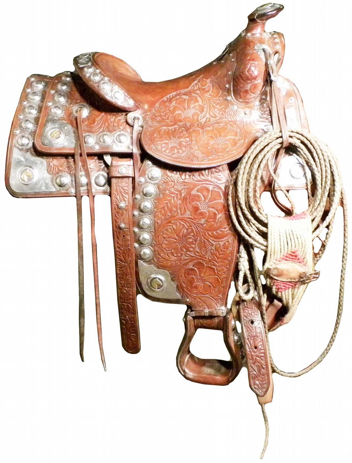 Olsen-Nolte Parade Saddle. Custom made for P. Hausen, San Francisco, Calif. Sterling Silver and Gold trim with brown tooled leather. Excellent condition.