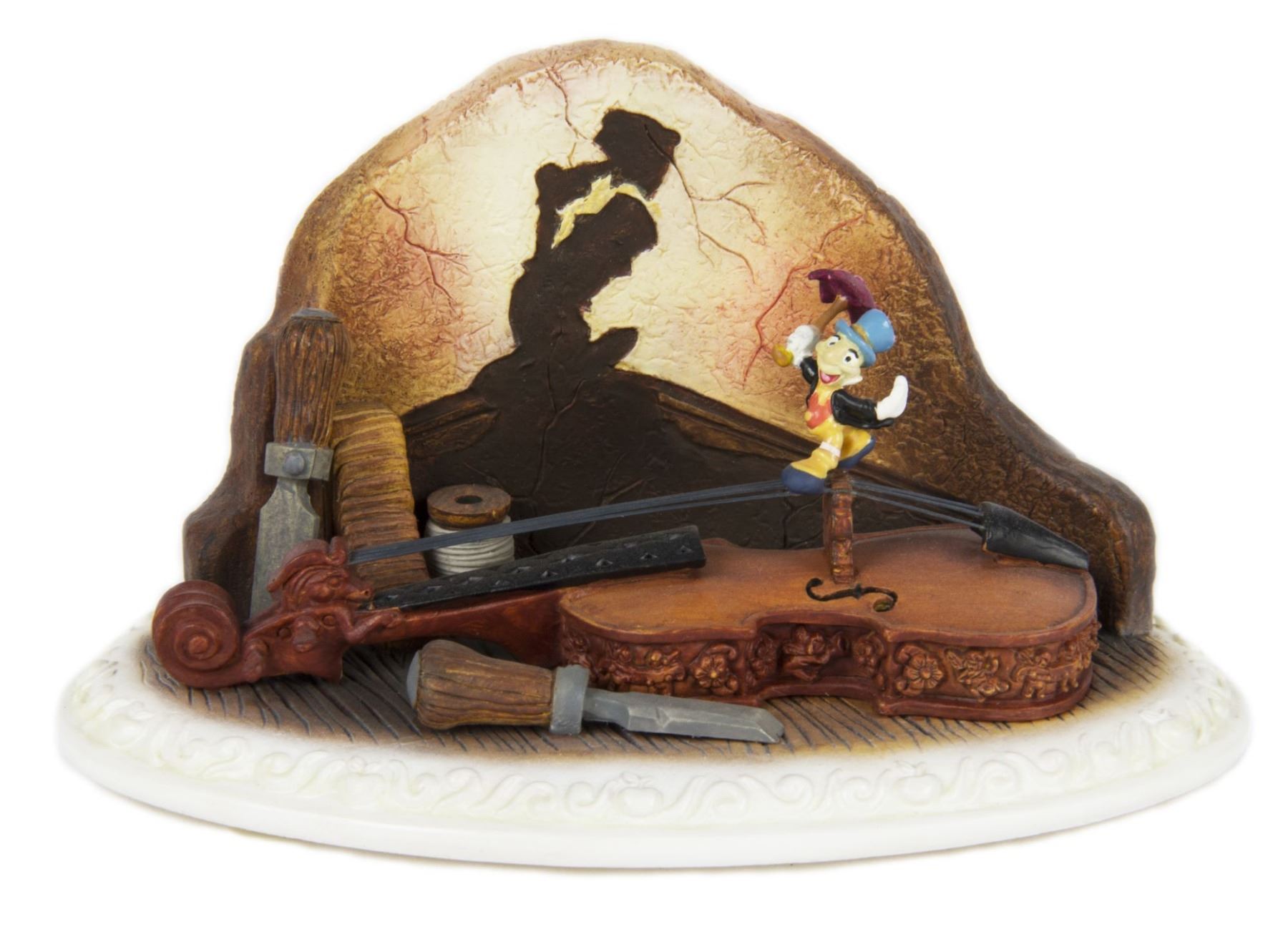 (Olszewski, 2002) A very rare figurine created by renowned miniaturist Robert Olszewski. Titled "Anytime you Whistle," this figurine of Jiminy Cricket was created as number 106 in an edition of only 3,250. Measuring approximately 3"x5" and 2.5" tall, the figurine is in very good condition with minor wear from previous display. The figurine comes with its original box and Certificate of Authenticity, however the box has some moisture damage that has not affected the figurine.