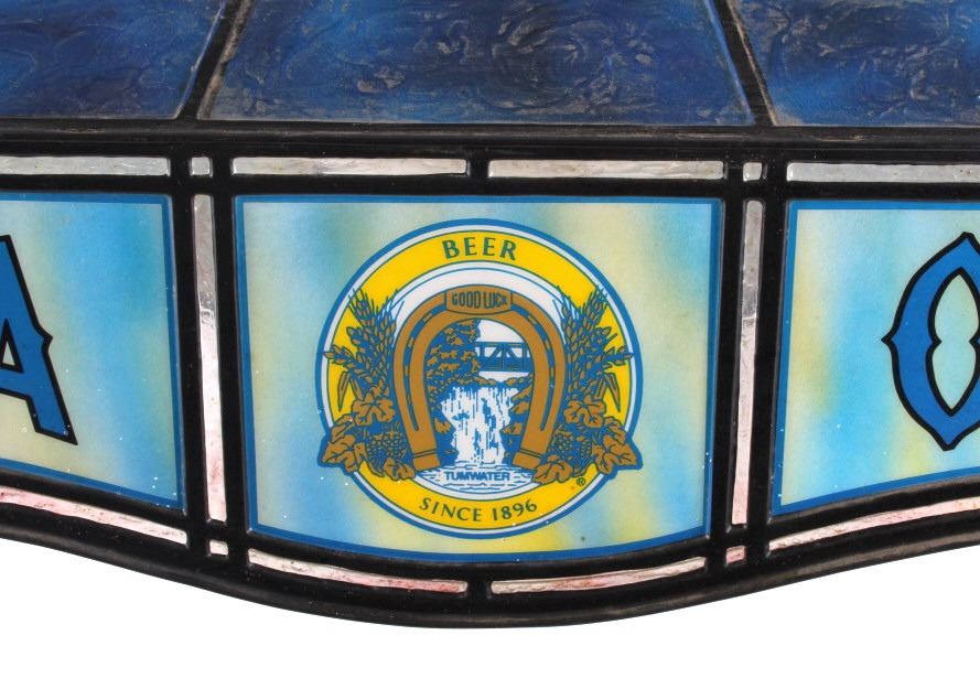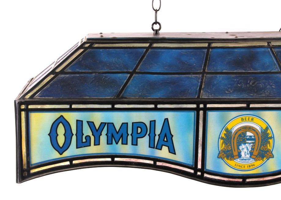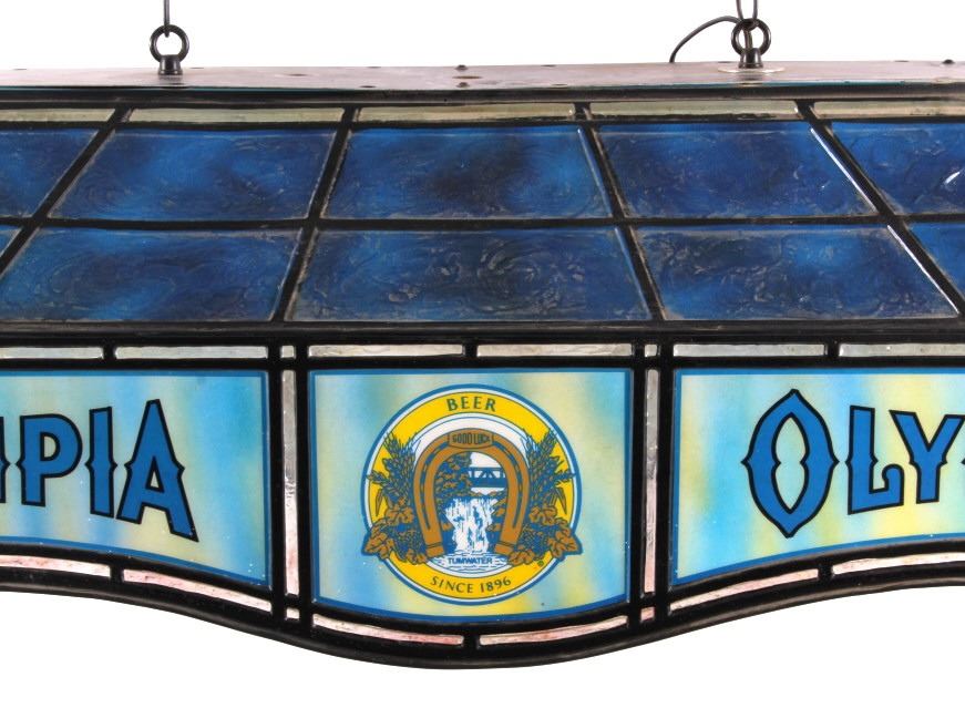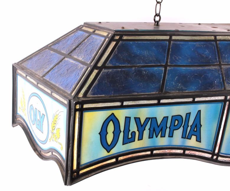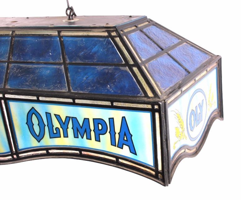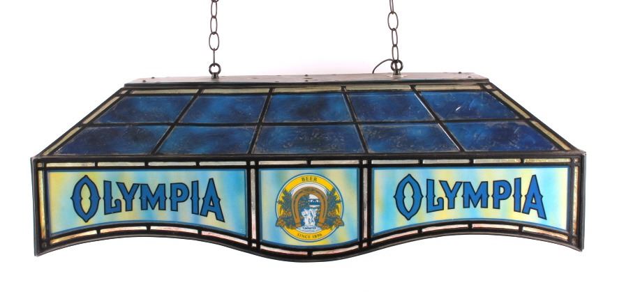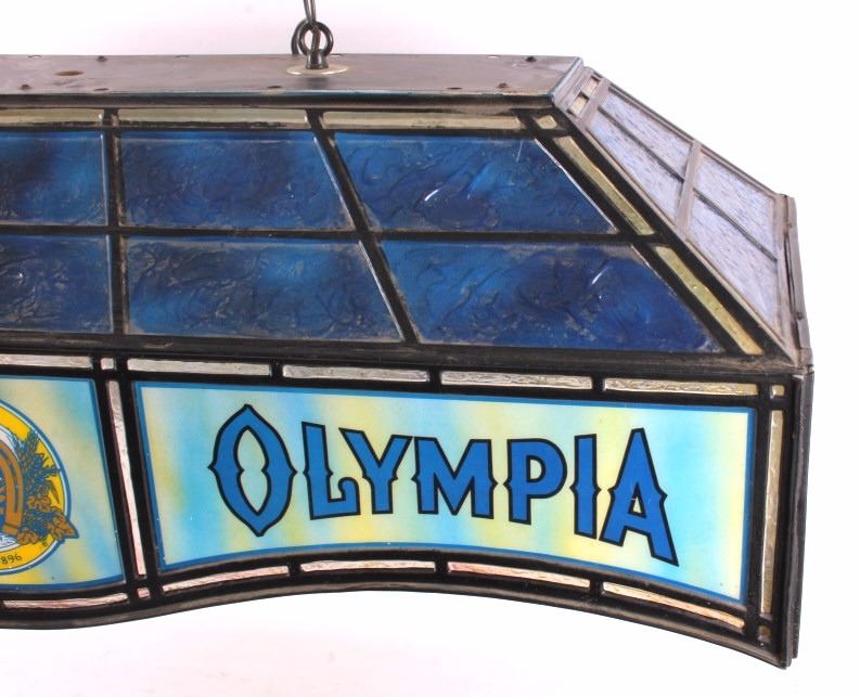 This is an Olympia Beer billiard light. The light shows a simulated stained glass design that incorporates the Olympia logo and stylized lettering. The Olympia billiard light is in good condition and works well. It measures 16" x 37".
