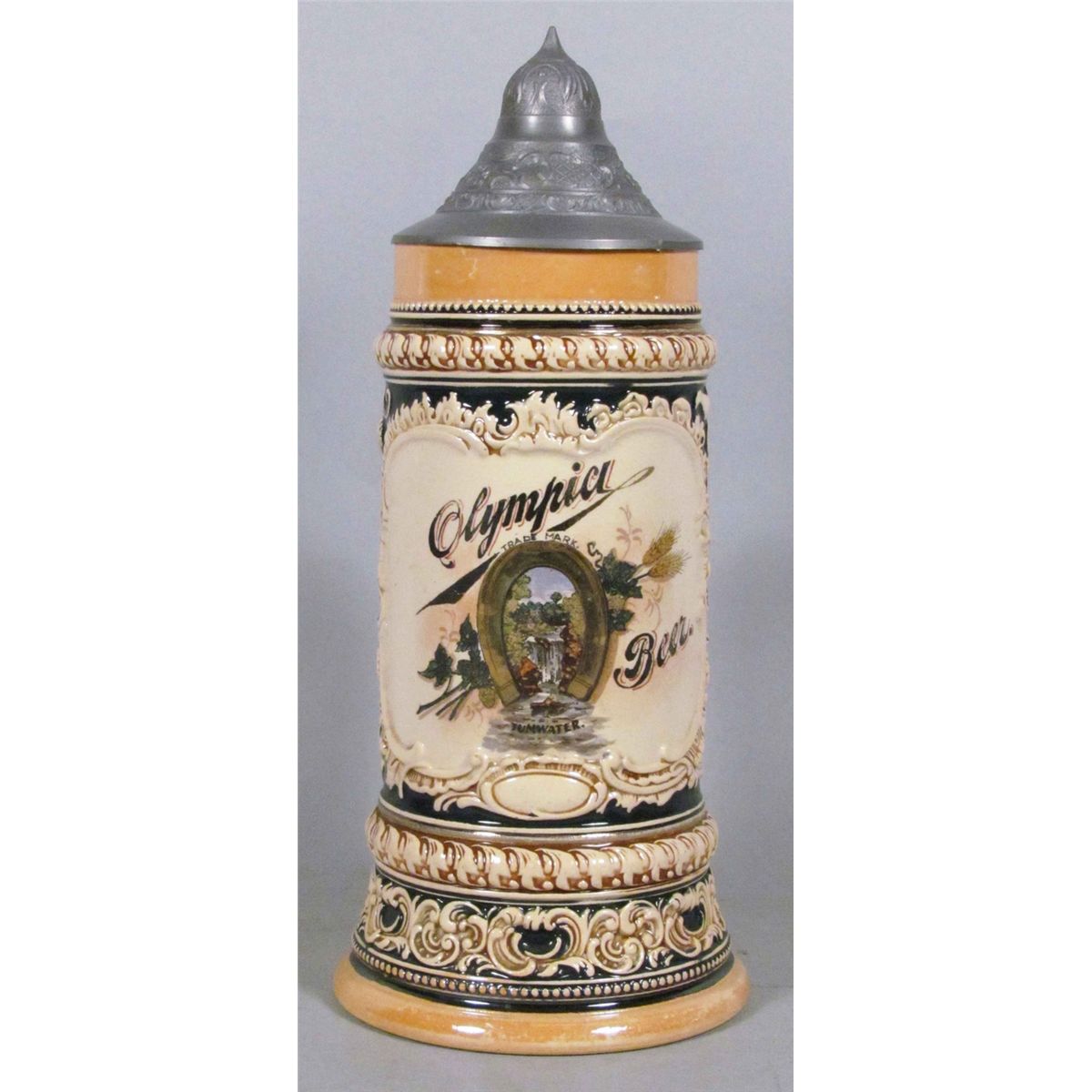 Olympia Beer Embossed Ceramic Lidded Beer Stein. No chips or cracks, excellent condition. 10 inches tall. Start Price $50