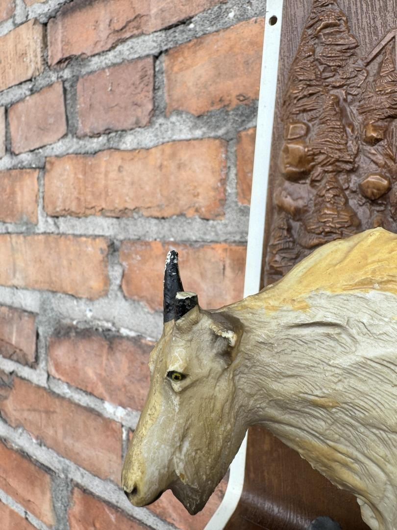 One horn is chipped. 15 1/2" by 8 7/8" by 5 5/8".