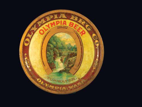 Olympia Beer Tin Serving Tray, Olympia Brewing Co., Olympia, WA, some rust, stains and dents, fair condition, 12 inch diameter