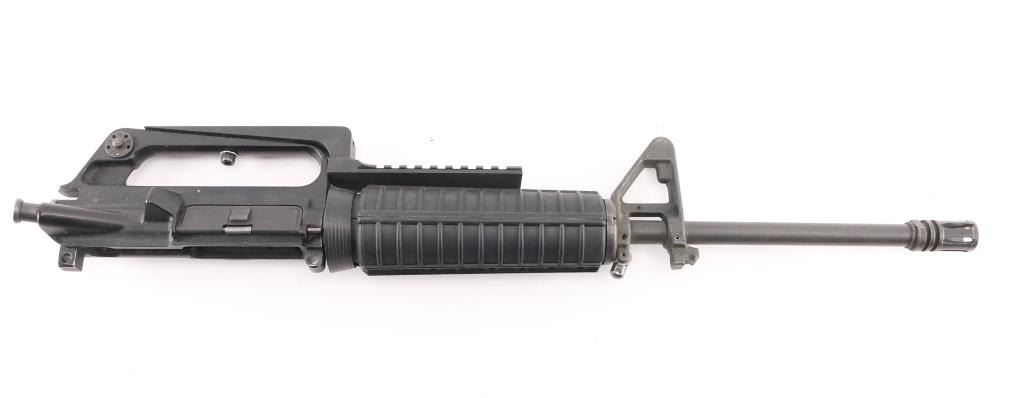 'Pre-ban' AR-15 pattern semi-automatic modern sporting rifle upper receiver, chambered in 5.56x45mm NATO. Features a parkerized/black finish, 16" chrome bore barrel, A1 bird cage flash hider, adjustable shrouded post front sight with bayonet lug on the base, A1 flip-up 'L' dual aperture rear sight in the carrying handle, two-piece A2 handguard, A2 handguard slip ring, carry handle upper receiver with dust cover, A2 forward assist and brass deflector, front sling swivel. No BCG or charging handle. Retains approximately 95% finish showing some scuffs and nicks, some thinning with minor edge wear. Bore is excellent. Condition is NRA Very Good. ***Modern Firearm***