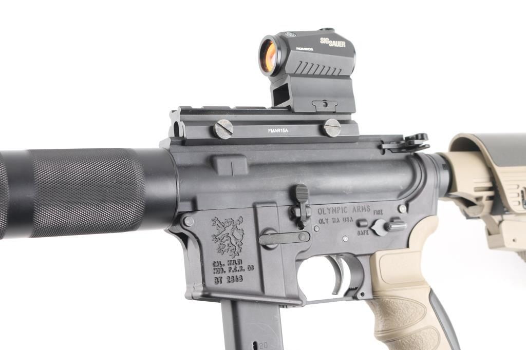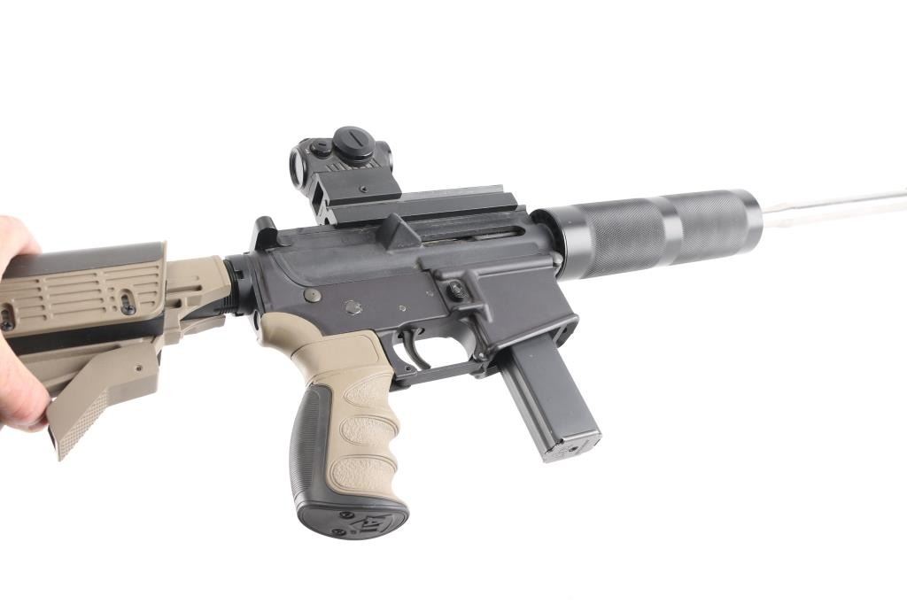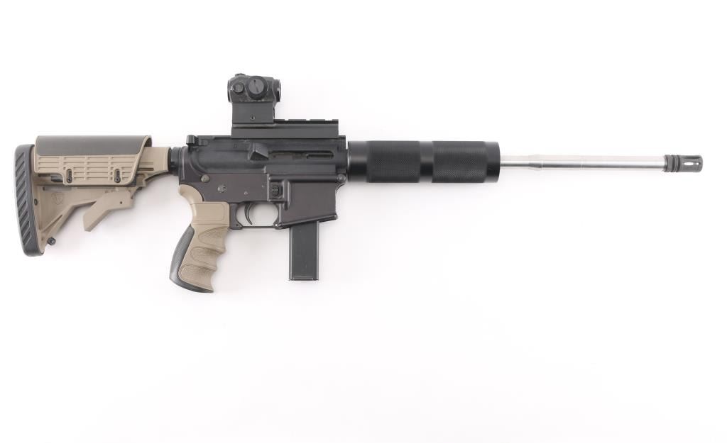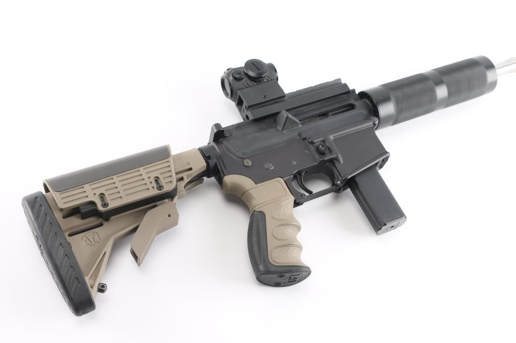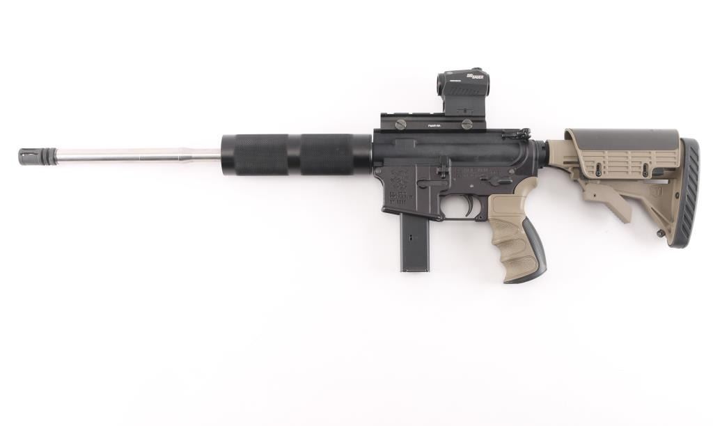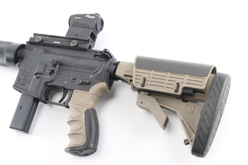 Politically Correct Rifle Blow back-operated semi automatic AR-style rifle chambered in 9mm NATO. Features a matte black finish, 16" PSA stainless steel free floating barrel with a black birdcage muzzle, 1:7 twist, black anodized round handguard, top receiver flat-top mounting a Sig Sauer Romeo5 red-dot sight, shell deflector, AR Stoner (Colt pattern) 20 round magazine, manual safety, ATI FDE/black colored rubber finger grooved pistol grip and retractable stock with adjustable cheek riser and butt pad. Rifle exhibits approximately 90% finish with some small scratches on upper receiver. Bore is bright with strong rifling. Stocks are very good. Red-dot sight is clear and will not turn on.NRA condition is very good+ .***Modern Firearm***