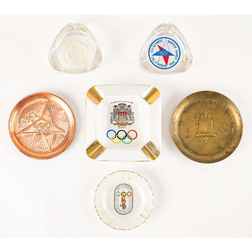 Six souvenir ash trays from various Olympic Games, ranging in size 3Ë to 5Ë across, made from ceramic, metal, and glass. Includes: Berlin 1936 Summer Olympics (two different), Melbourne 1956 Summer Olympics, Squaw Valley 1960 Winter Olympics (two different), and Mexico 1968 Summer Olympics.